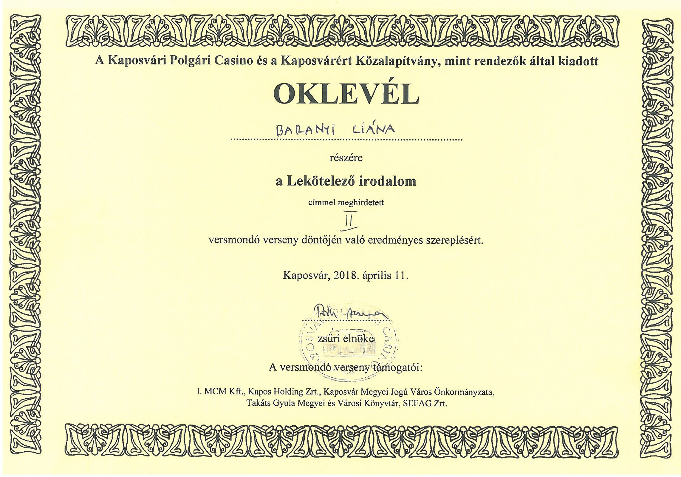 A Kaposvári Polgári Casino április 11-én, a magyar költészet napján hagyományosan versmondó versenyt szervez. A rendezvényre egész Somogy megyéből érkeznek a versszerető középiskolások és felnőttek. Az idei verseny legidősebb résztvevője kilencvenéves volt. A Marcali Berzsenyi Dániel Gimnáziumot Baranyi Liána (9. E), Kiss Barbara és Nagy Kata (11. E) képviselte. Nagy örömünkre Lia a rangos versenyen második helyezést ért el. A lányok meghívást kaptak a Kaposvári Polgári Casino ünnepi díjátadó rendezvényére.