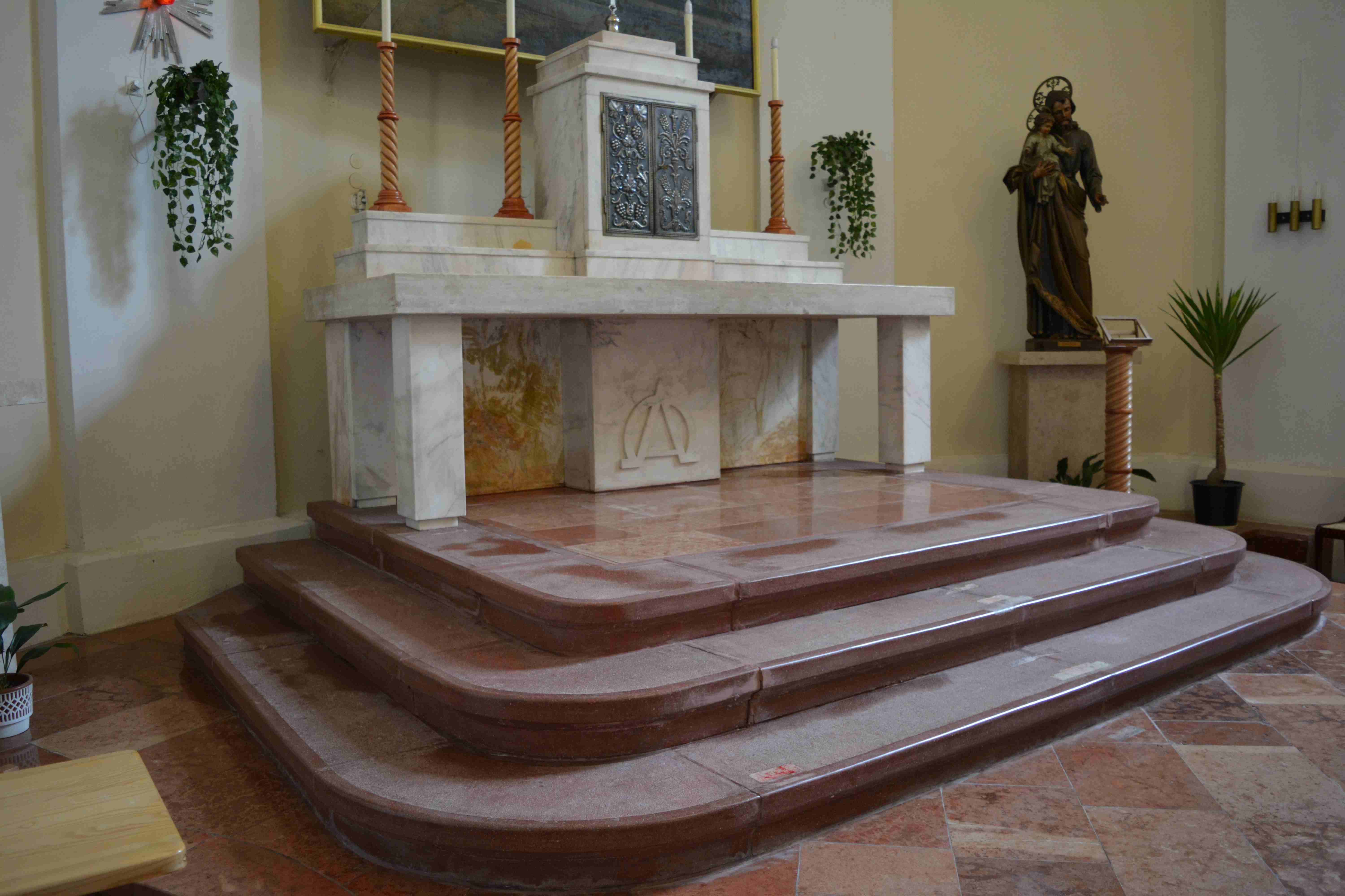 A templom története során a belső liturgikus tér – illetve a padlózat – mindössze két alkalommal lett megújítva. Az első komolyabb beruházás Kőszeghy Antal esperes-plébános (1930-1963) idejében éppen egybeesett a jubileumi, 1938-as Szent István évvel és az Eukarisztikus Kongresszussal. A régi faoltár helyett egy új márványoltárt épített Domján Lajos építőmester, melynek a terveit Krasznai Lajos budapesti szobrászművész készítette özvegy Darázs Józsefné és a hívek adományából. Ehhez megfelelő magasságú lépcsős talapzatot (vörös mészkőből) is építtetett a plébános, amely a régi fa dobogókat váltotta fel. A tabernaculum ajtaját Hikman Béla marcali műlakatos mester készítette ingyen. Az új oltárt 1938. augusztus 28-án dr. Simon György püspöki helynök, prelátus, kanonok szentelte fel ünnepi keretek között. A szent olajjal való megkenés helyei ma is jól láthatók az oltáron, amiket kis keresztek jelzik. A plébánia levéltárából előkerült dokumentumokból tudjuk, hogy Szent Viktor és Szent Orbán vértanúk ereklyéit helyezték el az oltárban.