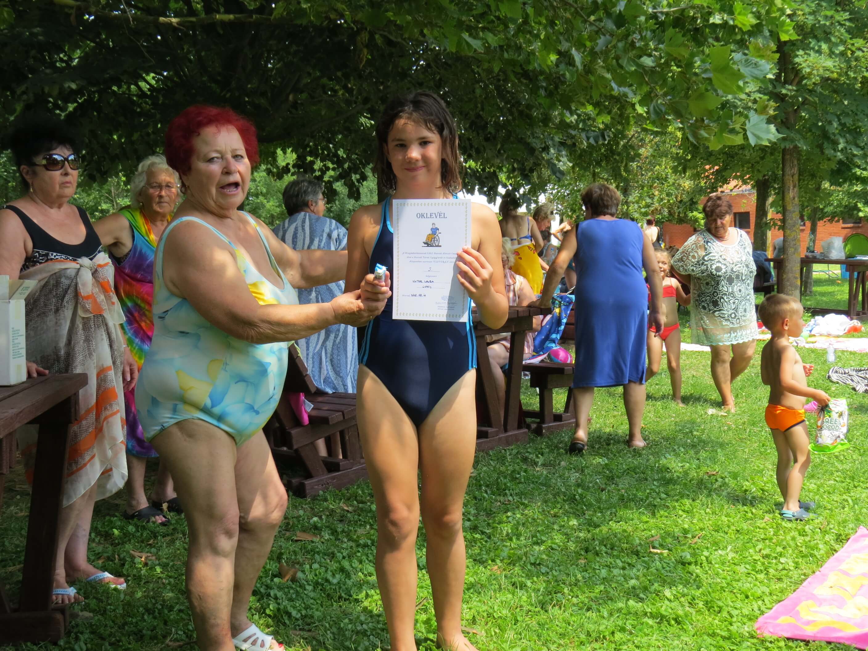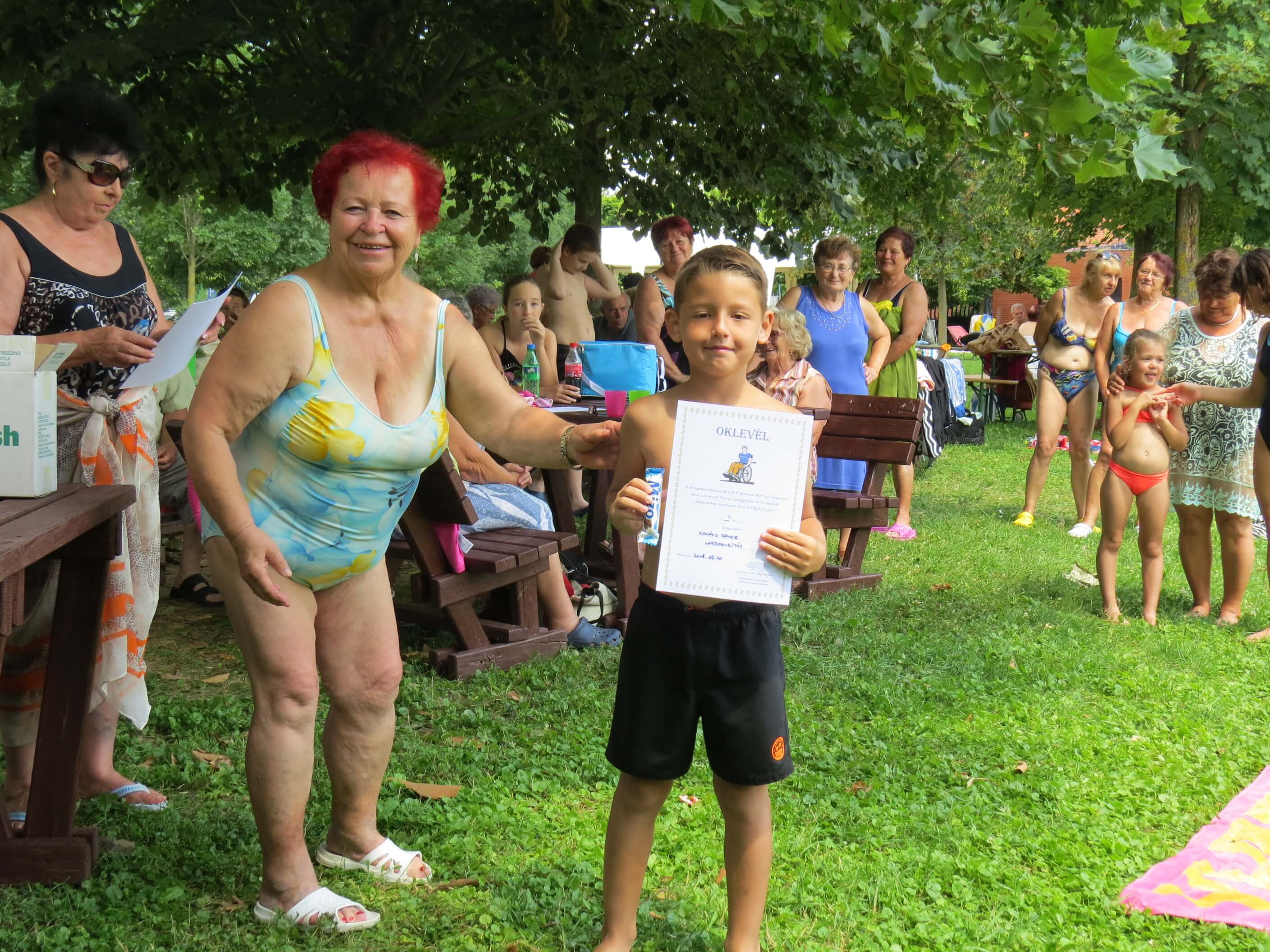 A próbatételekben megfáradt versenyzők túró rudit kaptak a küzdelemben elhasznált energia pótlására és 20 oklevelet is kiosztottunk a kiemelkedő teljesítmények elismeréseként. A díjátadások után kötetlen pihenés, napozás és aktív regenerálódás következett a gyógyvizes és úszómedencékben egyaránt. Az egész napos program végig vidáman és kellemes, baráti hangulatban telt, melyhez tagjaink saját készítésű süteményekkel, pogácsákkal és gyümölcsökkel járultak hozzá.