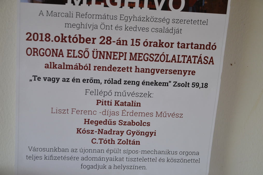 Vasárnap délután megszólalt a Marcali Református Egyházközség újonnan épült sípos-mechanikus orgonája. A hangverseny szólistája Pitti Katalin Liszt Ferenc-díjas Érdemes művésznő volt. A délután fényét emelete Hegedűs Szabolcs, Kósz-Nadray Gyöngyi és C. Tóth Tamás felejthetetlen játéka is.
