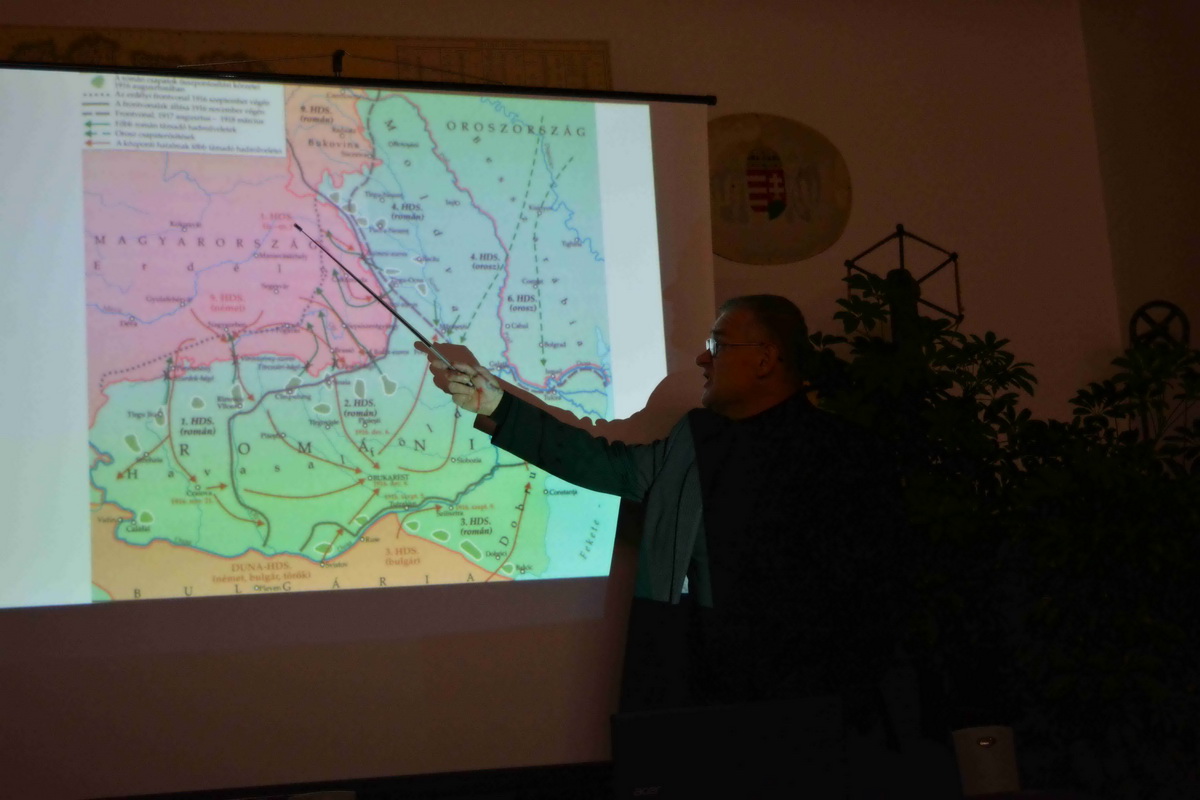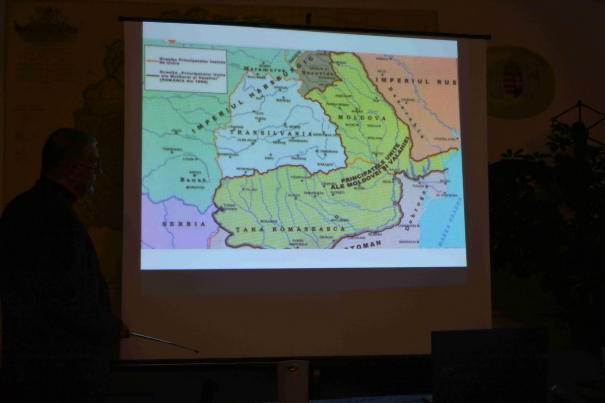 Az érdeklődőket Szaka Zsolt, az Ipartestület elnöke köszöntötte, majd bevezetője után Forgó Ferenc tartott előadást „Erdély elrablásának 100. évfordulója alkalmából”. Az előadó először részletesen bemutatta – különböző térképek alapján – a román eredettörténetet, külön kitért az ún.dákorománelméletre is. Ismertette a területi változásokat, szerepüket az egykori Magyar Királyság területén. Ezután kitért az önálló állam megalakulására, és a román politikai törekvésekre, Erdély etnikai változásaira. Románia jóllehet az Osztrák-Magyar Monarchia és Németország szövetségese volt eredetileg, az első világháború idején mégis az antant hatalmak oldalán lépett be a küzdelmekbe. A központi hatalmak azonban rövid időn belül térdre kényszerítették a román hadsereget, Romániát pedig elfoglalták, különbékére kényszerítették. Egy nappal az általános fegyverszünet előtt a Román Királyság aztán ismét belépett a világháborúba, ezzel bebiztosította magát a győztesek oldalán, így a nemzetközi politikai színtéren utóbb mégis sikerült az érdekeik nagy részét érvényesíteniük a Nagy Háborút követően.Az antant végül nem is gördített akadályt I. Ferdinánd (ur. 1914-1927) országának érdekérvényesítése elé, és a továbbiakban is eltűrték keleti szomszédunk jogsértő viselkedését.Ennek folyományaként 1918. december 1-jén tartották meg a magyarországi románok a gyulafehérvári nemzetgyűlést, ahol a megjelent 1228 küldött kinyilvánította azon szándékát, hogy Erdély, a Körösök vidéke, Bánát és Máramaros – összesen tehát 26 történelmi vármegye – csatlakozzon a Román Királysághoz. Bár a románok döntése később „hivatalosan” megfelelt a wilsoni elveknek, a valóságban az elszakadás egyoldalú határozat eredménye volt, mely az erdélyi magyarságot teljesen megfosztotta az önrendelkezés jogától.