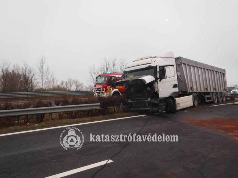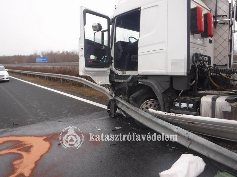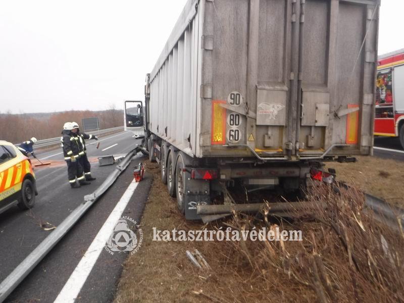 Az autópálya 128-as kilométerszelvényénél, Balatonőszöd térségében, a Budapest felé vezető oldalon történt a baleset kedd délelőtt. A siófoki hivatásos tűzoltók áramtalanították a járművet, majd ledarabolták a szalagkorlátot, hogy a sérült vontatót el tudják szállítani. A mentők újraélesztették a kamion vezetőjét, akit mentőhelikopterrel szállítottak kórházba.