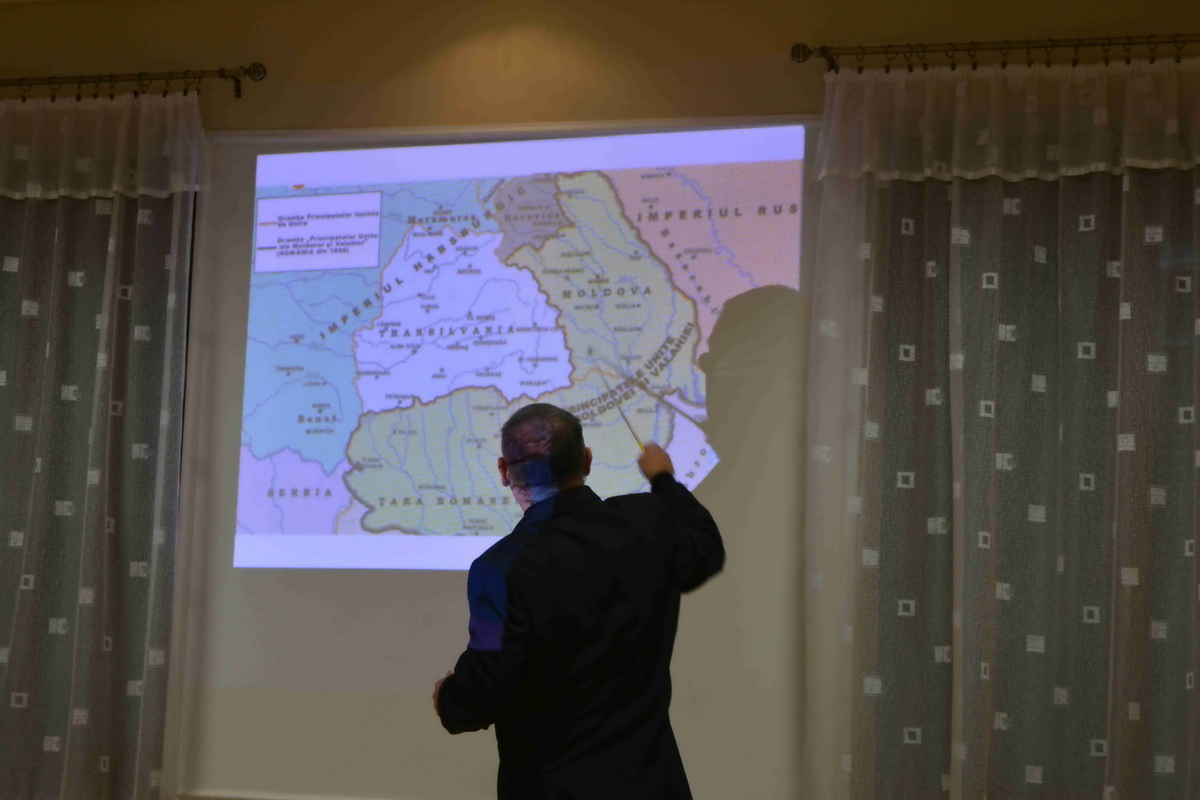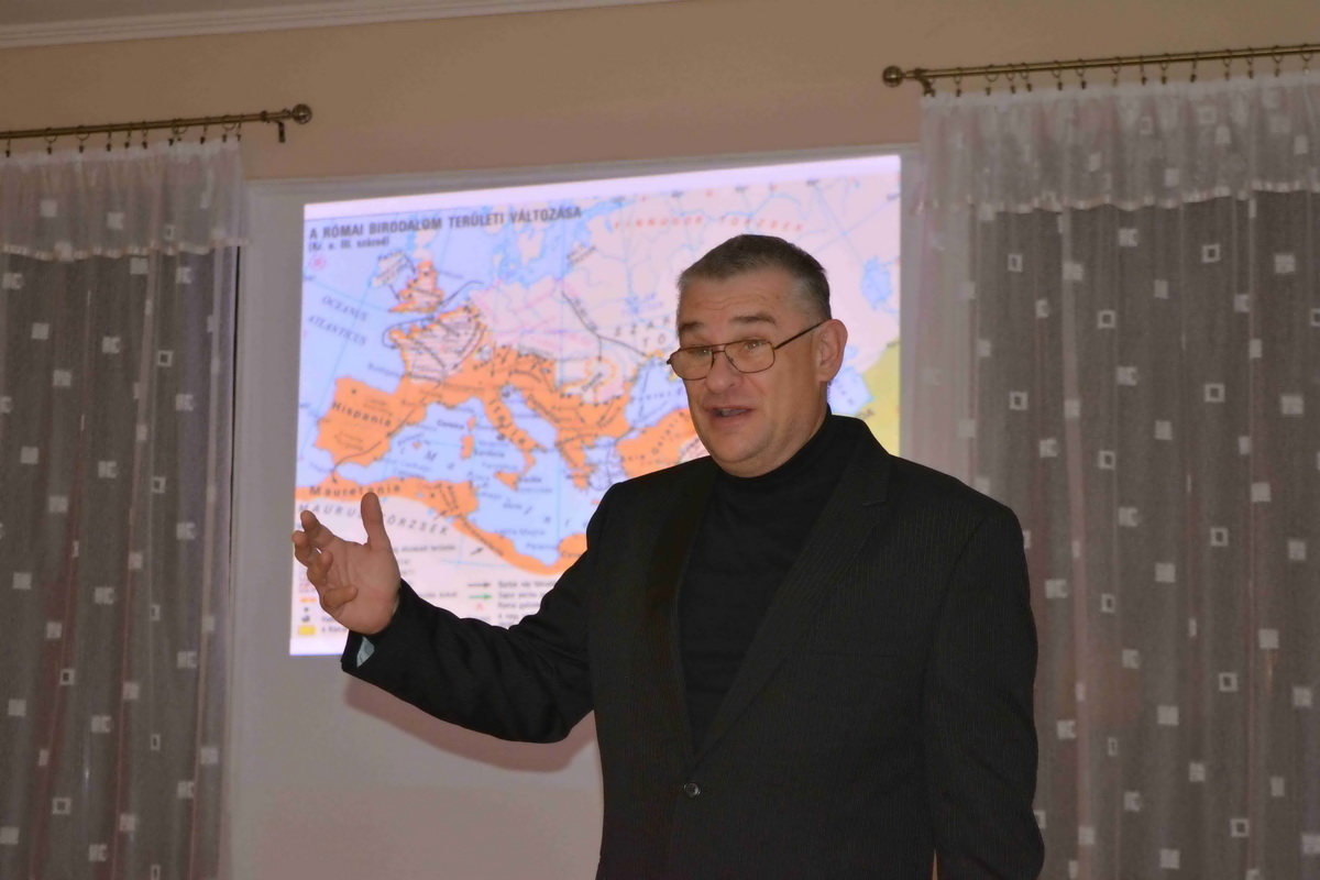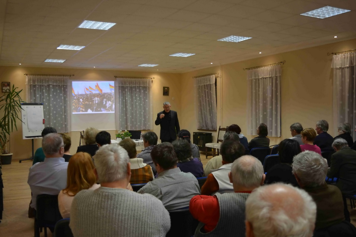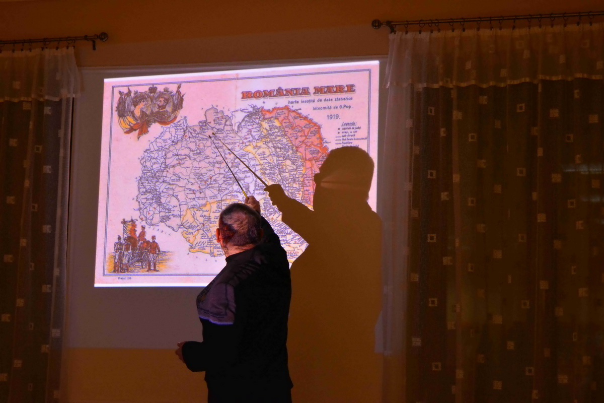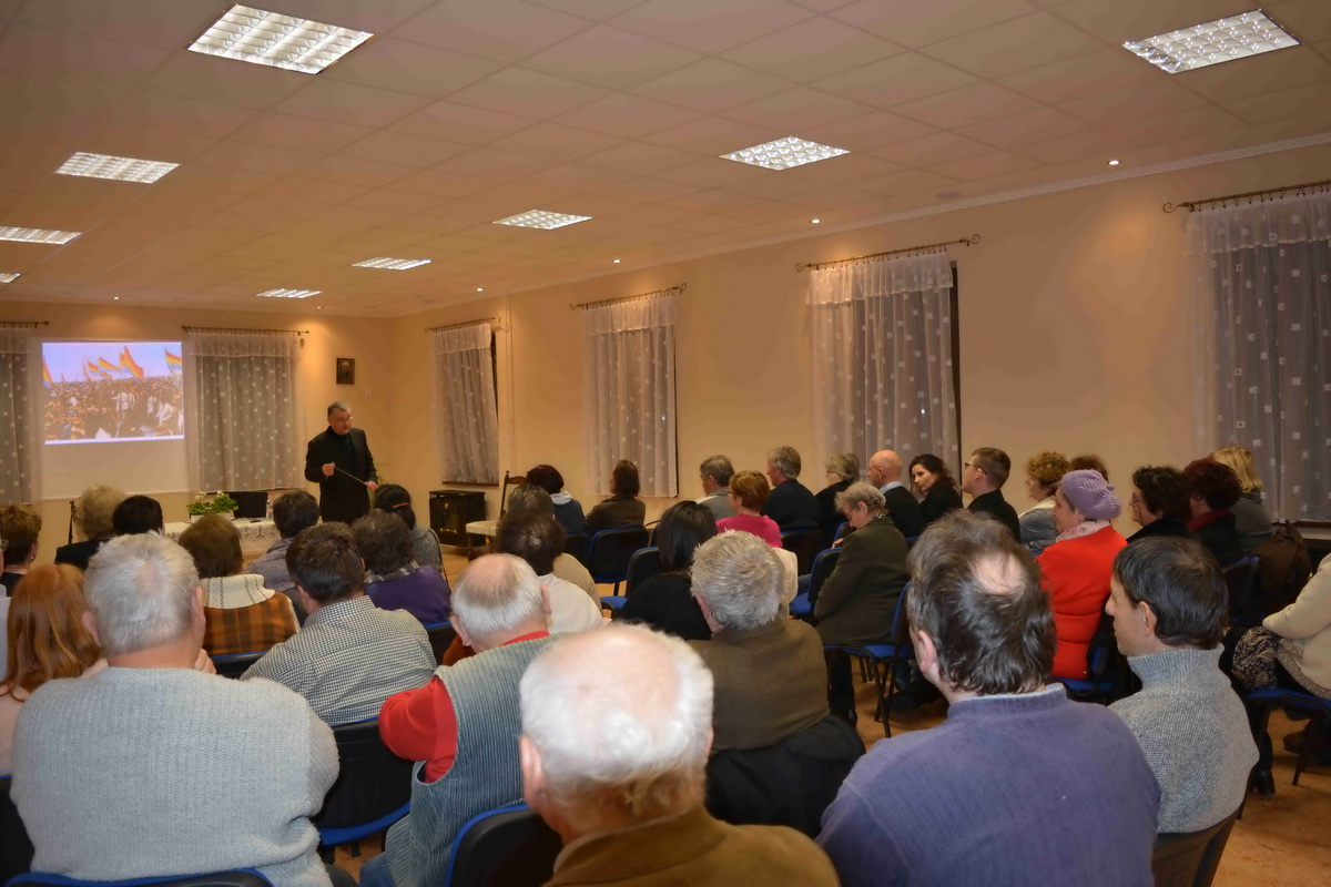 A megjelenteket Kiss Kálmán titkár köszöntötte, majd Forgó Ferenc vette át szót, akit a közönség már jól ismer eddigi tevékenysége kapcsán. Az előadó különböző külföldi térképek alapján felidézte a román eredettörténetet és a valós tényeket. Ismertette a területi változásokat és röviden kitért az önálló állam megalakulására, a politikai törekvésekre, Erdély etnikai változásaira. Románia eredetileg az Osztrák-Magyar Monarchia és Németország szövetségese volt mégis az első világháború alatt az antant oldalára állt. A központi hatalmak azonban rövid időn belül térdre kényszerítették és különbékére kényszerítették. Egy nappal az általános fegyverszünet előtt a Román Királyság végül ismét belépett a világháborúba, ezzel bebiztosította magát a győztesek oldalán, és a nemzetközi politikai színtéren is az érdekeik nagy részét sikerült érvényesíteniük. 1918. december 1-jén tartották meg a magyarországi románok a gyulafehérvári nemzetgyűlést, ahol a megjelent 1228 küldött kinyilvánította azon szándékát, hogy Erdély, a Körösök vidéke, Bánát és Máramaros – összesen tehát 26 történelmi vármegye – csatlakozzon a Román Királysághoz. Bár a románok döntése később „hivatalosan” megfelelt a wilsoni elveknek, a valóságban az elszakadás egyoldalú határozat eredménye volt, mely az erdélyi magyarságot teljesen megfosztotta az önrendelkezés jogától. Majd Trianonban olyan határvonalat húztak, amely több mint 1,5 millió magyar honfitársunkat kényszerített idegen uralom alá. Sajnos a román politika irányvonala azóta sem sokat változott ebben a kérdésben.