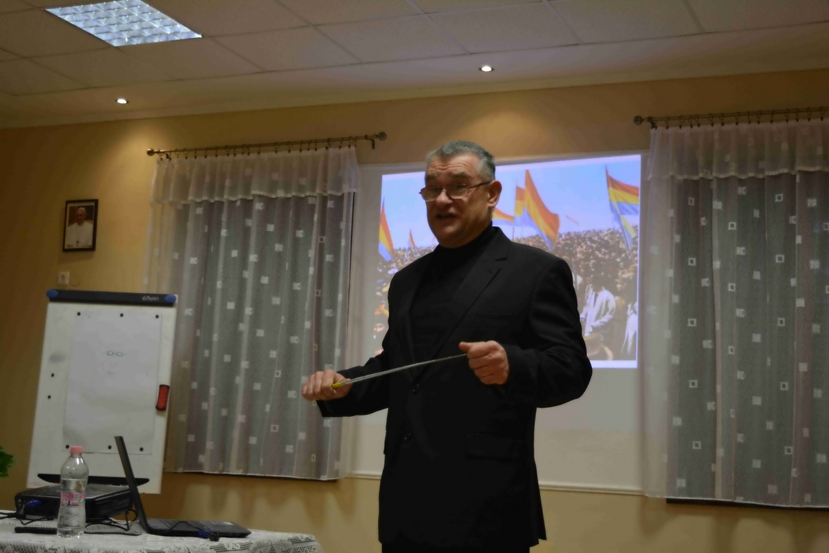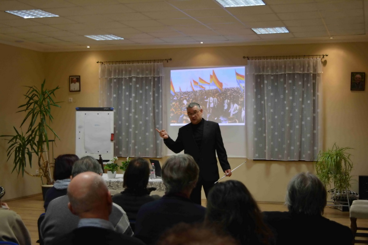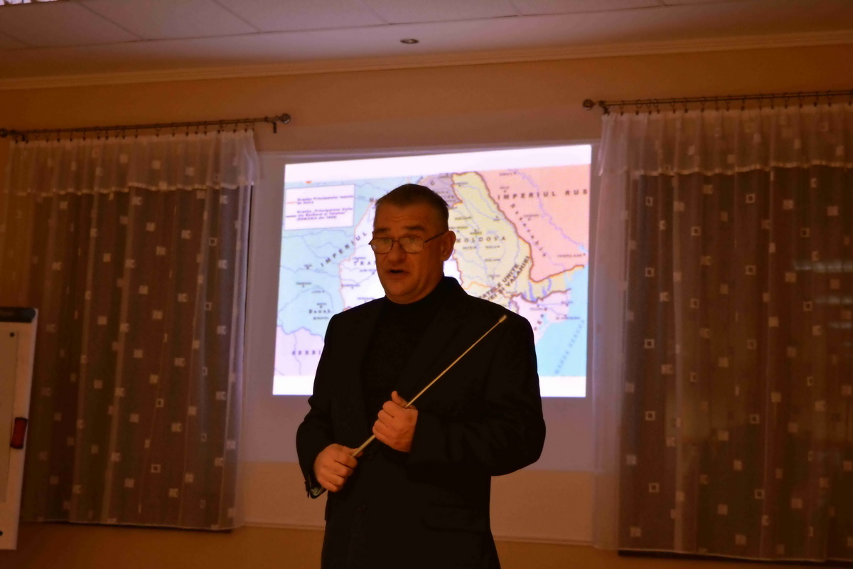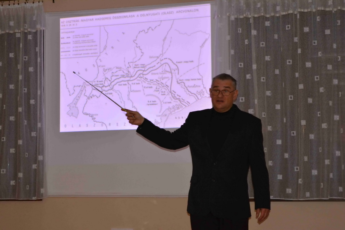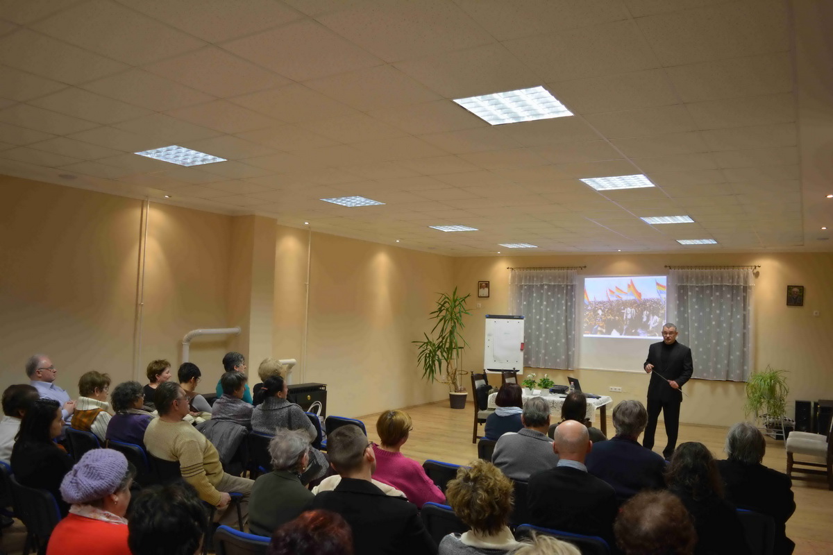 A megjelenteket Kiss Kálmán titkár köszöntötte, majd Forgó Ferenc vette át szót, akit a közönség már jól ismer eddigi tevékenysége kapcsán. Az előadó különböző külföldi térképek alapján felidézte a román eredettörténetet és a valós tényeket. Ismertette a területi változásokat és röviden kitért az önálló állam megalakulására, a politikai törekvésekre, Erdély etnikai változásaira. Románia eredetileg az Osztrák-Magyar Monarchia és Németország szövetségese volt mégis az első világháború alatt az antant oldalára állt. A központi hatalmak azonban rövid időn belül térdre kényszerítették és különbékére kényszerítették. Egy nappal az általános fegyverszünet előtt a Román Királyság végül ismét belépett a világháborúba, ezzel bebiztosította magát a győztesek oldalán, és a nemzetközi politikai színtéren is az érdekeik nagy részét sikerült érvényesíteniük. 1918. december 1-jén tartották meg a magyarországi románok a gyulafehérvári nemzetgyűlést, ahol a megjelent 1228 küldött kinyilvánította azon szándékát, hogy Erdély, a Körösök vidéke, Bánát és Máramaros – összesen tehát 26 történelmi vármegye – csatlakozzon a Román Királysághoz. Bár a románok döntése később „hivatalosan” megfelelt a wilsoni elveknek, a valóságban az elszakadás egyoldalú határozat eredménye volt, mely az erdélyi magyarságot teljesen megfosztotta az önrendelkezés jogától. Majd Trianonban olyan határvonalat húztak, amely több mint 1,5 millió magyar honfitársunkat kényszerített idegen uralom alá. Sajnos a román politika irányvonala azóta sem sokat változott ebben a kérdésben.