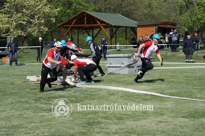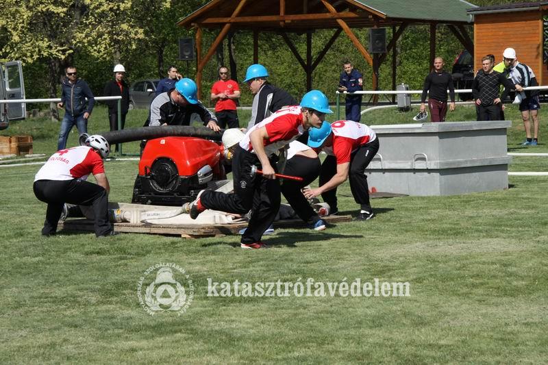 A sportpályán rajthoz álló tizenkét csapat kétszer szerelte meg a percenként ezerkétszáz liter vizet átengedő kismotorfecskendőhöz csatlakozó alapvezetéket és az osztott sugarat, amelynek vízellátását egy egy köbméteres versenykádból, szívótömlővel biztosították.