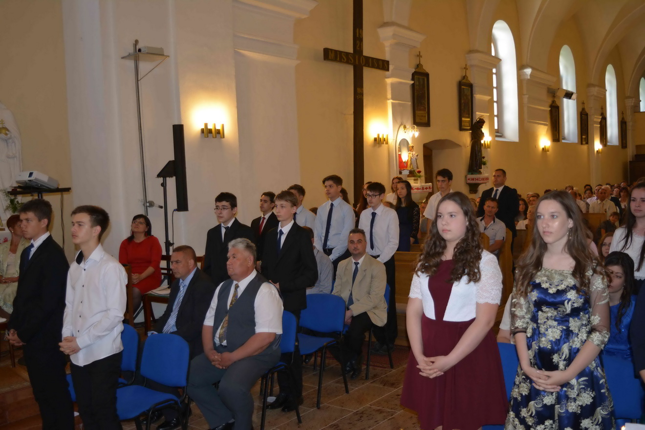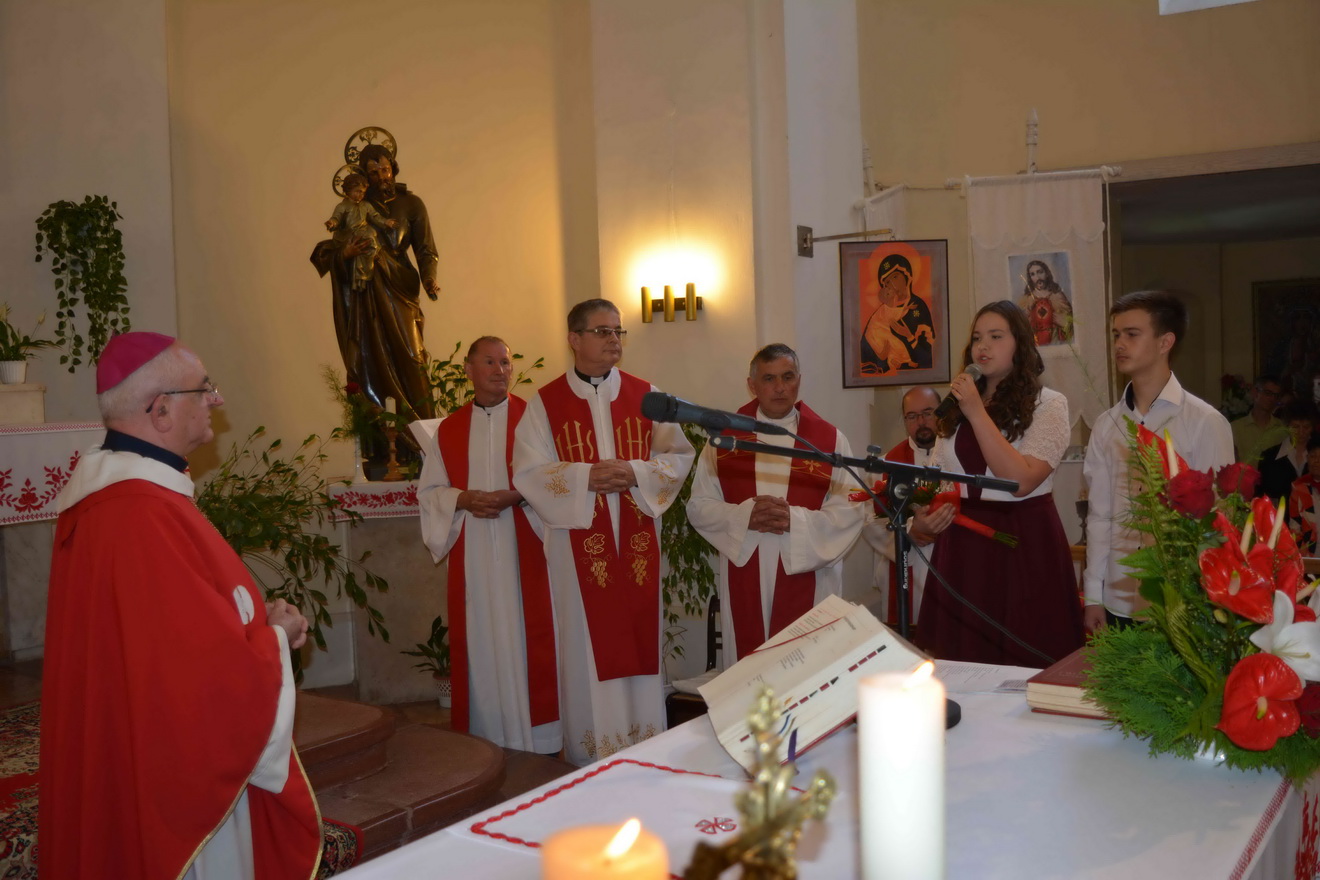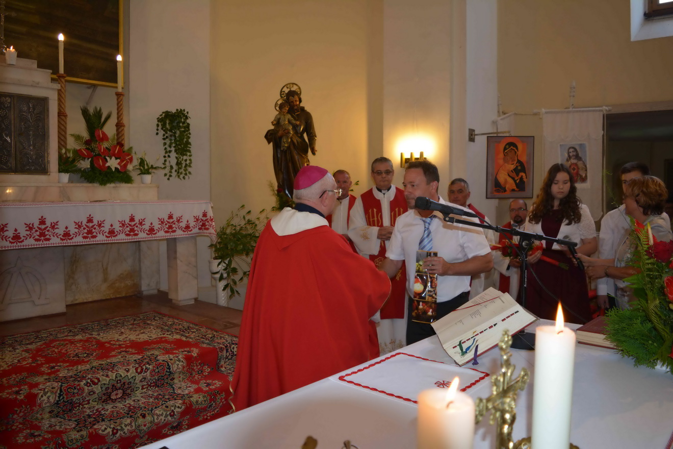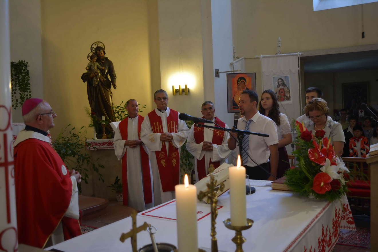 A püspök urat az egyházközség nevében Király Róbert képviselő testületi tag és felesége köszöntötték. A bérmálkozók nevében pedig Tóth Eszter Ágnes és Mali Gergő nyújtottak át ajándékokat és kérték a megyésfőpásztort, hogy részesítse őket kegyelemben e meghatározó szentség vétele által.