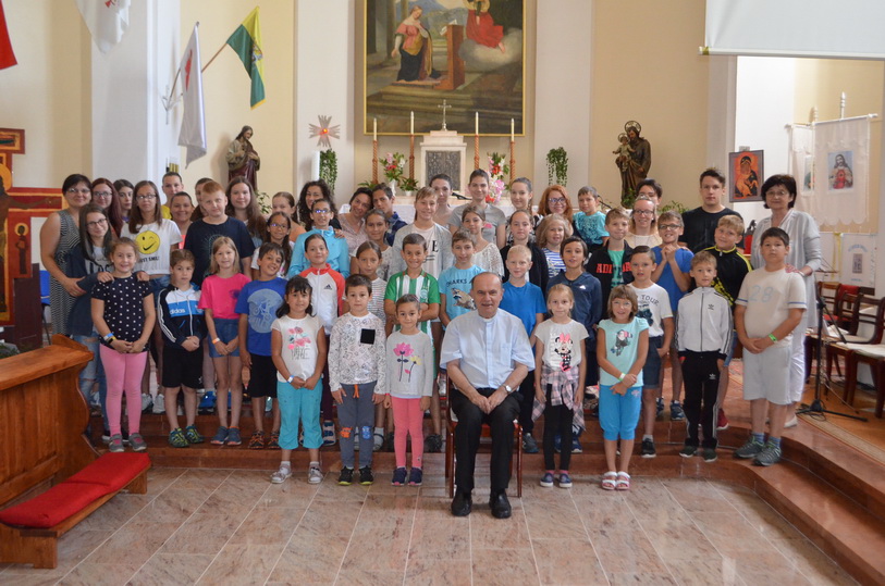 2019.07.05-én az Esztergomból érkező Missziós Kereszt előtt hódoltak, imaórát tartottak és dicsőítő énekeket zengtek az Úrnak a Marcali hittantáboros gyerekek. Az imaórában ismertették a kereszten lévő szentek életét és ereklyéit. A táborban segítők feltöltődésére szombaton csapatépítő kirándulást szerveztek a Szentgyörgyi hegyre és Balatonmáriára. Vasárnap a tábort közös szentmisével nyitották meg, melyet Kiss Iván c. prépost, esperes-plébános úr celebrált. Hétfőn hatalmas gyerekzsivajra ébredt az X-ház, 50 fővel. A reggelt ismerkedő és körjátékokkal kezdték a csoportok. A tábor témája a Missziós Kereszt volt S annak szentjei és ereklyéi. Az első nap Pozsonyi Anna tartott bemutatót a Kereszt történetéről és felépítésének hátteréről. A gyerekek minden egyes nap csoportokban az aznapi előadáshoz kapcsolódóan dolgozták fel a témát, játékos formában, például: színdarab, pantomim, faliújság és rejtvény, gyurma és csasztuska, vers és báb, melyek végül bemutatásra kerültek. Kedden reggeli tornával kezdték a napot Balogh Viktória vezetésével, majd a tízórai után kigyalogoltak a Boldog Gizella templomhoz. Ott hallhattak érdekesebbnél érdekesebb történeteket Szent Istvánról és Boldog Gizelláról, amelyeket Szakmári Eszter, Bojtorné Király Márta valamint Gálné Végh Edit ismertetett. Szerdán kirándultak Somogyvárt érintve Desedára, a tóhoz ahol nem csak annak szépsége, hanem a vízparti kiállítás érdekessége is vonzódta a gyerekeket. Innen Szennára a falumúzeumba utaztak ahol ismeretet szerezhettek a régi időkről és a népi hagyományokról. A skanzen területén kenyérlángossal és frissítő házi szörppel kedveskedtek a házigazdák. Megtekinthettek a régi portákat annak elrendezéseit és a Református templomot. Utazásunk következő helyszíne a Kaposvári Nagyboldogasszony Székesegyház volt ahol Pisztora Ferenc káplán fogadta őket újmisés áldásával. Útjuk fénypontja a Püspökségre vezetett ahol Varga László megyés püspök várta őket. Elmesélte, hogy hogyan lett püspök és hogy mitől püspök a püspök. A napot fagyizással zárták a sétálóutcán. Csütörtökön délelőtt Mód Lászlóné egy kis népmesével egybeszőve néptánc órát tartott nekik. A mulatság után Puska Erzsébet nővér Szent Erzsébetről és csodáiról mutatott be prezentációt. Délutántól sor került nemezelésre is Gálné Végh Edit jóvoltából. Pénteken Galambos Ferenc atya tartott játékos előadást Szent Lászlóról majd ezt követően egy íjászbemutatót ahol a gyerekek is kipróbálhatták tehetségüket. Délután ráhangolódtak a tábortűzre, a csapatoknak bemutatkozó csasztuskát kellett írniuk. 5 órakor kezdődött el a szülőknek való bemutatkozás csasztuska, vers, tánc és fényképes diavetítés összegzésében hogy mi is történt a héten. Ez után közös palacsinta evés vette kezdetét. Majd a tábortűz megrakása után elkezdődött a szalonna, virsli, pillecukor sütögetése. A vacsora után sorverseny vette kezdetét ahol a gyerekek szüleikkel párban két csoportban versengtek anyukák kontra apukák felosztásban. Az este vége felé a beszélgetésé és a társalgásé volt a főszerep. Vasárnap a reggeli misén köszönték meg a táborozók Istennek a tábor élményeit.