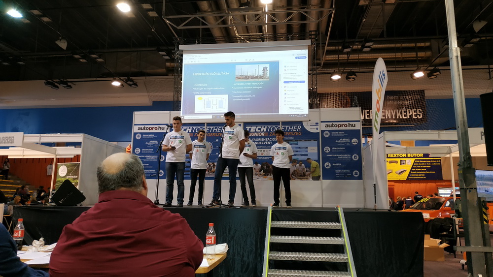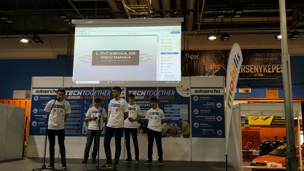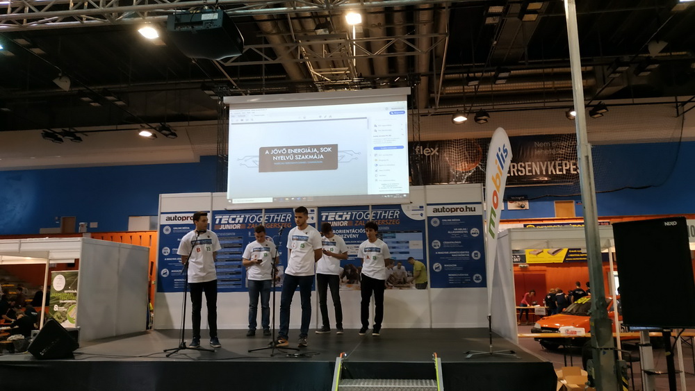 Mi a hidrogén meghajtású járművek, hidrogén cella által termelt energiával kapcsolatos szakmákat választottuk és a fordító/tolmács szakot kaptuk. Ahogy az már a prezentációnk címében is állt, „A jövő energiája, sok nyelvű szakmája” egy gyerekcipőben levő technológia előnyeit mutatta be és az egyiklegsokarcúbb szakmának firtattuk a hasznát és fontosságát. Ezekután a 6 fős csapatunk (Bojtor Barnabás, Kővári Kristóf, Pajor Gergő, Palacskó Zsombor, Pálfi Péter és jó magam) kettő részre vált. A csapat egyik fele az egyetemek, középiskolák által felállított standoknál a menetlevelünkre gyűjtötték a pontokat izgalmas, érdekes és ismeret terjesztő feladatokkal, eközben a csapat másik fele szoros menetrendet kötve gyakorlati és ügyességi feladatokat oldottak meg, amivel szintén pontokat lehetett gyűjteni. Csapatunk szépen teljesített hiszen majdnem minden feladatot sikerült megoldani. Sajnos a nagy rohanásban elcserélte az egyik állomásnál levő segítő a menetlevelünket, aminek pontveszteség lett a következménye. De nem voltunk csalódottak, hiszen jól éreztük magunkat, rengeteg hasznos dolgot megtudhattunk a gyakorlati és iskolai képzésekről, illetve a hazai gyárak szerepéről és működéséről. És persze egyetlen egy diák és kísérő sem távozott üres kézzel,mert minden csapat kapott jutalmat és ajándékot. Nem kerültünk fel idén a dobogóra, de az a tapasztalat amit itt megszereztünk az mindennél többet ér. Írta: Harcz Bence Kálmán a Marcali Berzsenyi Dániel Gimnázium tanulója.