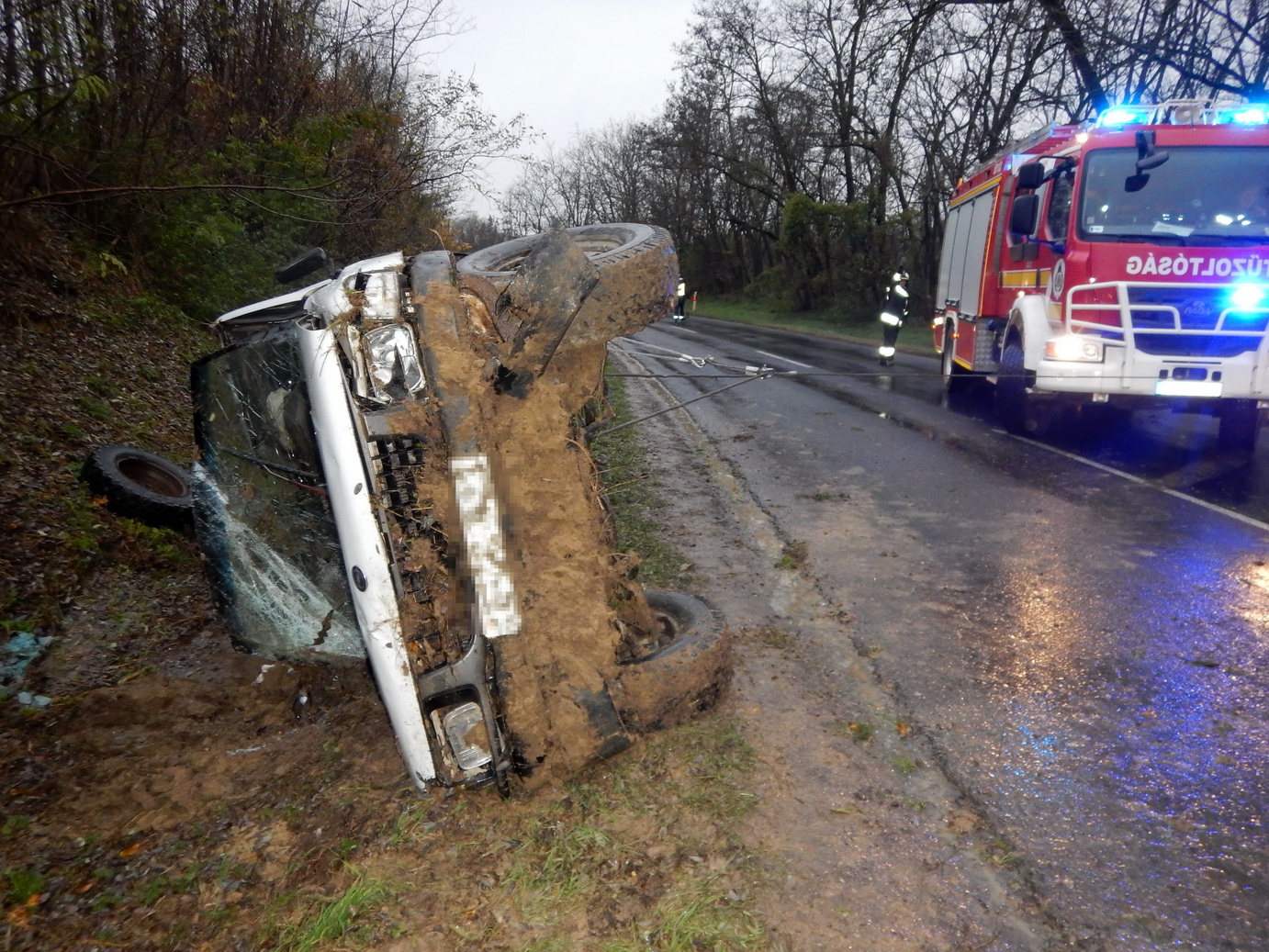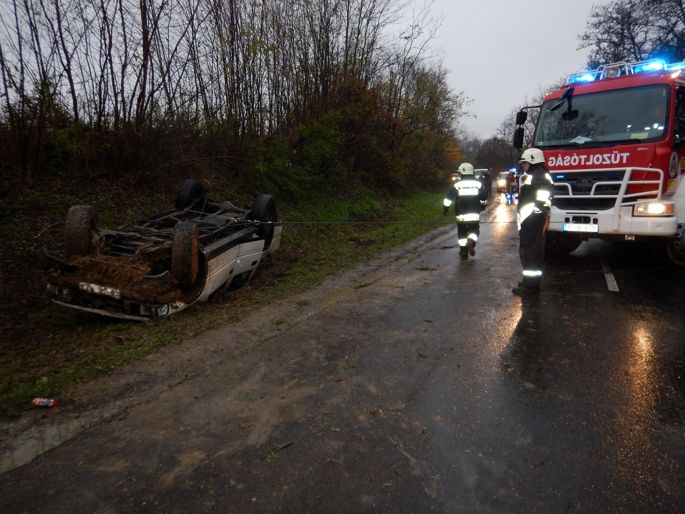 A 68-as számú főúton, Mesztegnyő külterületén szerdán délután lehajtott az útról egy autó, majd a tetejére borulva állt meg az árokban.