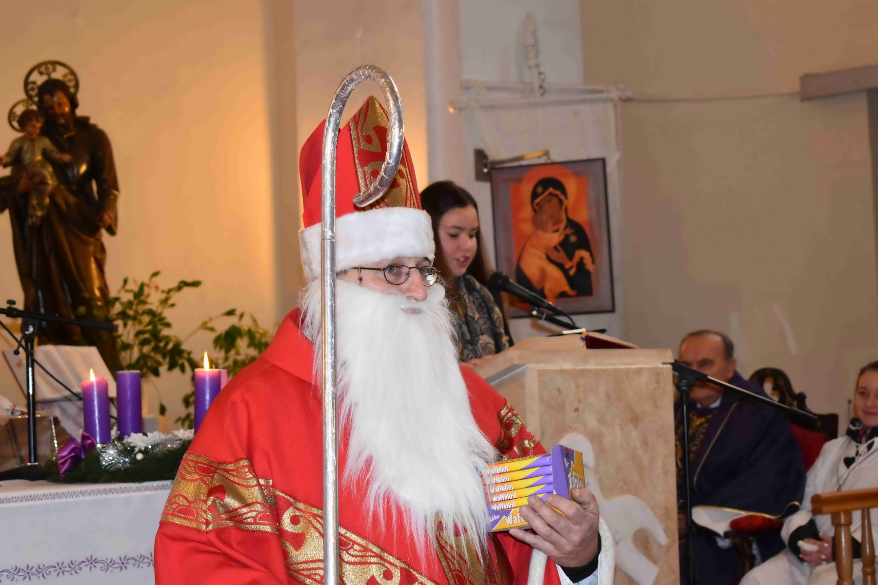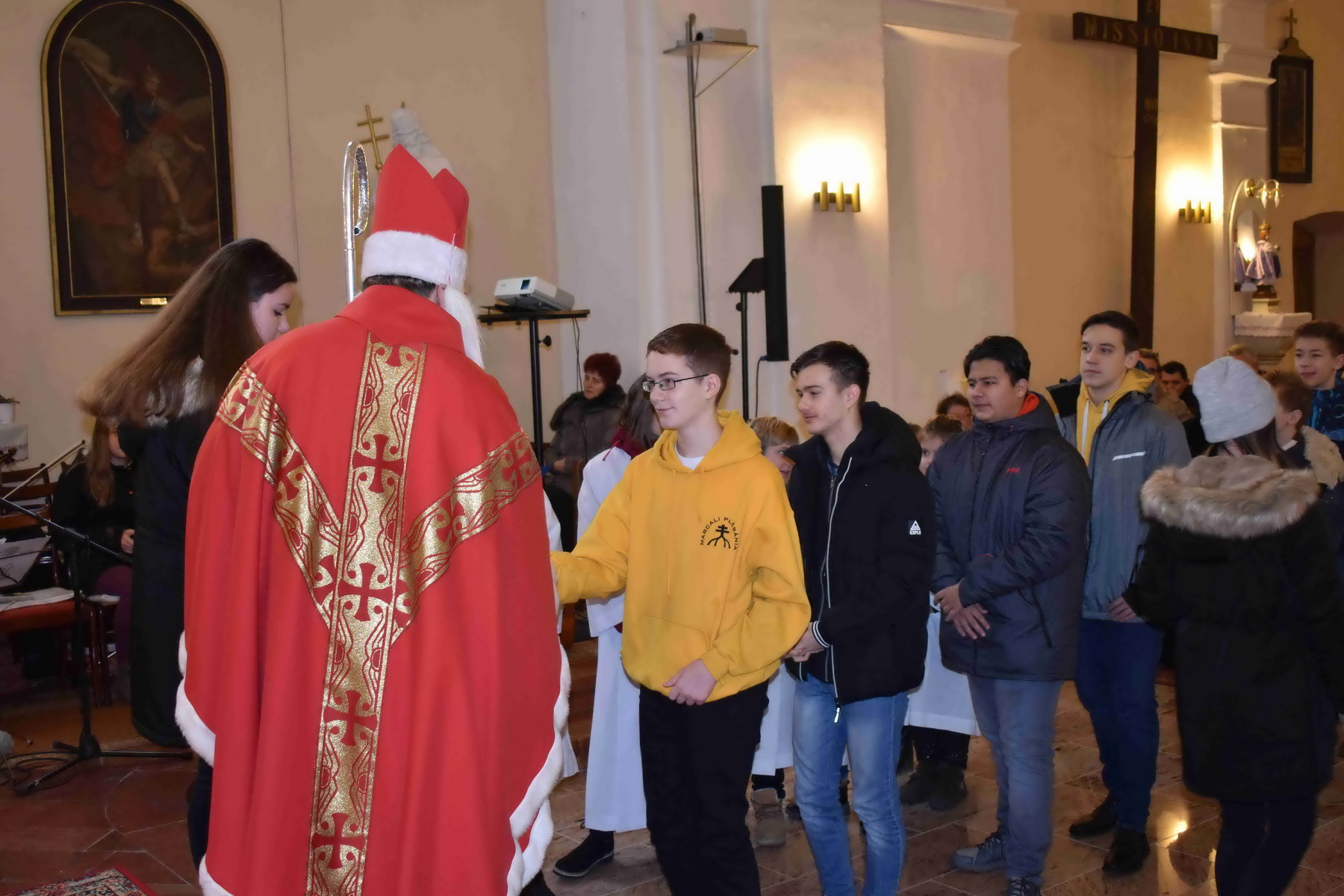 A Mikulást Kiss Iván c. prépost, esperes-plébános köszöntötte, majd Tóth Eszter Ágnes ismertette az egyik legismertebb szent életét és legendás történeteit. Majd ezután a hittanos gyermekek és a ministránsok egy kis édességet kaptak a püspöktől.
