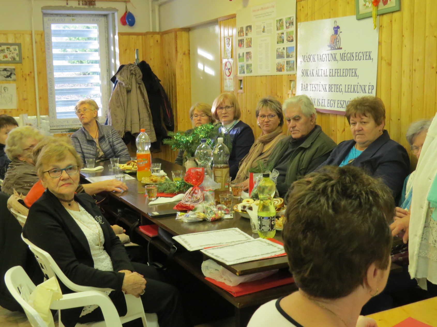 Tagjainkat finom süteményekkel, pogácsával és kávéval, üdítővel vendégeltük meg. A megjelent sorstársak pedig számtalan házi süteménnyel, rétessel kedveskedtek egymásnak, szeretetteljes hangulatot varázsolva a szívekbe, köszönet a szorgos kezeknek! A délután a közelgő ünnephez méltó meghitt hangulatban, baráti beszélgetéssel, és a finomságok kóstolgatásával telt.