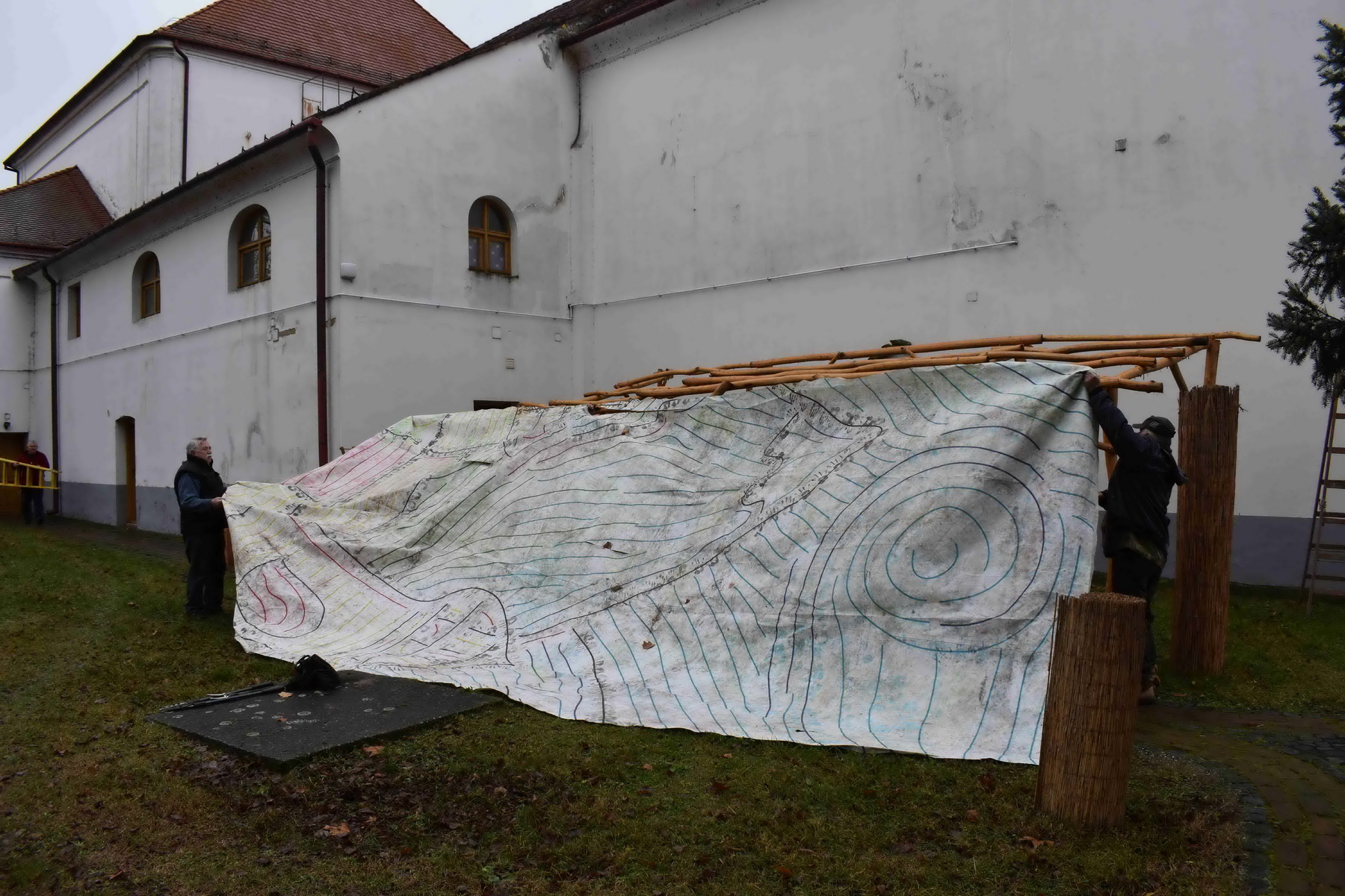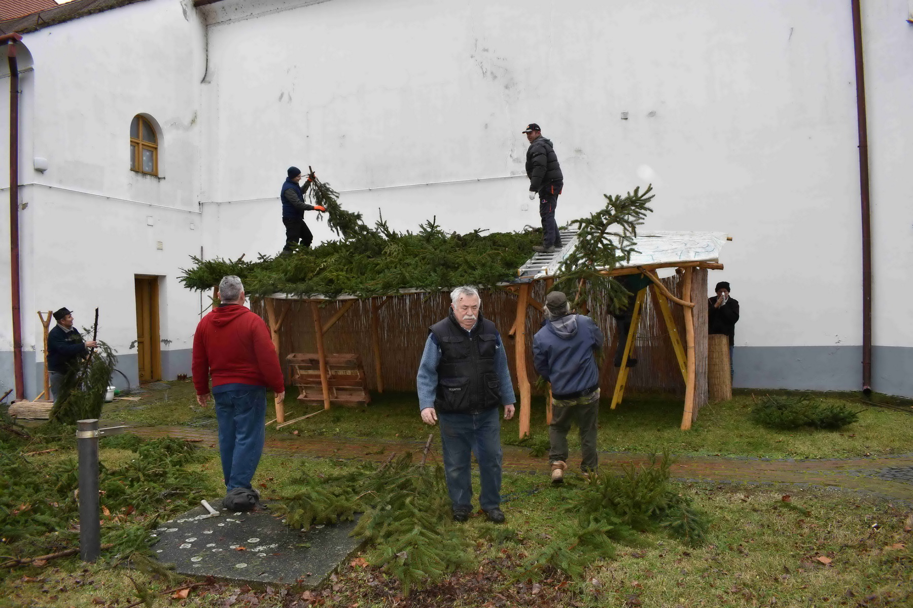 A munka először a vázszerkezet összeállításával indult Ságvári Róbert ácsmester és csapata vezetésével. Majd december 23-án, hétfőn délelőtt Király Jenő templomatya és Gelencsér Róbert világi elnök irányításával készült el a betlehem végleges formája a díszítéssel és a figurák elhelyezésével.