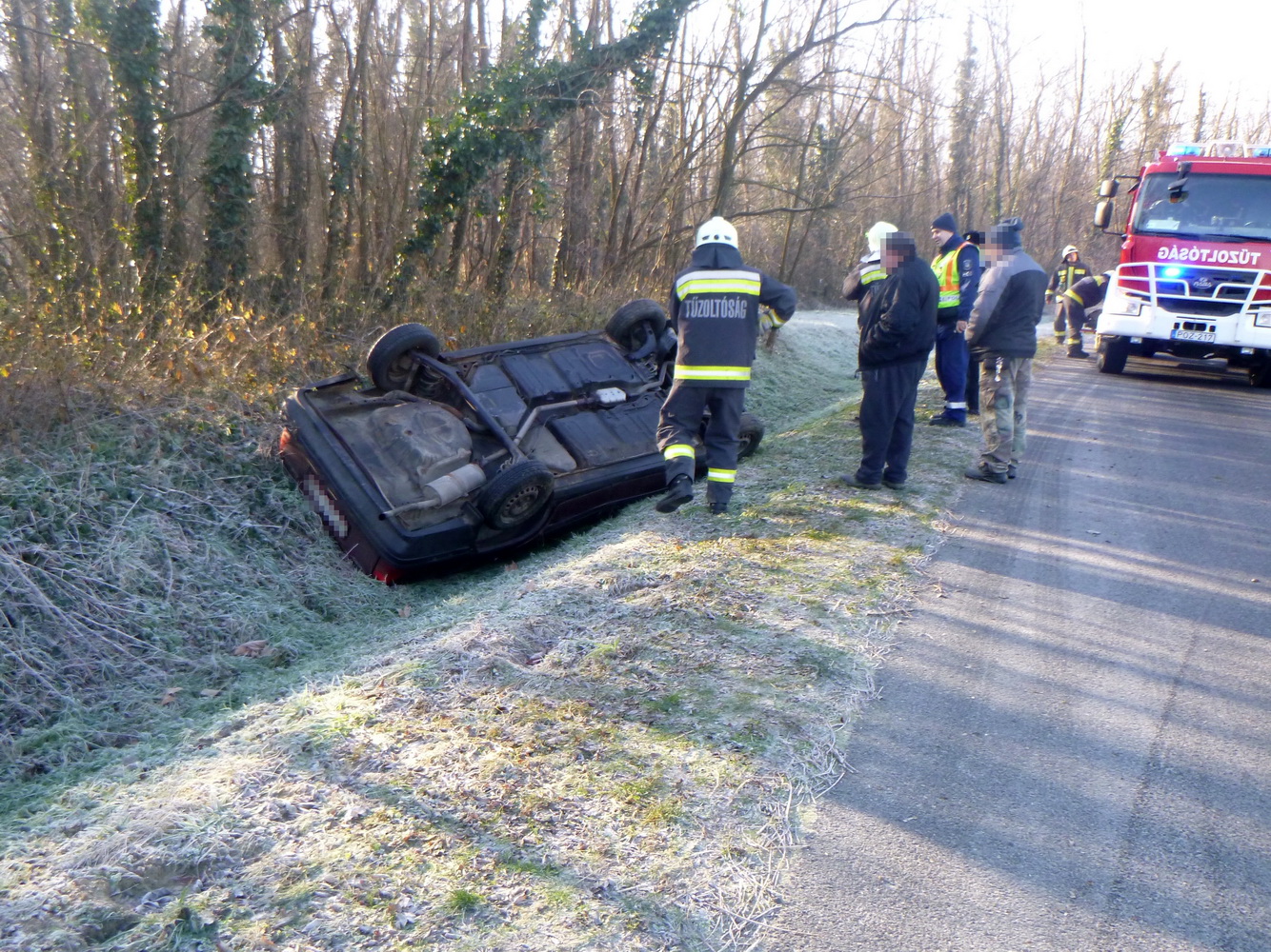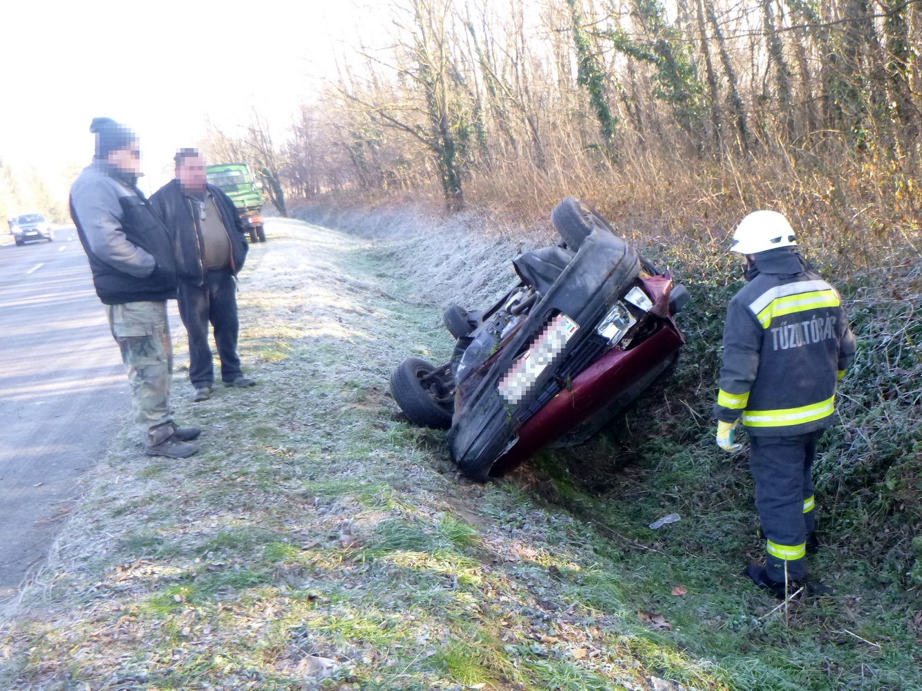 Lecsúszott az útról, árokba hajtott és felborult egy személyautó Barcson, a Darányi utcában pénteken délelőtt. A jármű a tetején állt meg. Műszaki mentés céljából a helyi hivatásos tűzoltók érkeztek a baleset helyszínére. Az egység a kerekeire állította és áramtalanította a gépkocsit.