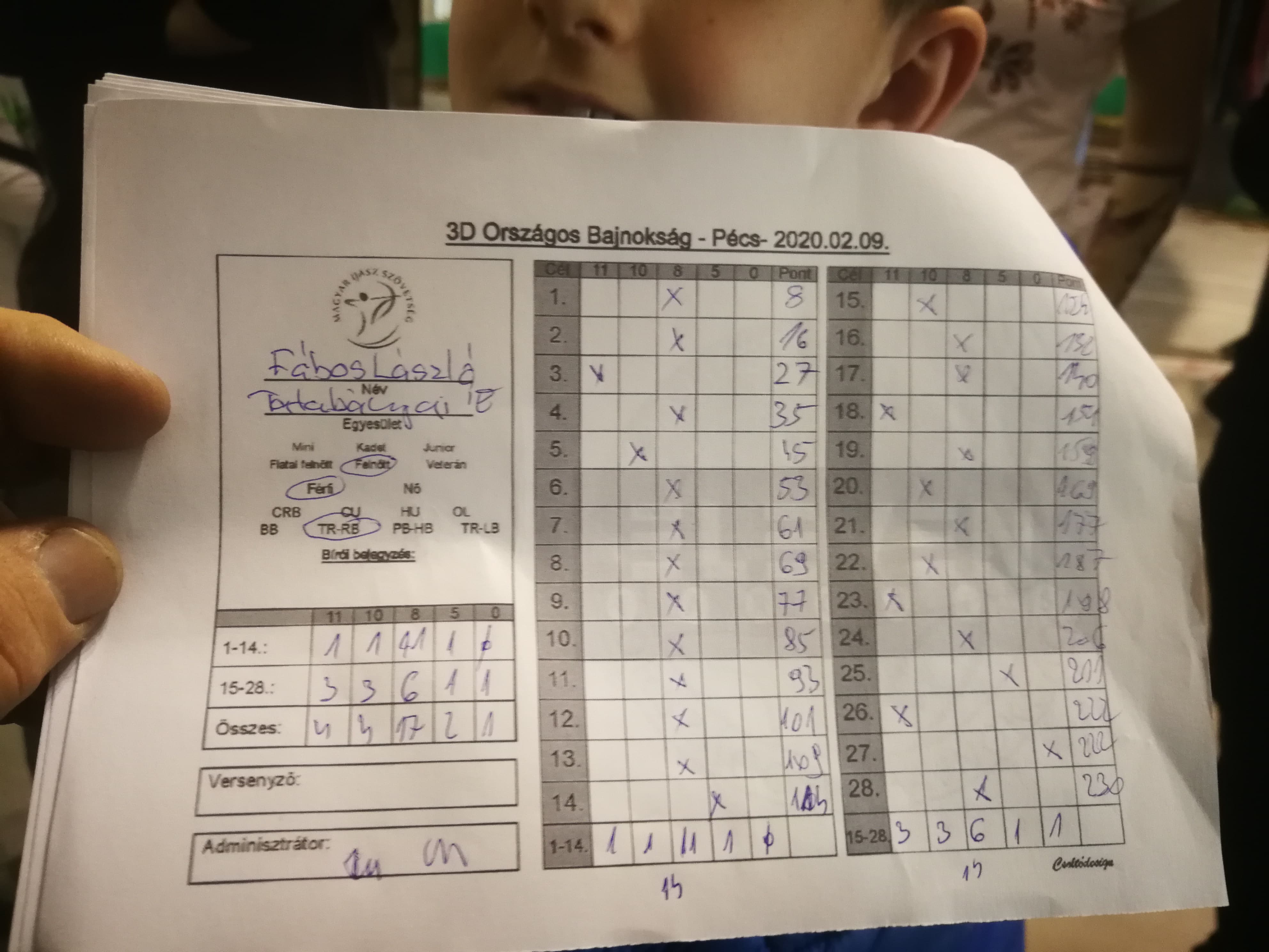 Itt 28 cél került kihelyezésre, célonként egyetlen lövéssel küzdöttük le őket. 2015 óta először voltam Terem 3D versenyen. A 3D ezen fajtája sokkal pörgősebb, mint kültéren. Ennek köszönhetően bőven akadtak számomra meglepetések. Összességében egy látványos, profin szervezett versenyen vettem részt. 1. osztályú (230/280) pontszámot lőttem, ezzel az 5. helyen végeztem. A lőtt pontommal alapvetően elégedett vagyok. Ernőnek nem volt könnyű feladata, hisz egy versenynapot már teljesített. Ezen a napon az 5. helyen végzett a veteránok között.