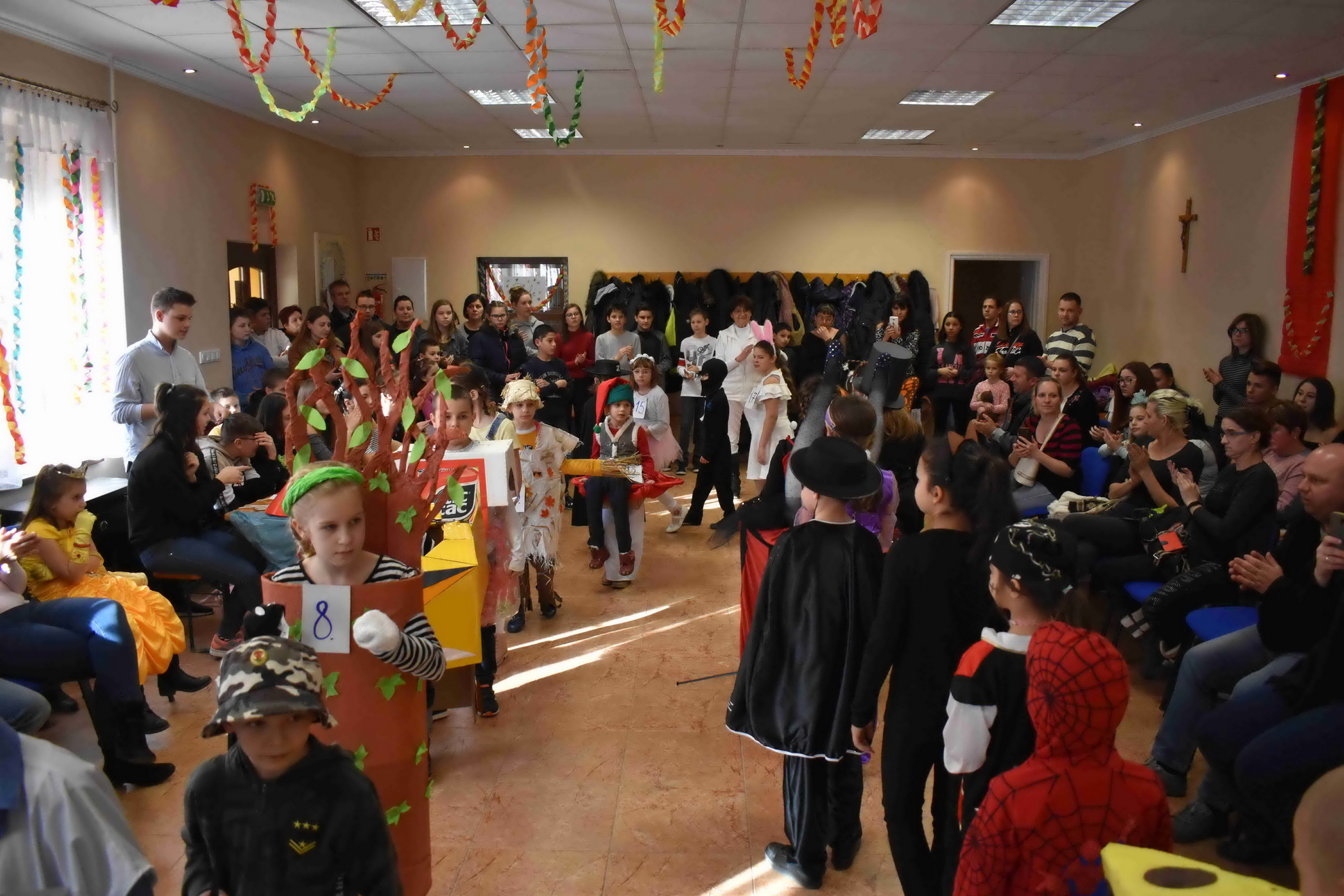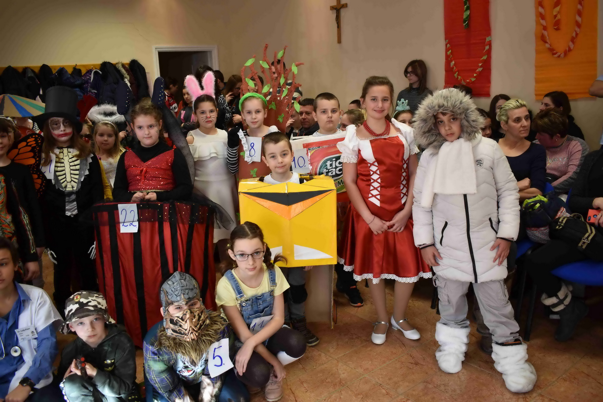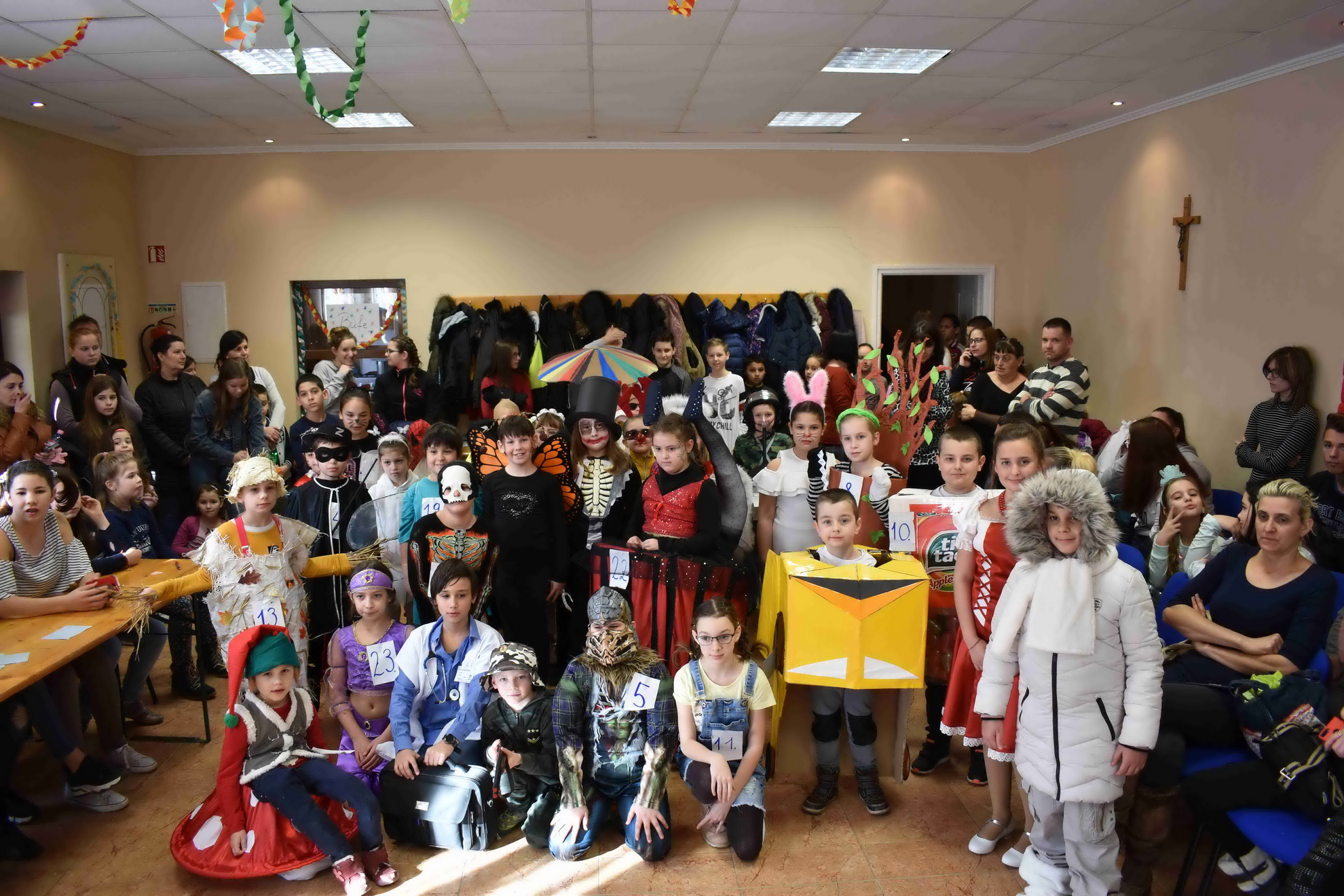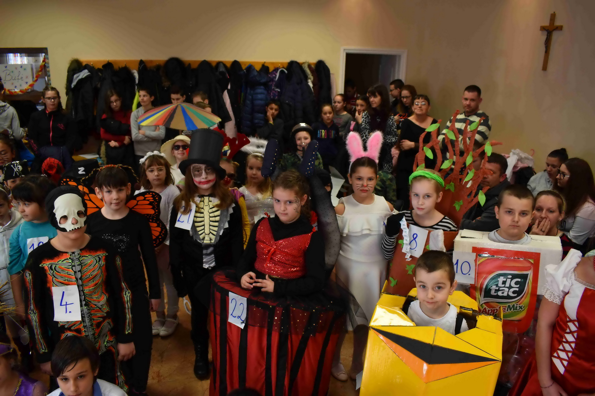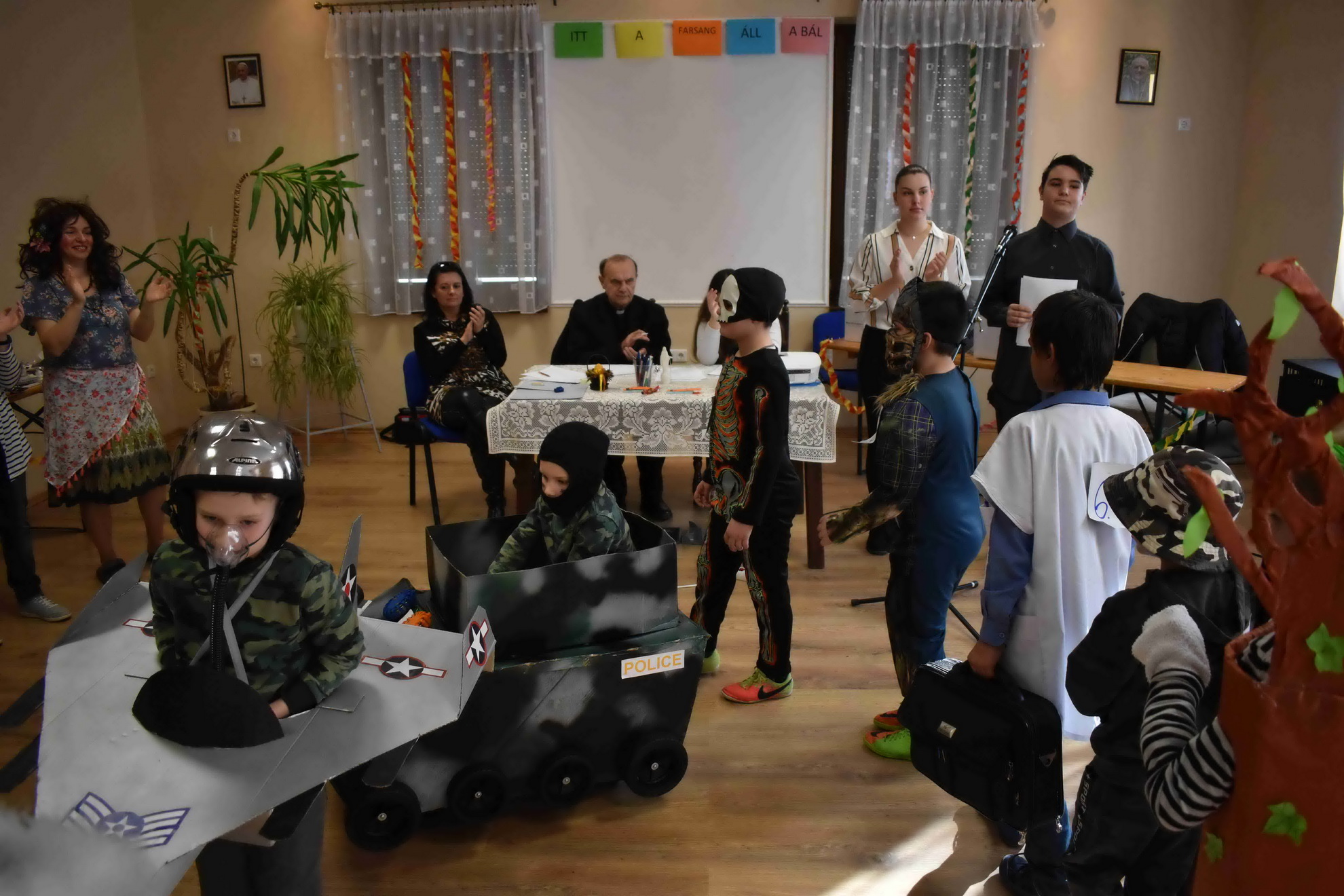 Az alsó és felső tagozatos tanulókat Kiss Iván c. prépost, esperes-plébános köszöntötte. A vidám hangulatot a világ népeit bemutató előadás alapozta meg, melyet Iván atya és a hitoktatók adtak elő. A mulatság ezután a szokásos és nagy izgalommal kísért jelmezversennyel folytatódott, ahol ismét sok gyermek vonult fel a jelenlévők és a szakértő zsűri előtt. Az idén is voltak különféle ötletes maskarák önálló és csoportos kategóriában. A nehéz helyzetben lévő bíráló bizottság ismét csak a leleményes megoldásokat díjazta, így például a TEK-et és a katonai repülést megjelentető „haditechnikai bemutatót”, a „fába szorult férget”, a „sajtkukacot”, a „transformers”-et, vagy éppen a „Mikulás szabadságra megy” című produkciót.