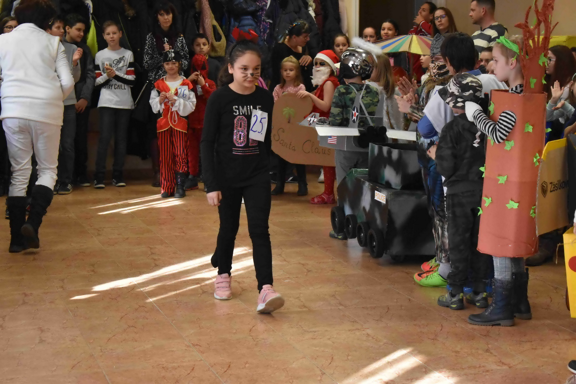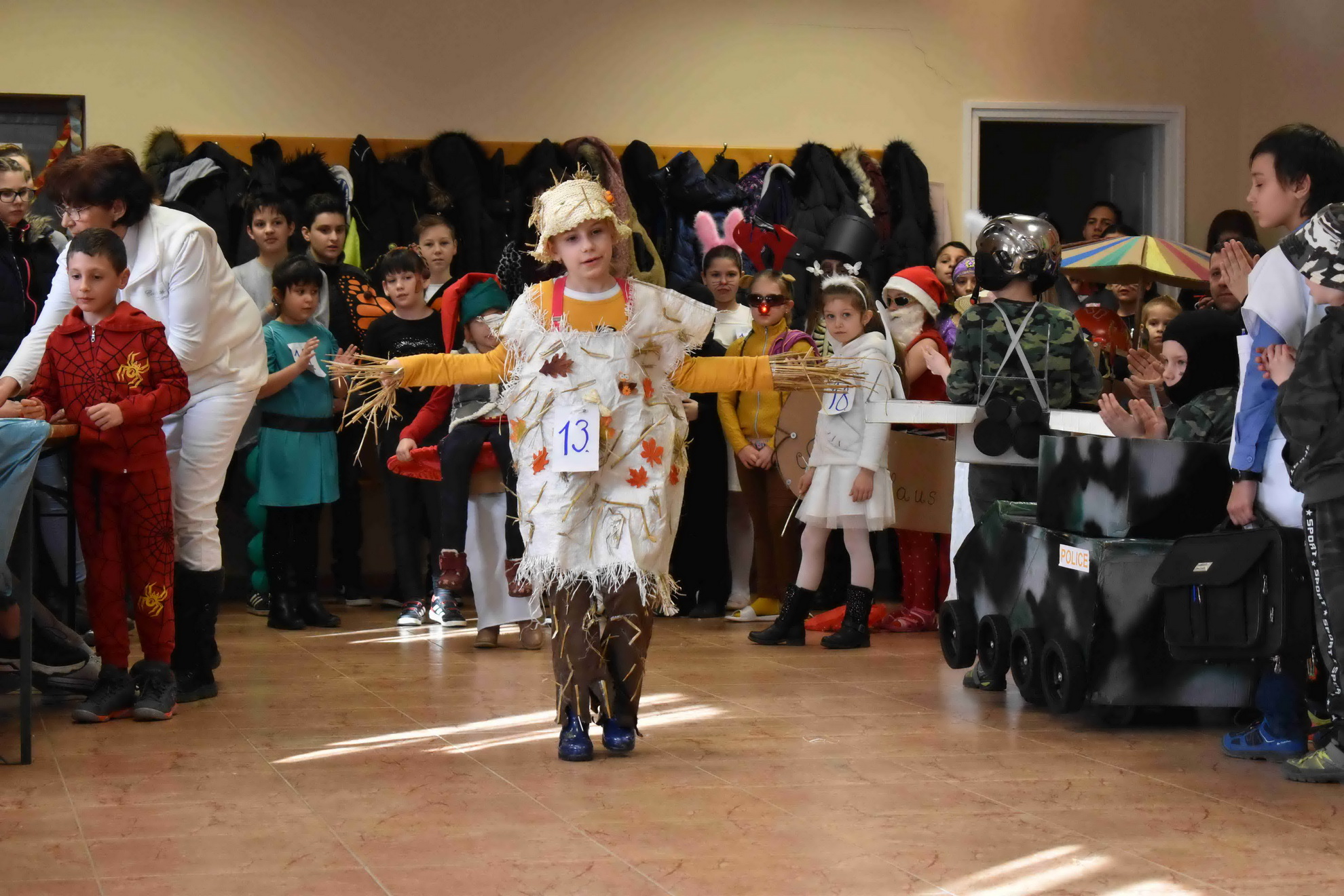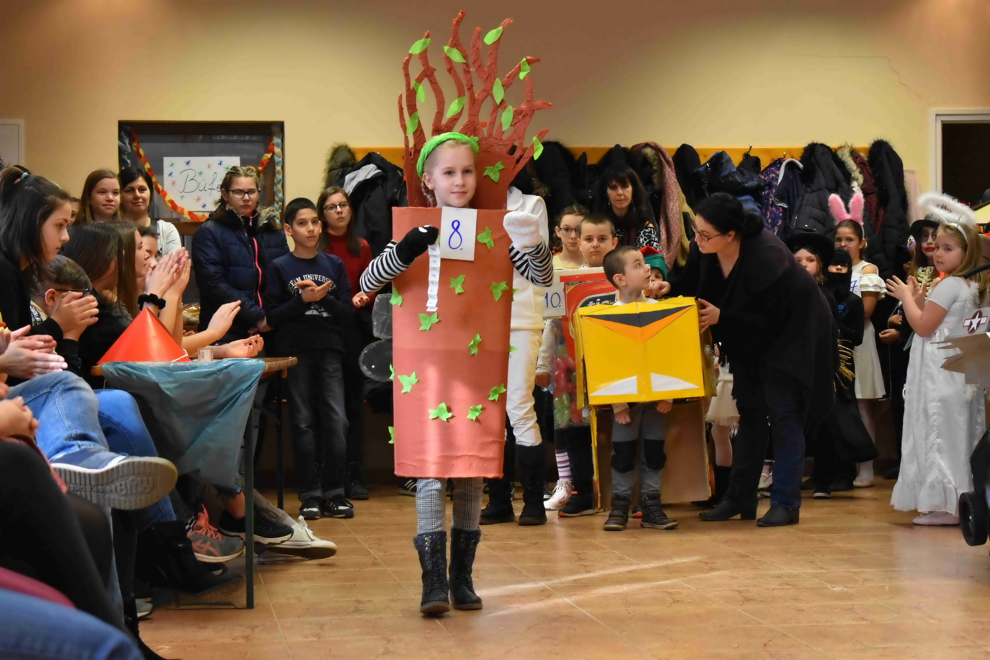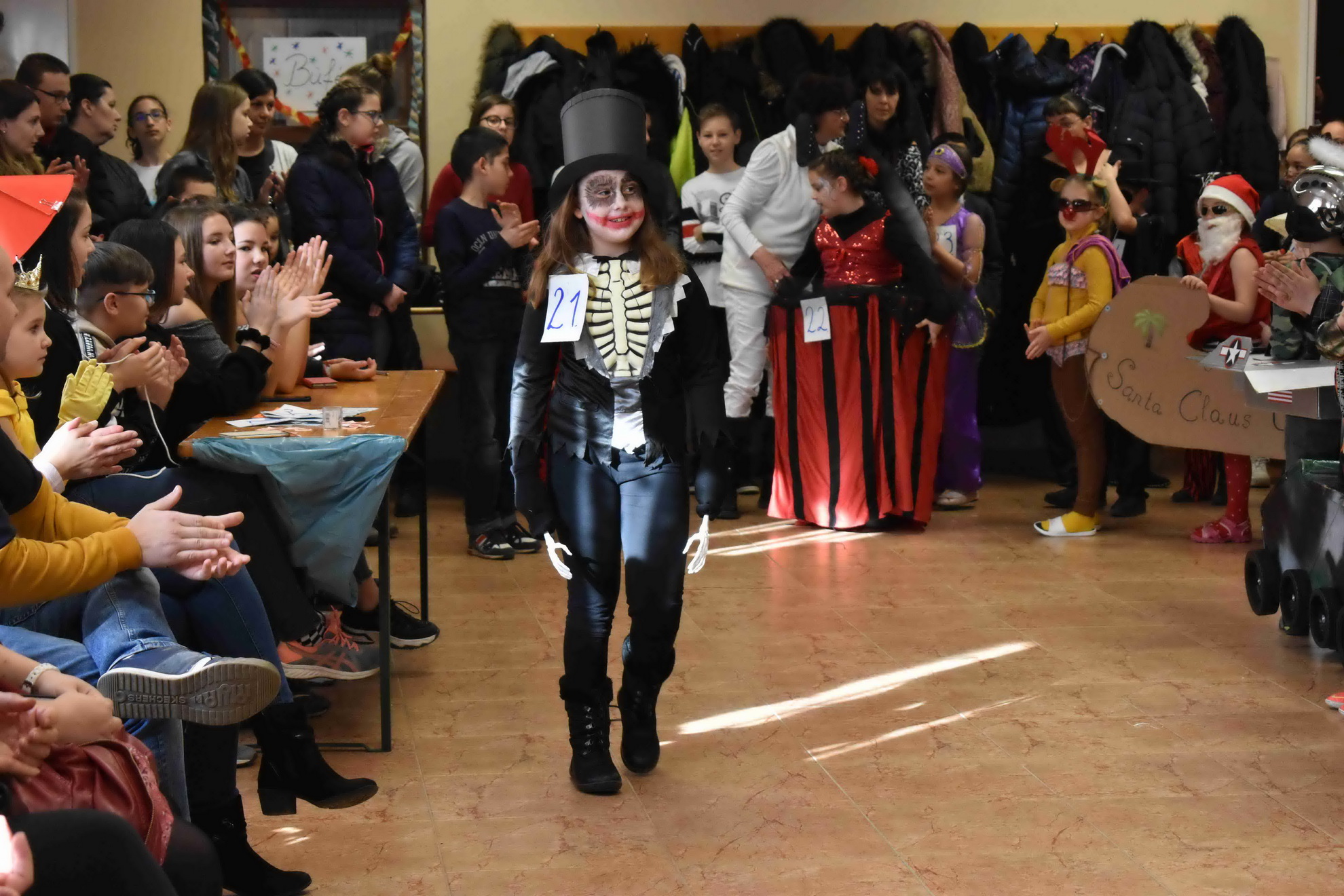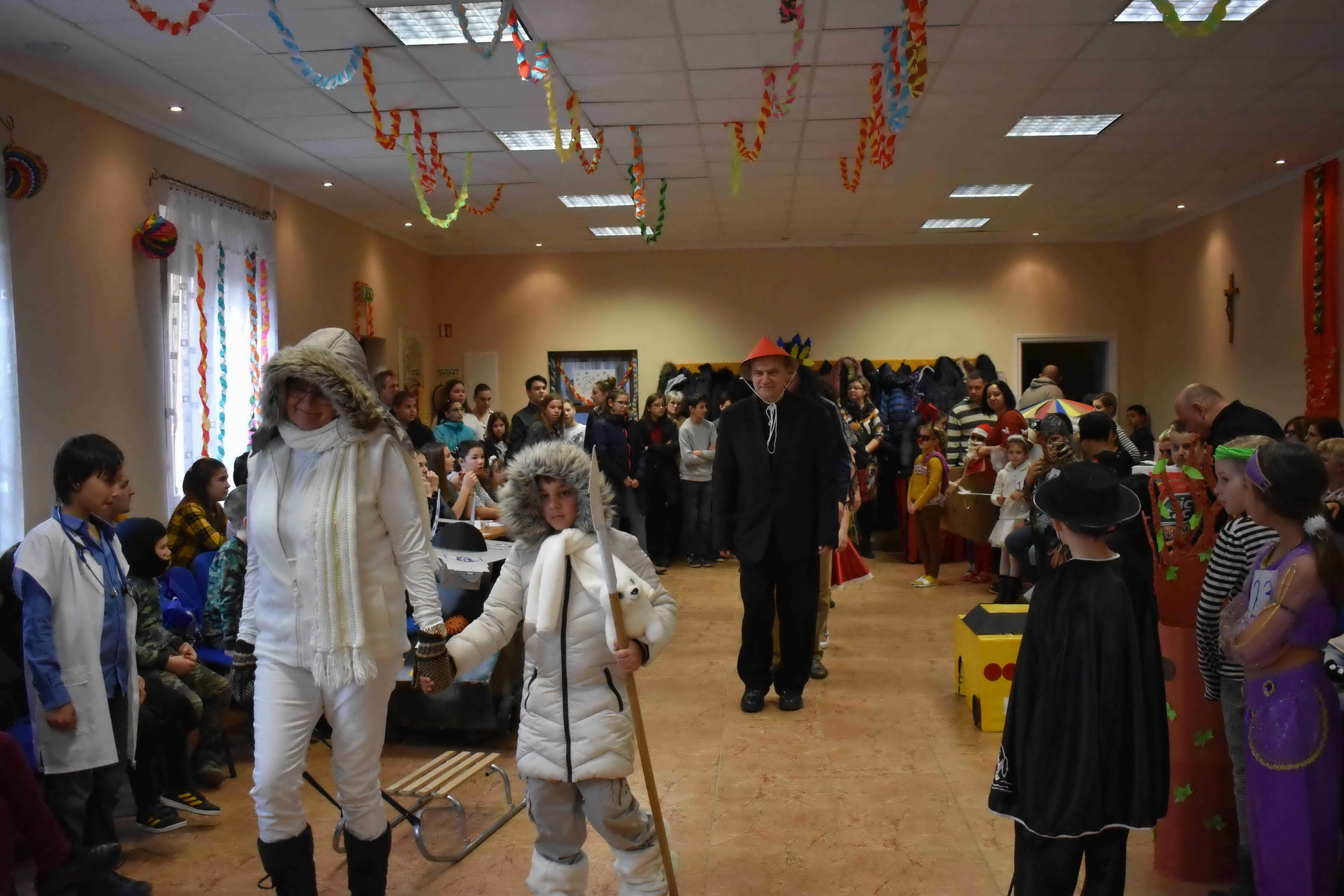 Az alsó és felső tagozatos tanulókat Kiss Iván c. prépost, esperes-plébános köszöntötte. A vidám hangulatot a világ népeit bemutató előadás alapozta meg, melyet Iván atya és a hitoktatók adtak elő. A mulatság ezután a szokásos és nagy izgalommal kísért jelmezversennyel folytatódott, ahol ismét sok gyermek vonult fel a jelenlévők és a szakértő zsűri előtt. Az idén is voltak különféle ötletes maskarák önálló és csoportos kategóriában. A nehéz helyzetben lévő bíráló bizottság ismét csak a leleményes megoldásokat díjazta, így például a TEK-et és a katonai repülést megjelentető „haditechnikai bemutatót”, a „fába szorult férget”, a „sajtkukacot”, a „transformers”-et, vagy éppen a „Mikulás szabadságra megy” című produkciót.