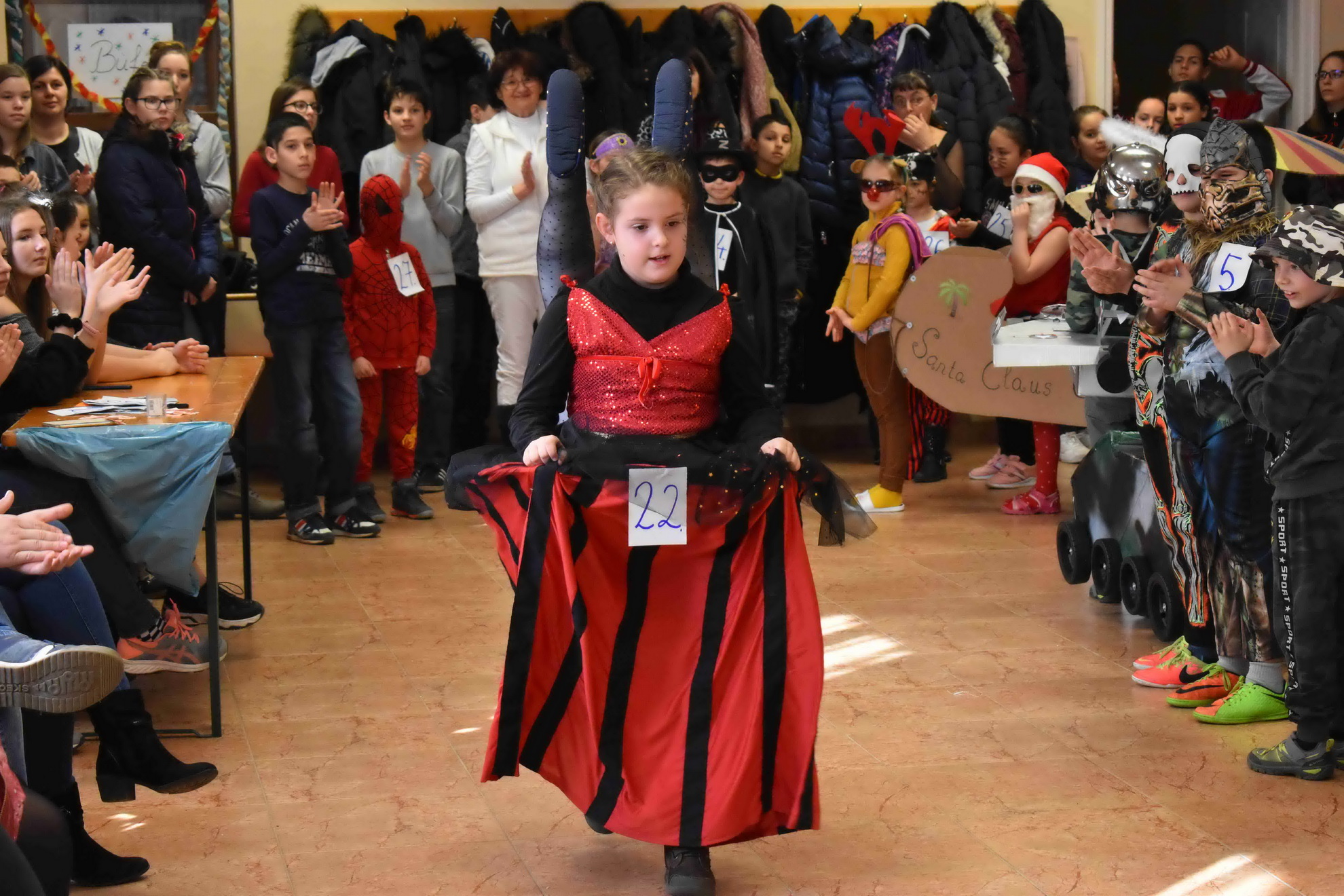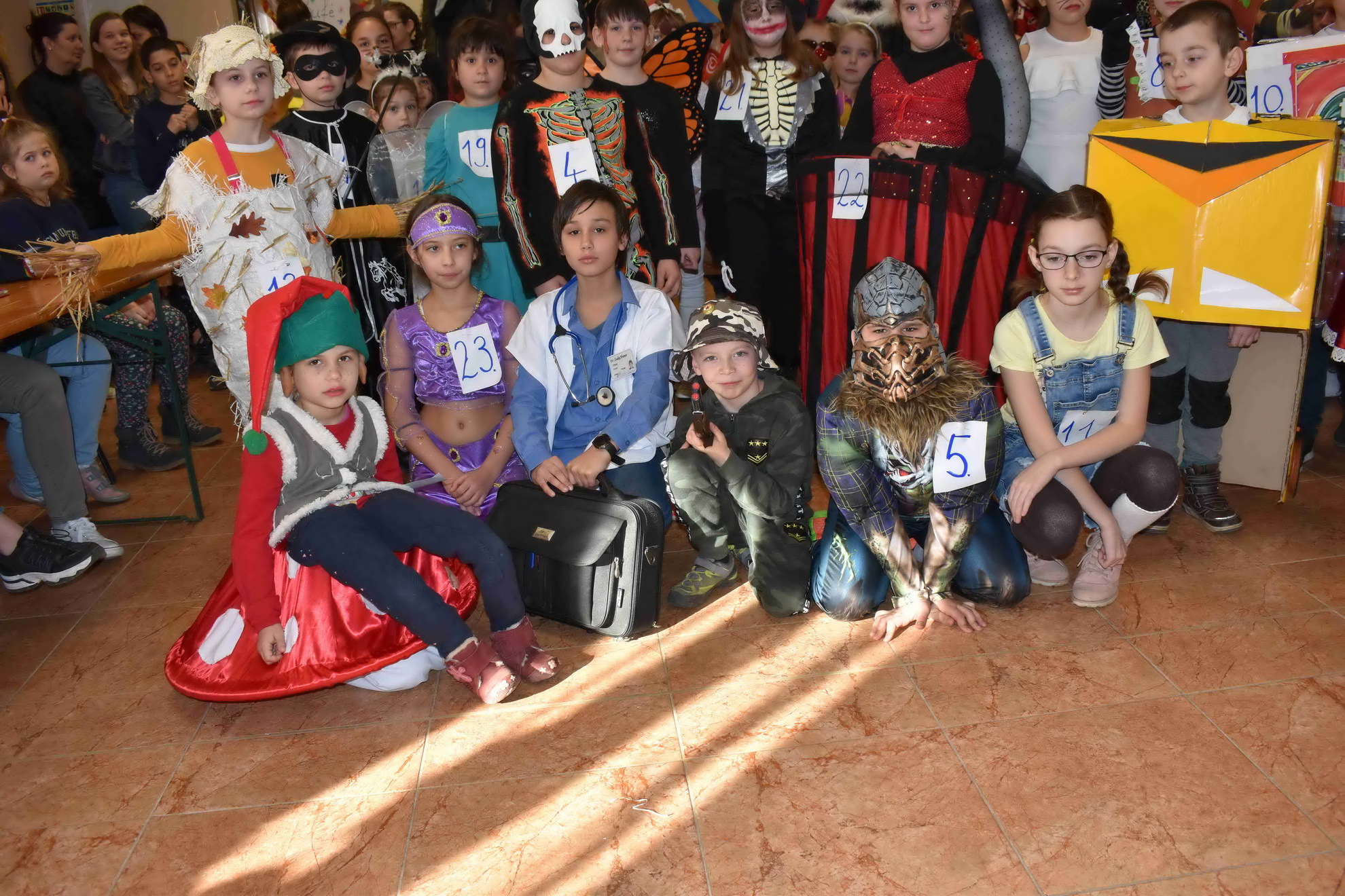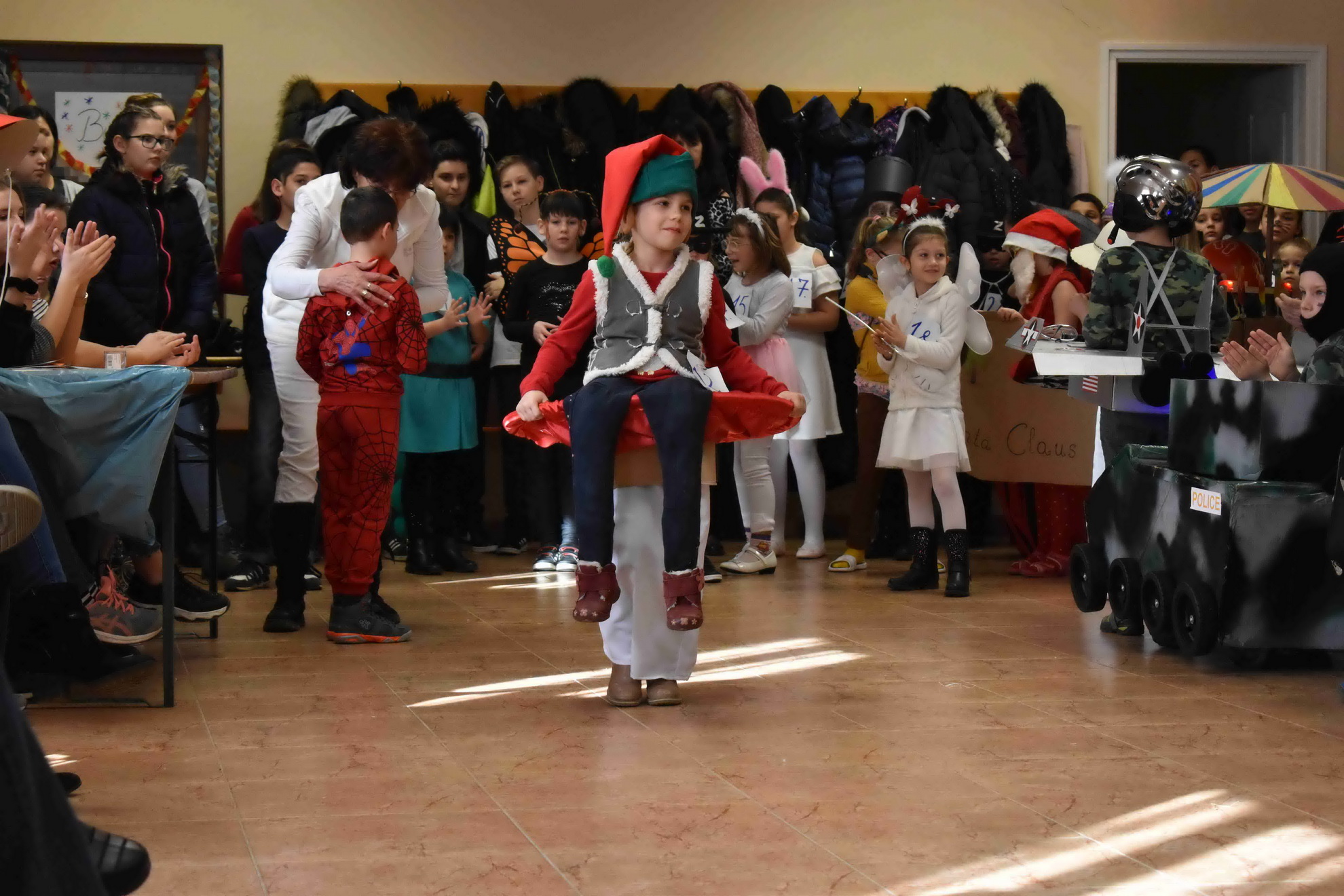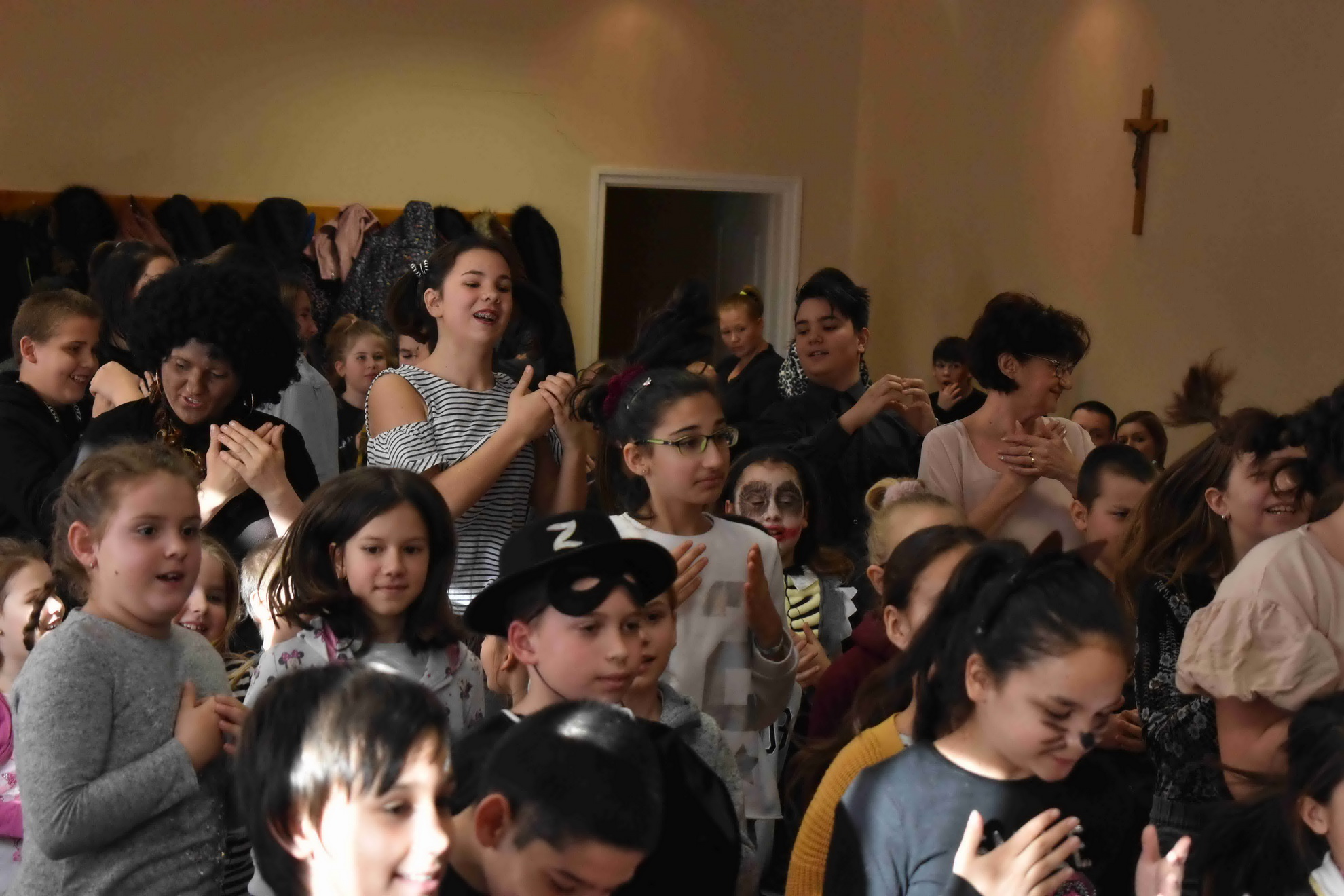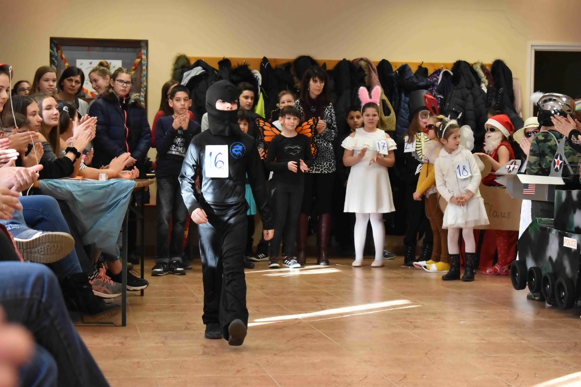 Az alsó és felső tagozatos tanulókat Kiss Iván c. prépost, esperes-plébános köszöntötte. A vidám hangulatot a világ népeit bemutató előadás alapozta meg, melyet Iván atya és a hitoktatók adtak elő. A mulatság ezután a szokásos és nagy izgalommal kísért jelmezversennyel folytatódott, ahol ismét sok gyermek vonult fel a jelenlévők és a szakértő zsűri előtt. Az idén is voltak különféle ötletes maskarák önálló és csoportos kategóriában. A nehéz helyzetben lévő bíráló bizottság ismét csak a leleményes megoldásokat díjazta, így például a TEK-et és a katonai repülést megjelentető „haditechnikai bemutatót”, a „fába szorult férget”, a „sajtkukacot”, a „transformers”-et, vagy éppen a „Mikulás szabadságra megy” című produkciót.