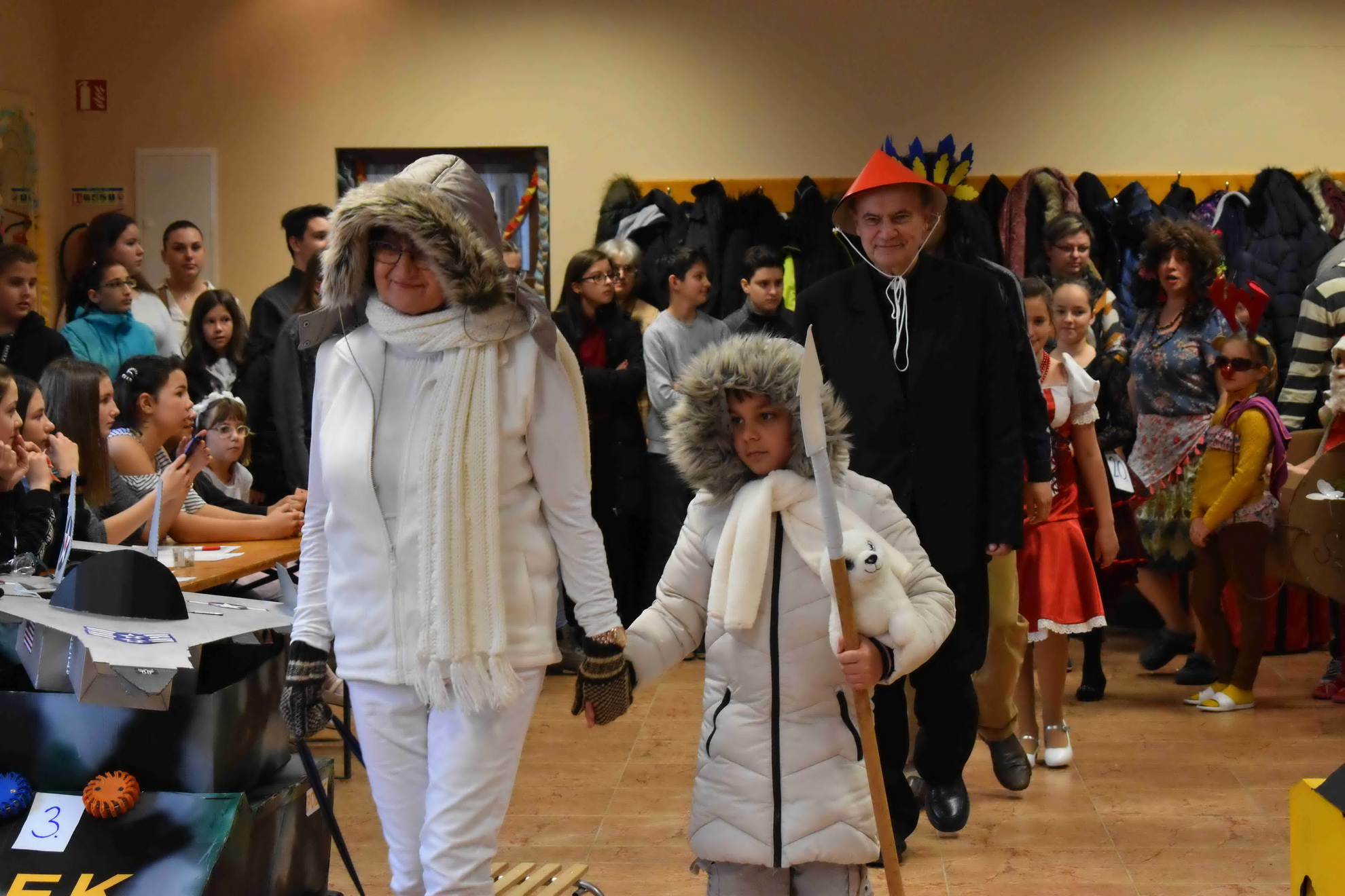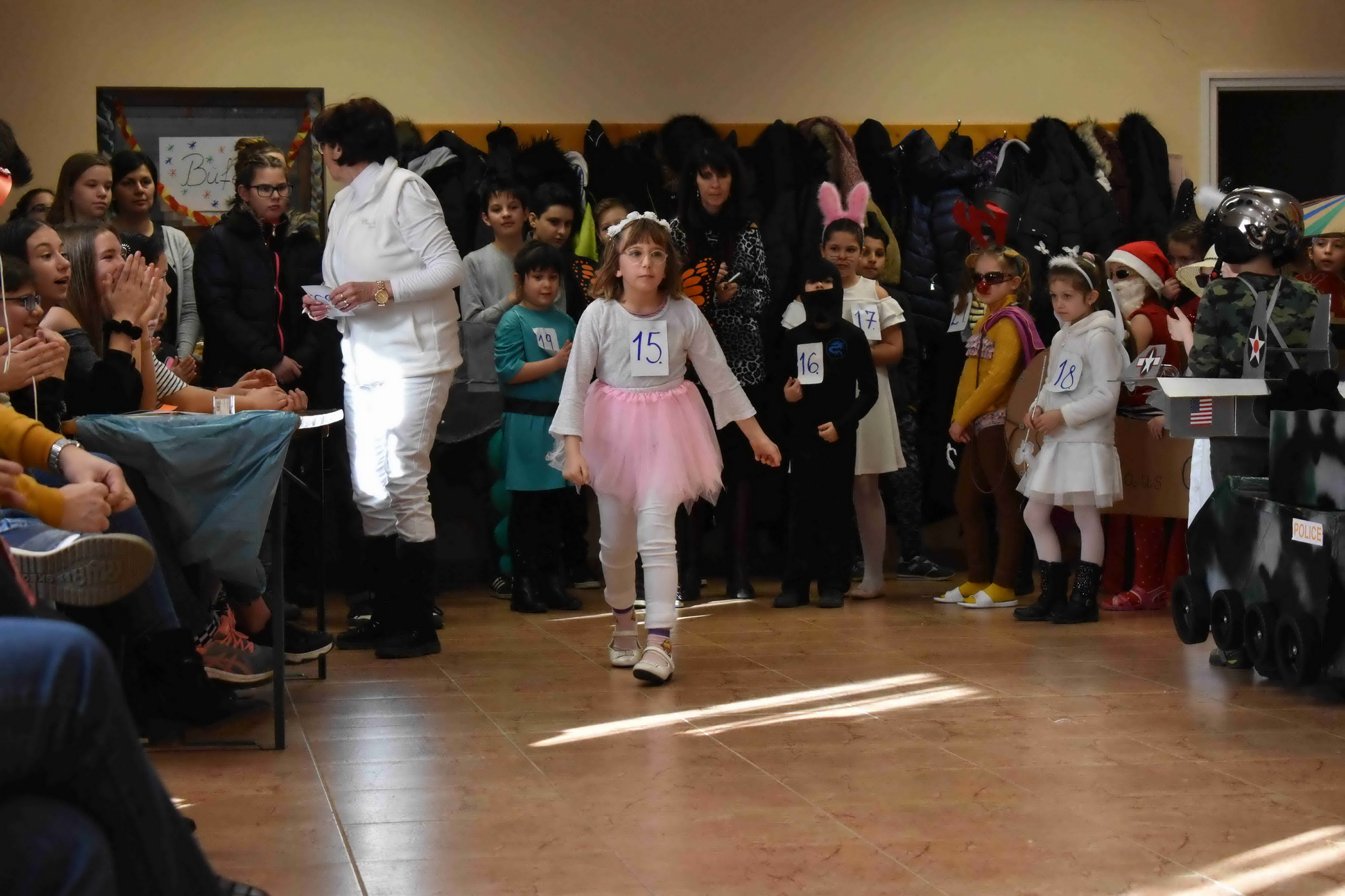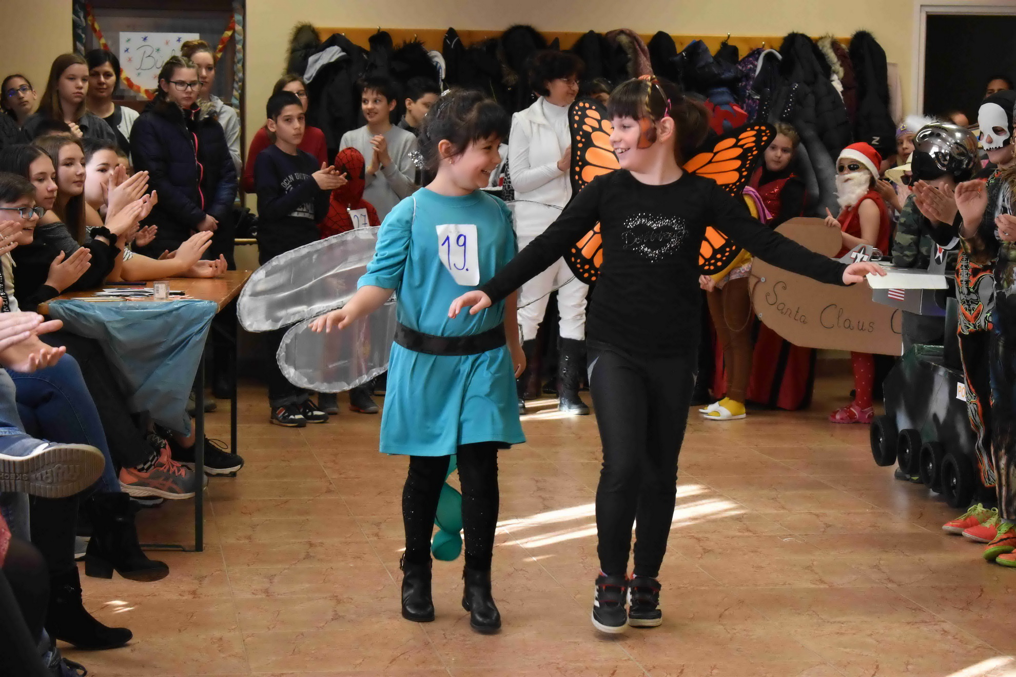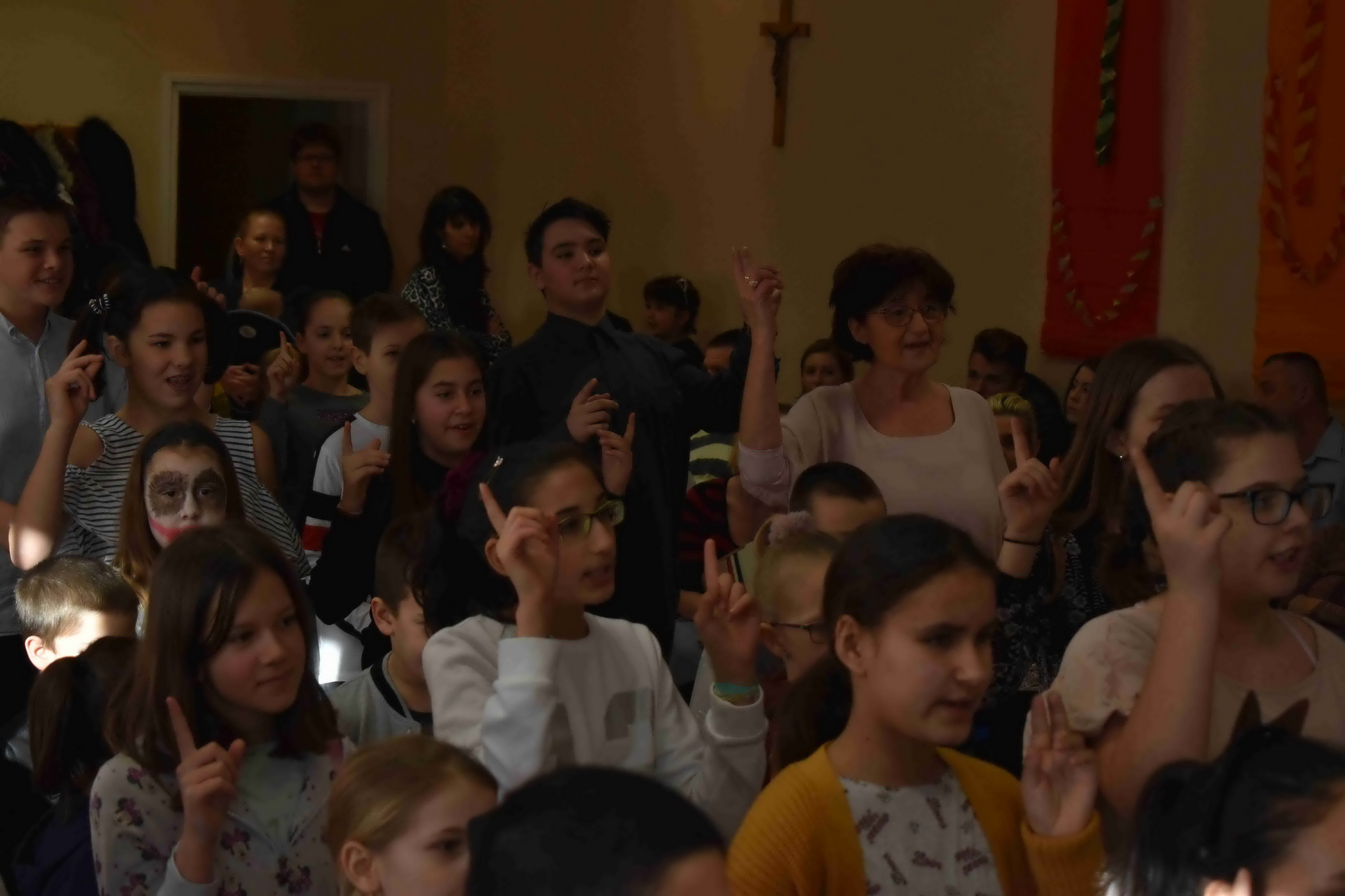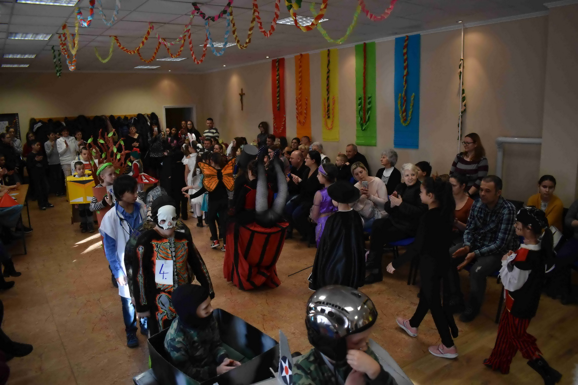 Az alsó és felső tagozatos tanulókat Kiss Iván c. prépost, esperes-plébános köszöntötte. A vidám hangulatot a világ népeit bemutató előadás alapozta meg, melyet Iván atya és a hitoktatók adtak elő. A mulatság ezután a szokásos és nagy izgalommal kísért jelmezversennyel folytatódott, ahol ismét sok gyermek vonult fel a jelenlévők és a szakértő zsűri előtt. Az idén is voltak különféle ötletes maskarák önálló és csoportos kategóriában. A nehéz helyzetben lévő bíráló bizottság ismét csak a leleményes megoldásokat díjazta, így például a TEK-et és a katonai repülést megjelentető „haditechnikai bemutatót”, a „fába szorult férget”, a „sajtkukacot”, a „transformers”-et, vagy éppen a „Mikulás szabadságra megy” című produkciót.