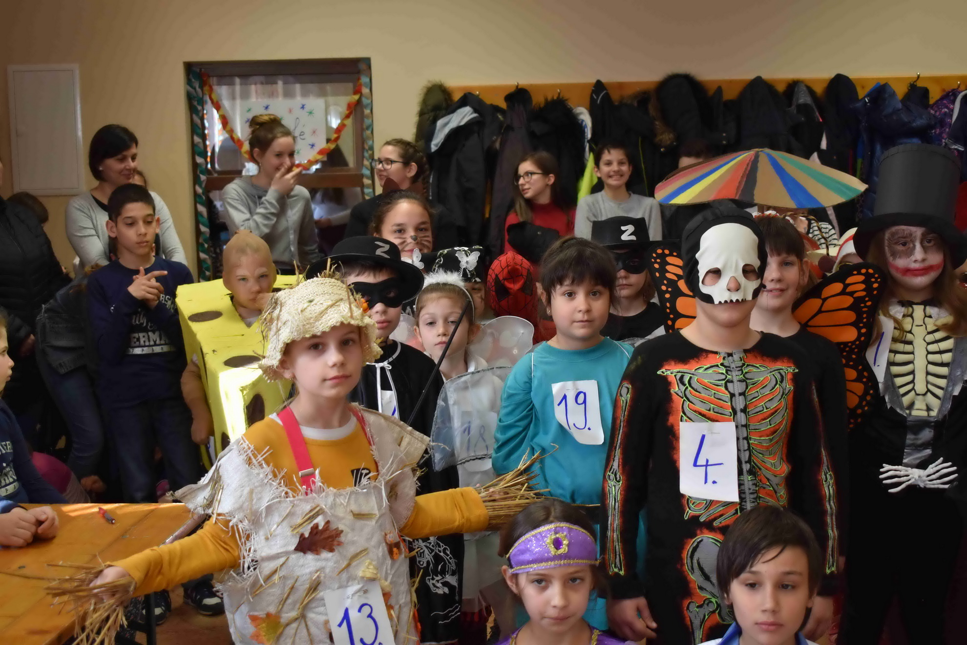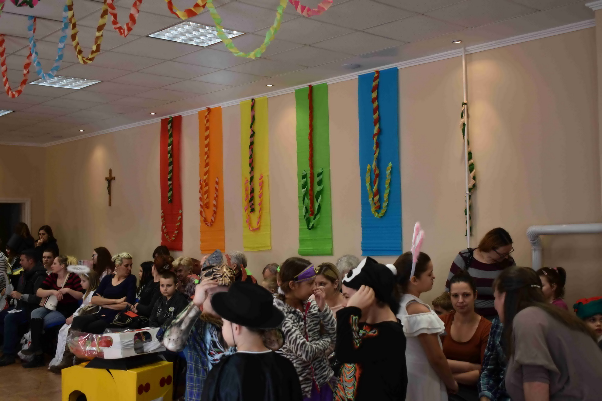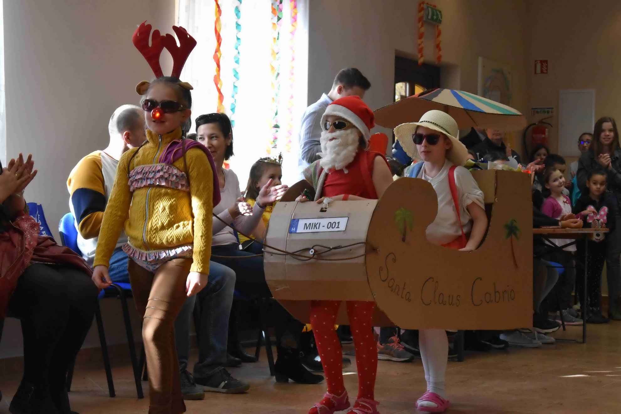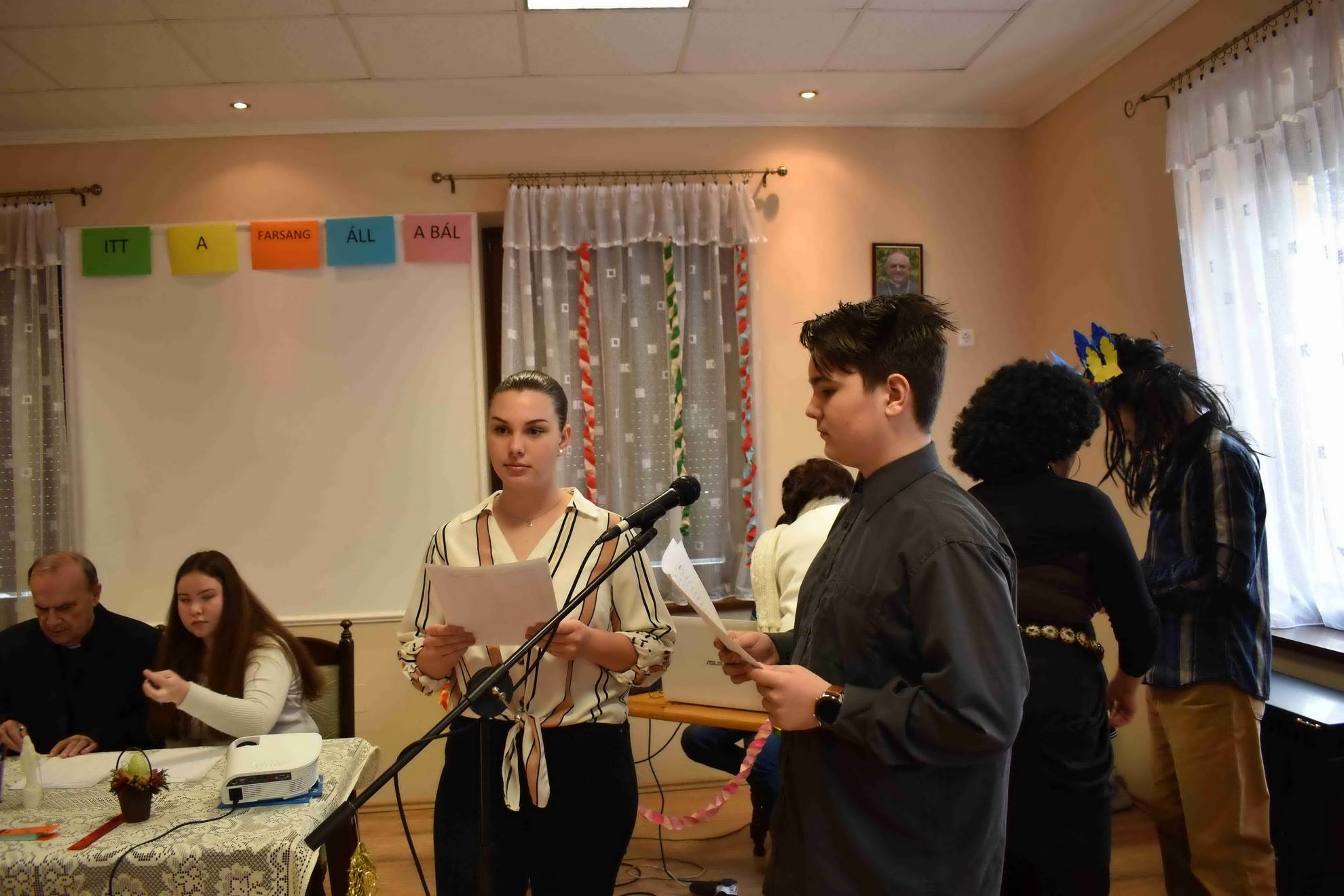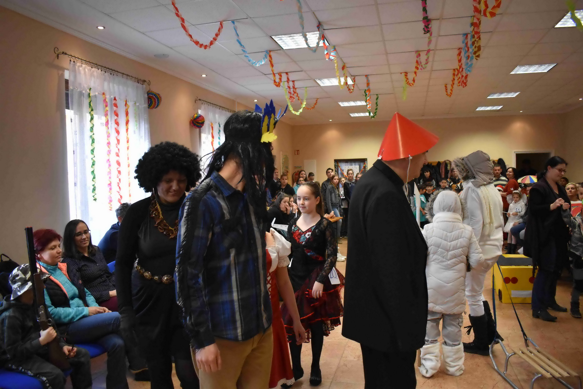 Az alsó és felső tagozatos tanulókat Kiss Iván c. prépost, esperes-plébános köszöntötte. A vidám hangulatot a világ népeit bemutató előadás alapozta meg, melyet Iván atya és a hitoktatók adtak elő. A mulatság ezután a szokásos és nagy izgalommal kísért jelmezversennyel folytatódott, ahol ismét sok gyermek vonult fel a jelenlévők és a szakértő zsűri előtt. Az idén is voltak különféle ötletes maskarák önálló és csoportos kategóriában. A nehéz helyzetben lévő bíráló bizottság ismét csak a leleményes megoldásokat díjazta, így például a TEK-et és a katonai repülést megjelentető „haditechnikai bemutatót”, a „fába szorult férget”, a „sajtkukacot”, a „transformers”-et, vagy éppen a „Mikulás szabadságra megy” című produkciót.