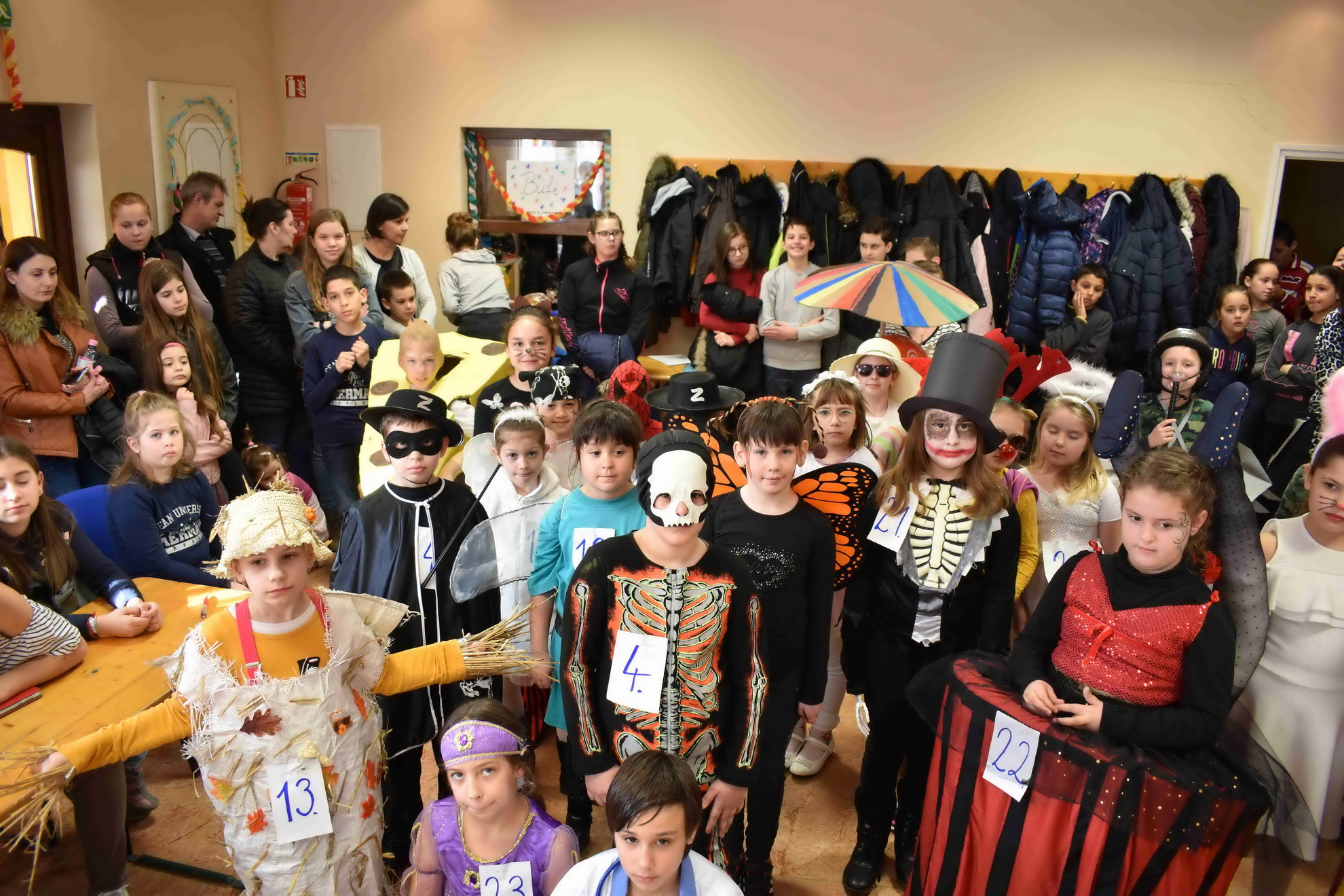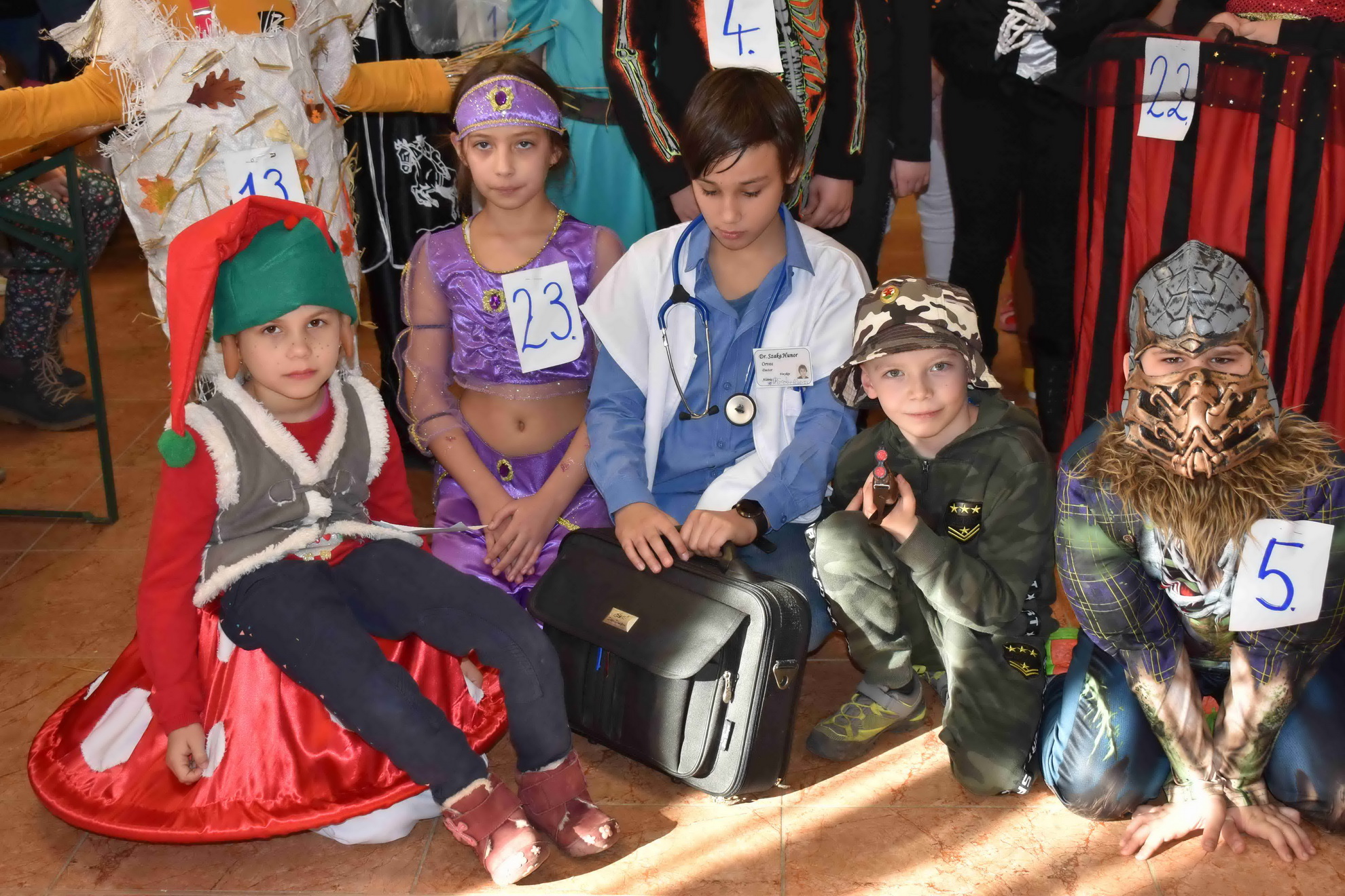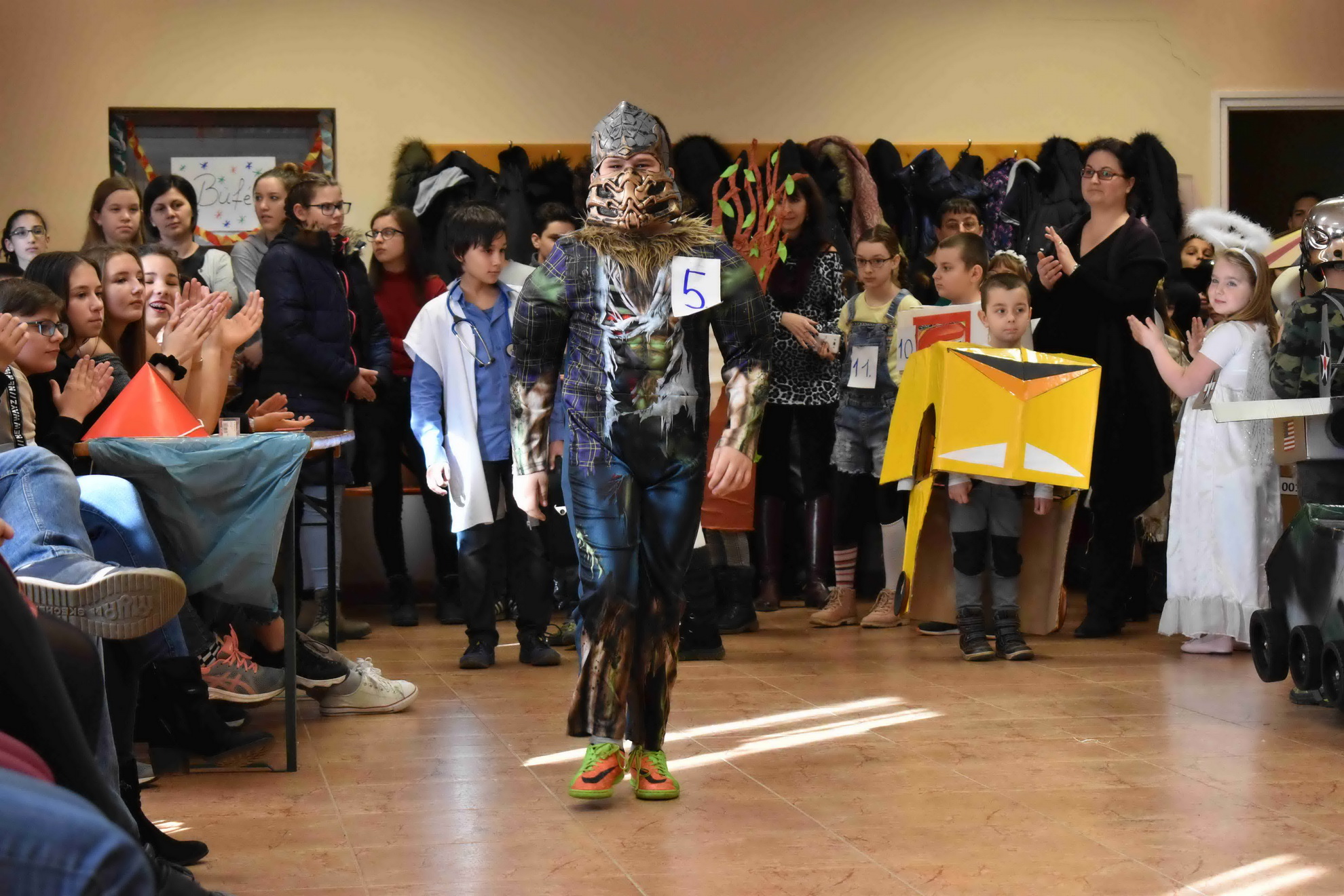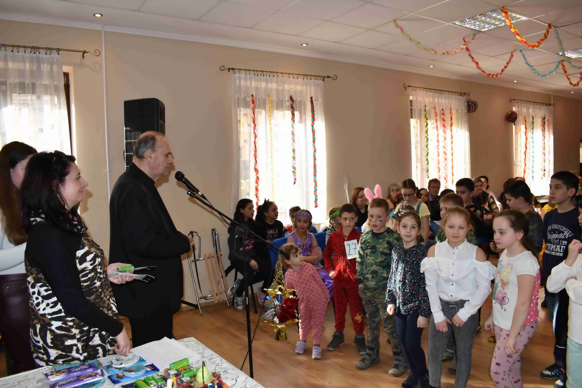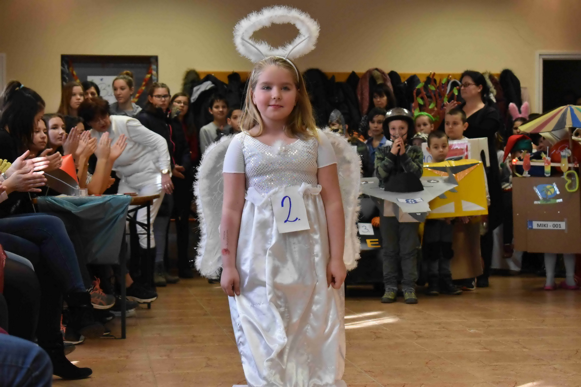 Az alsó és felső tagozatos tanulókat Kiss Iván c. prépost, esperes-plébános köszöntötte. A vidám hangulatot a világ népeit bemutató előadás alapozta meg, melyet Iván atya és a hitoktatók adtak elő. A mulatság ezután a szokásos és nagy izgalommal kísért jelmezversennyel folytatódott, ahol ismét sok gyermek vonult fel a jelenlévők és a szakértő zsűri előtt. Az idén is voltak különféle ötletes maskarák önálló és csoportos kategóriában. A nehéz helyzetben lévő bíráló bizottság ismét csak a leleményes megoldásokat díjazta, így például a TEK-et és a katonai repülést megjelentető „haditechnikai bemutatót”, a „fába szorult férget”, a „sajtkukacot”, a „transformers”-et, vagy éppen a „Mikulás szabadságra megy” című produkciót.