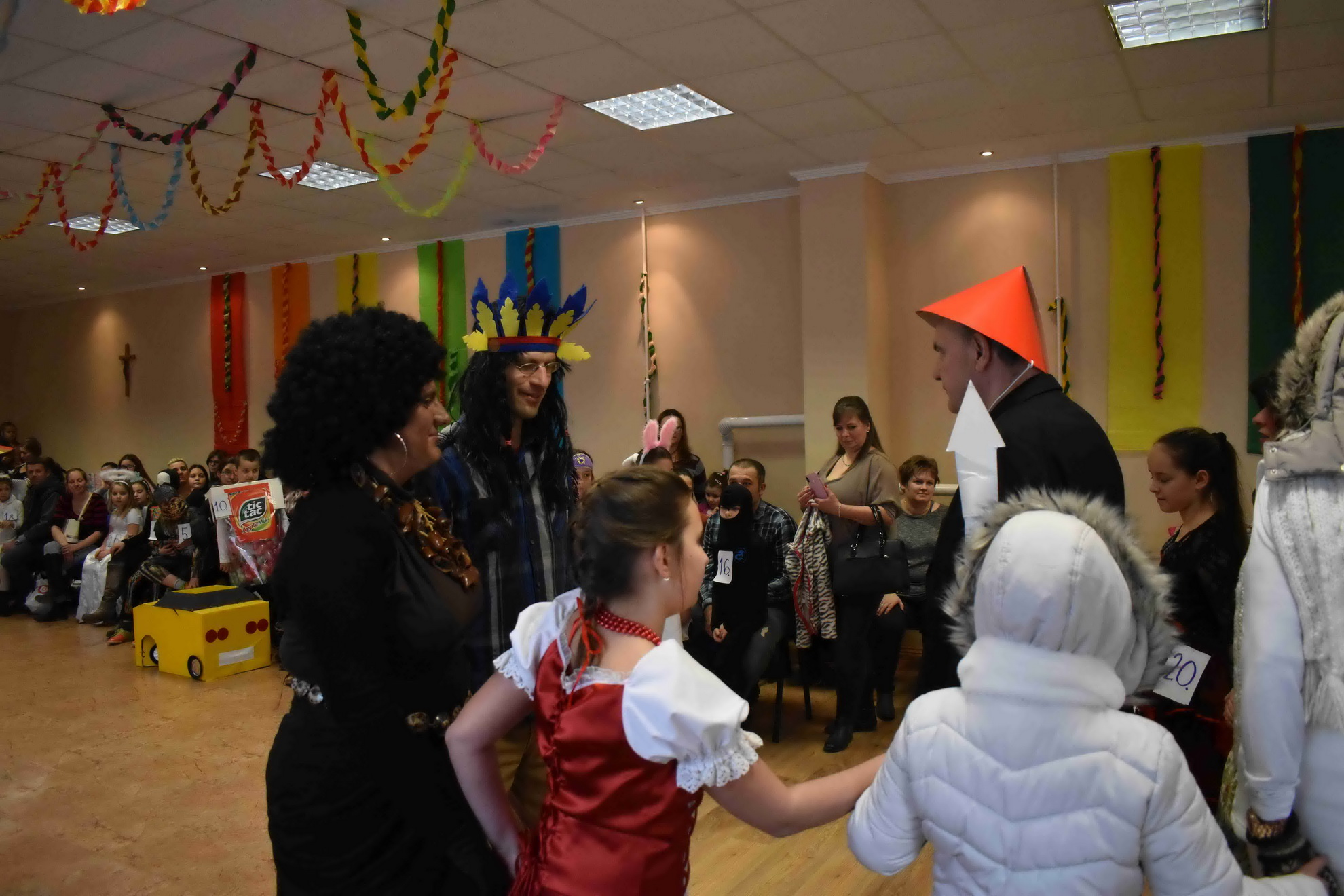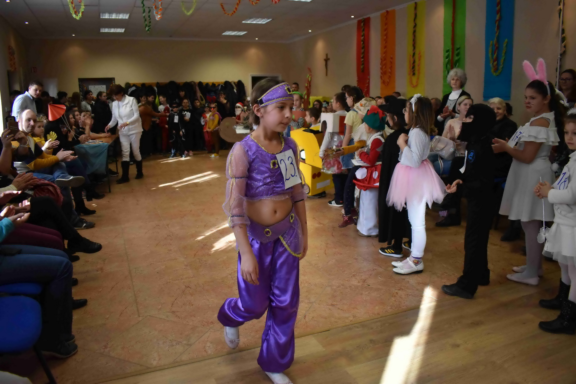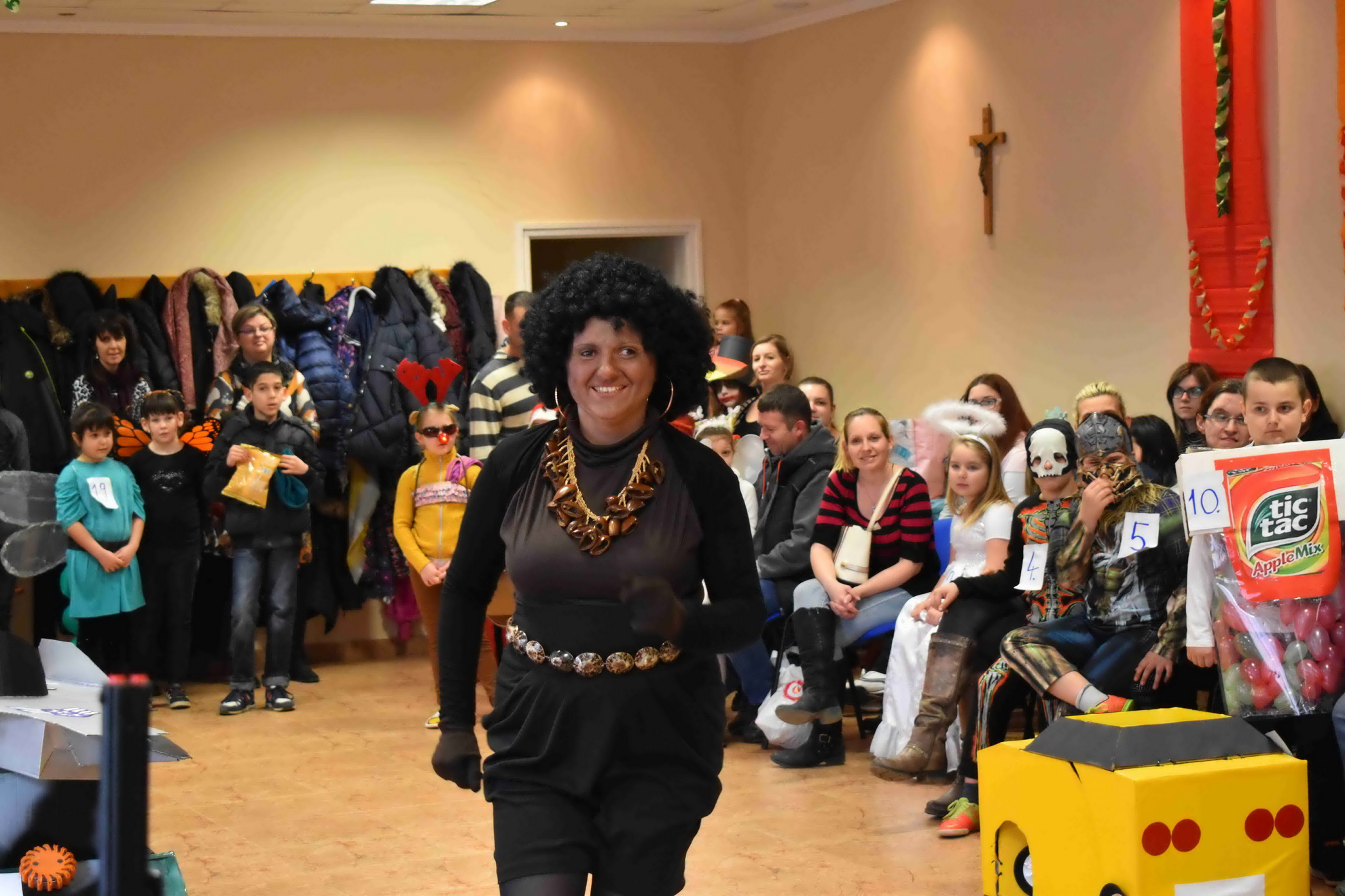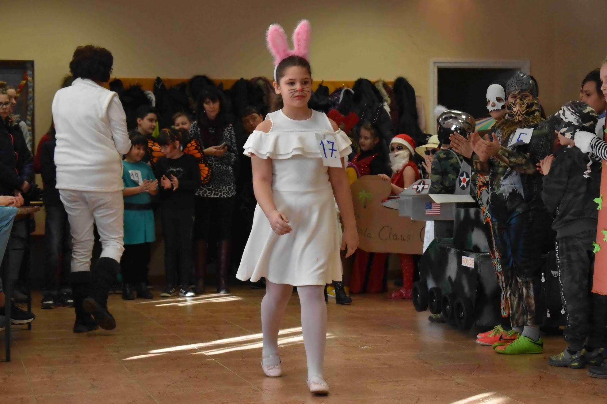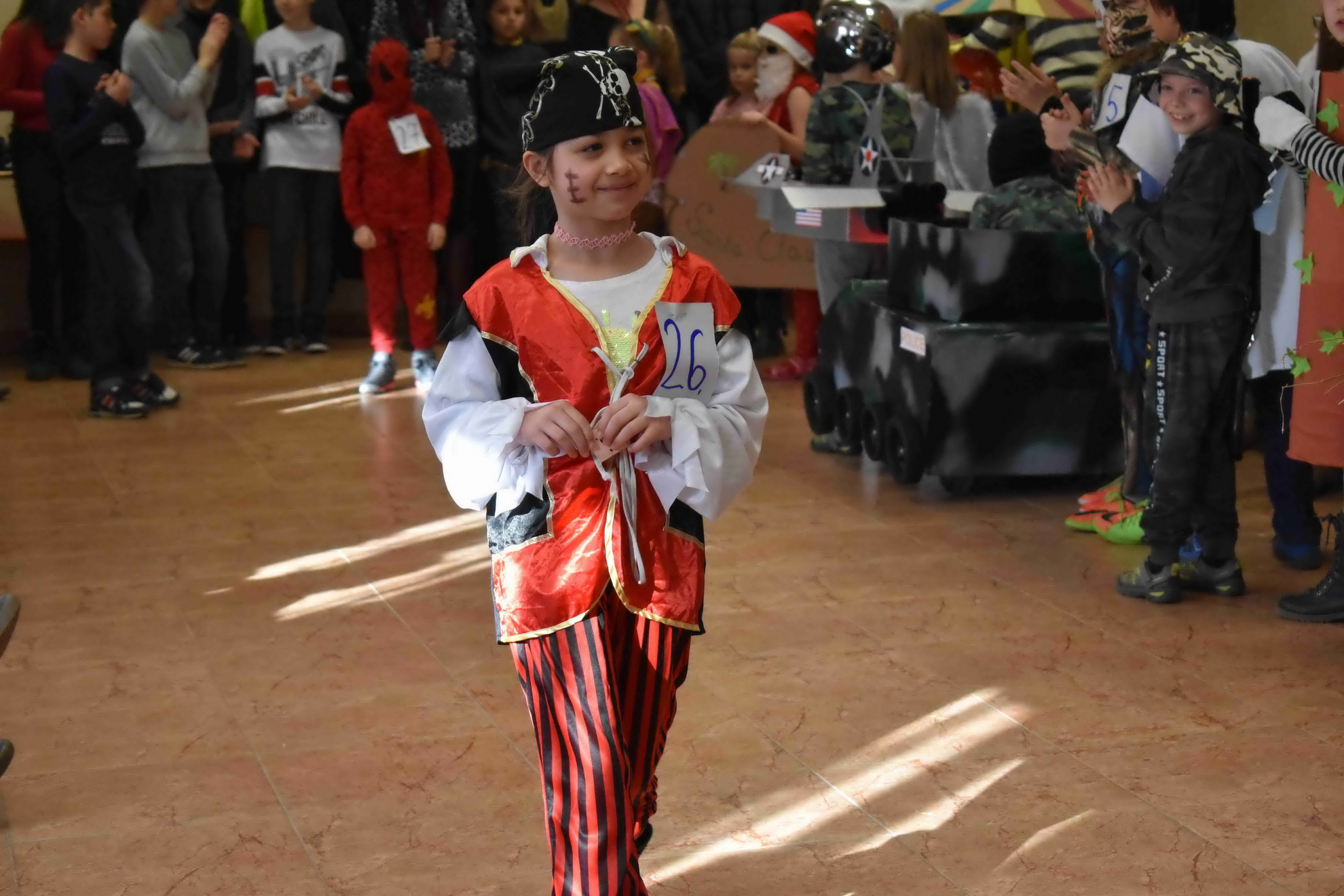 Az alsó és felső tagozatos tanulókat Kiss Iván c. prépost, esperes-plébános köszöntötte. A vidám hangulatot a világ népeit bemutató előadás alapozta meg, melyet Iván atya és a hitoktatók adtak elő. A mulatság ezután a szokásos és nagy izgalommal kísért jelmezversennyel folytatódott, ahol ismét sok gyermek vonult fel a jelenlévők és a szakértő zsűri előtt. Az idén is voltak különféle ötletes maskarák önálló és csoportos kategóriában. A nehéz helyzetben lévő bíráló bizottság ismét csak a leleményes megoldásokat díjazta, így például a TEK-et és a katonai repülést megjelentető „haditechnikai bemutatót”, a „fába szorult férget”, a „sajtkukacot”, a „transformers”-et, vagy éppen a „Mikulás szabadságra megy” című produkciót.