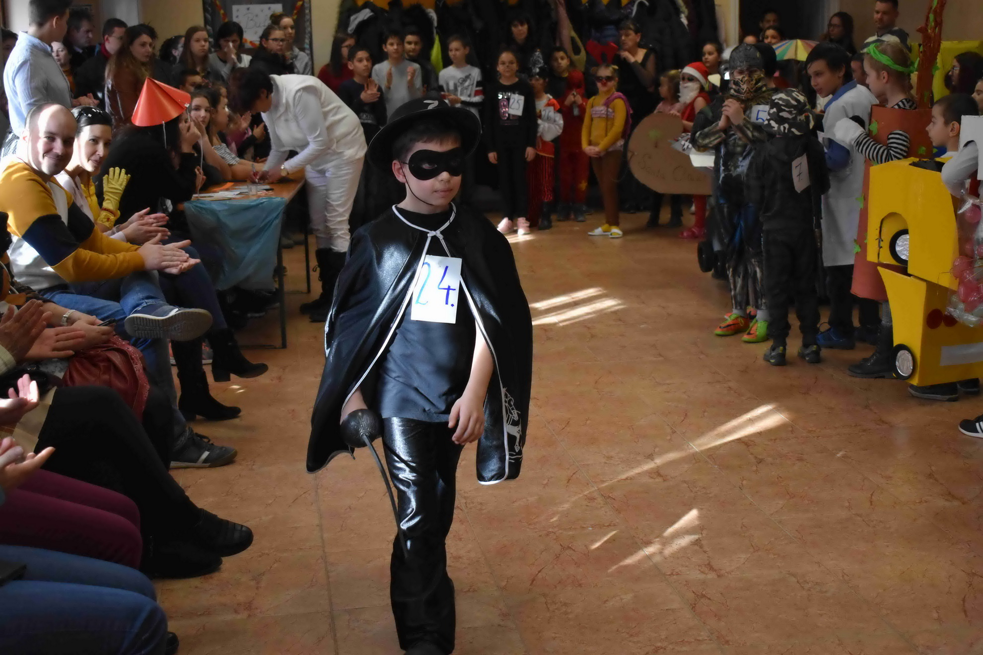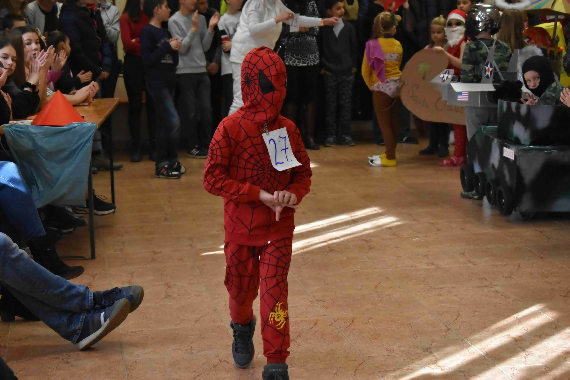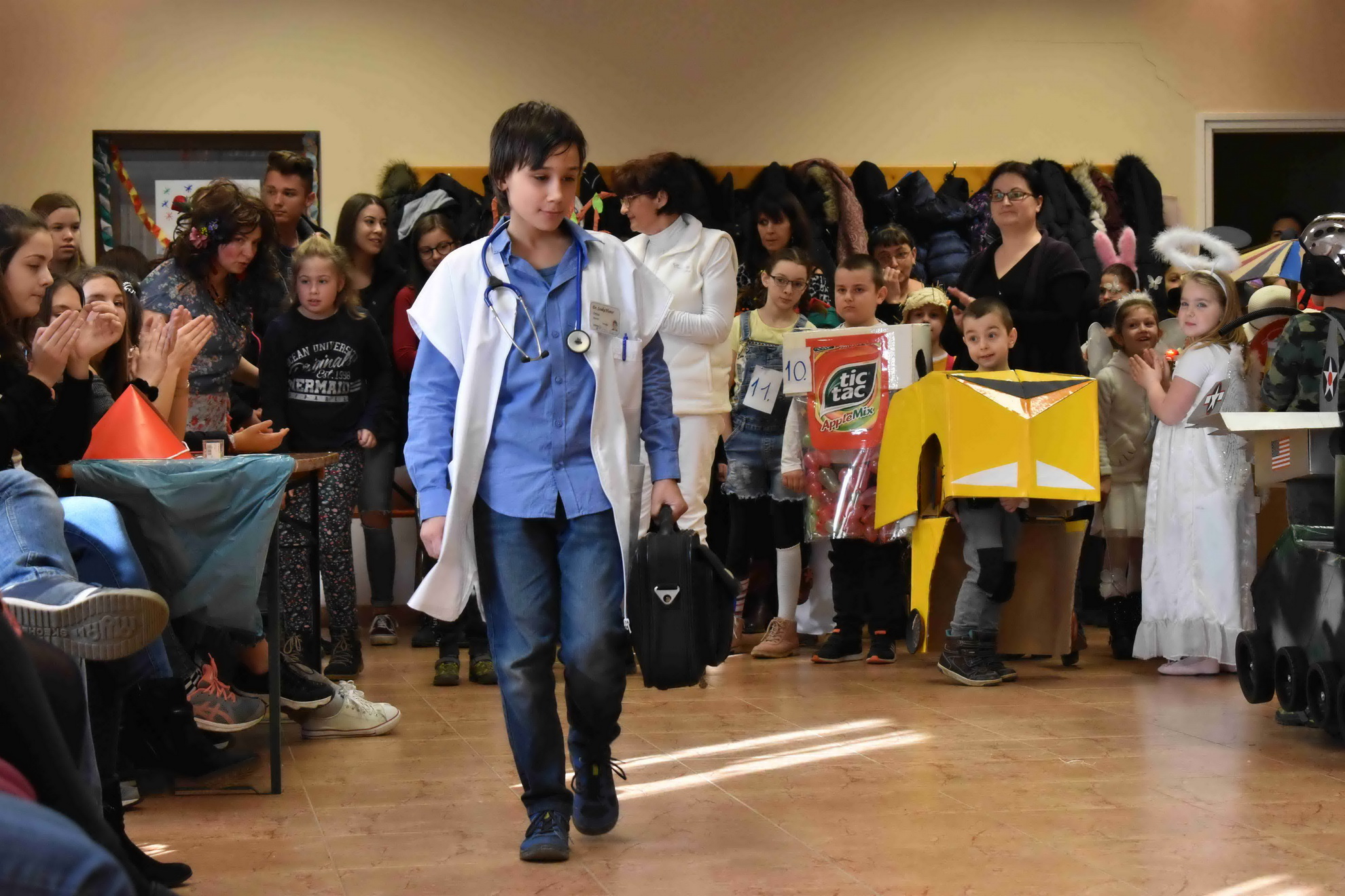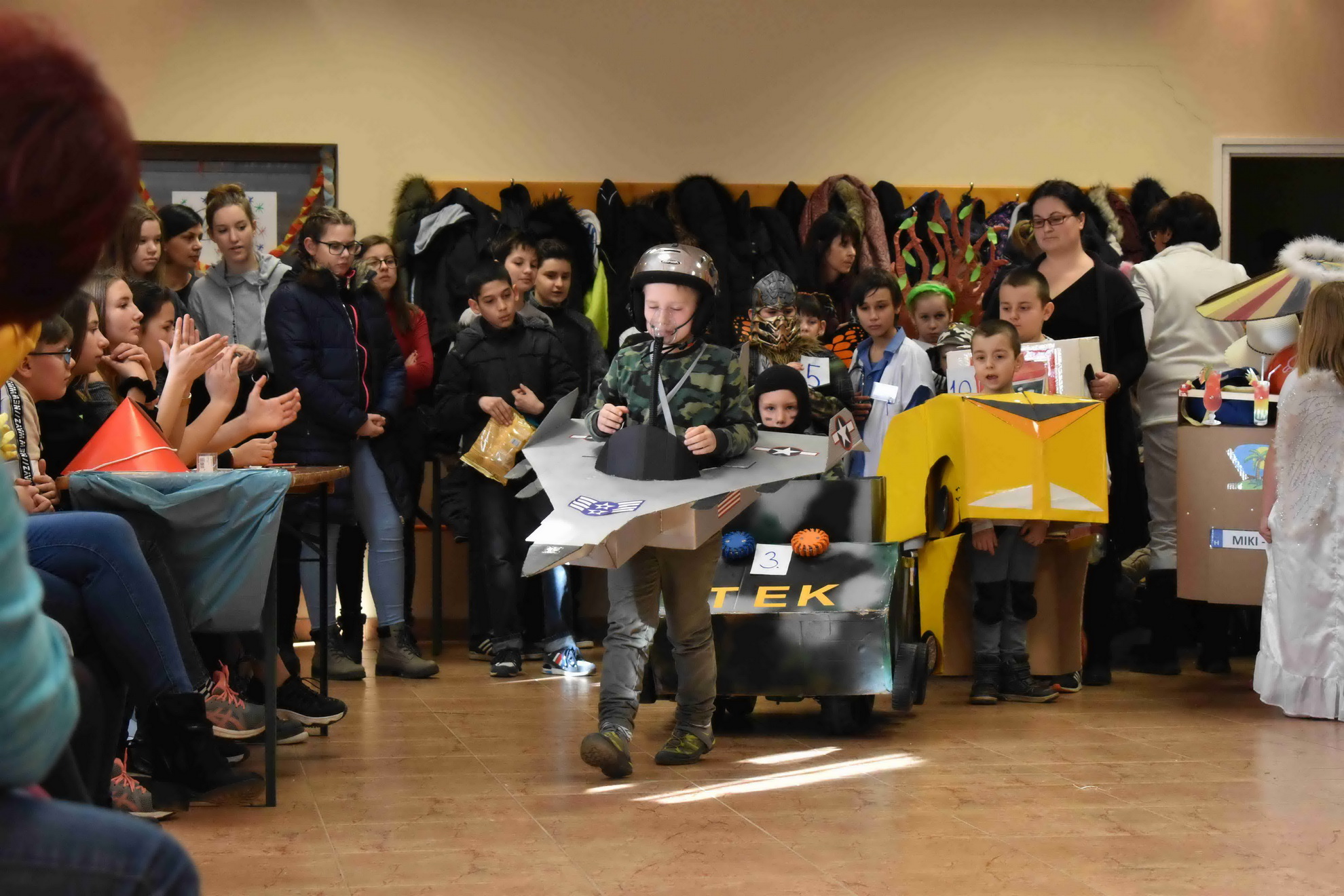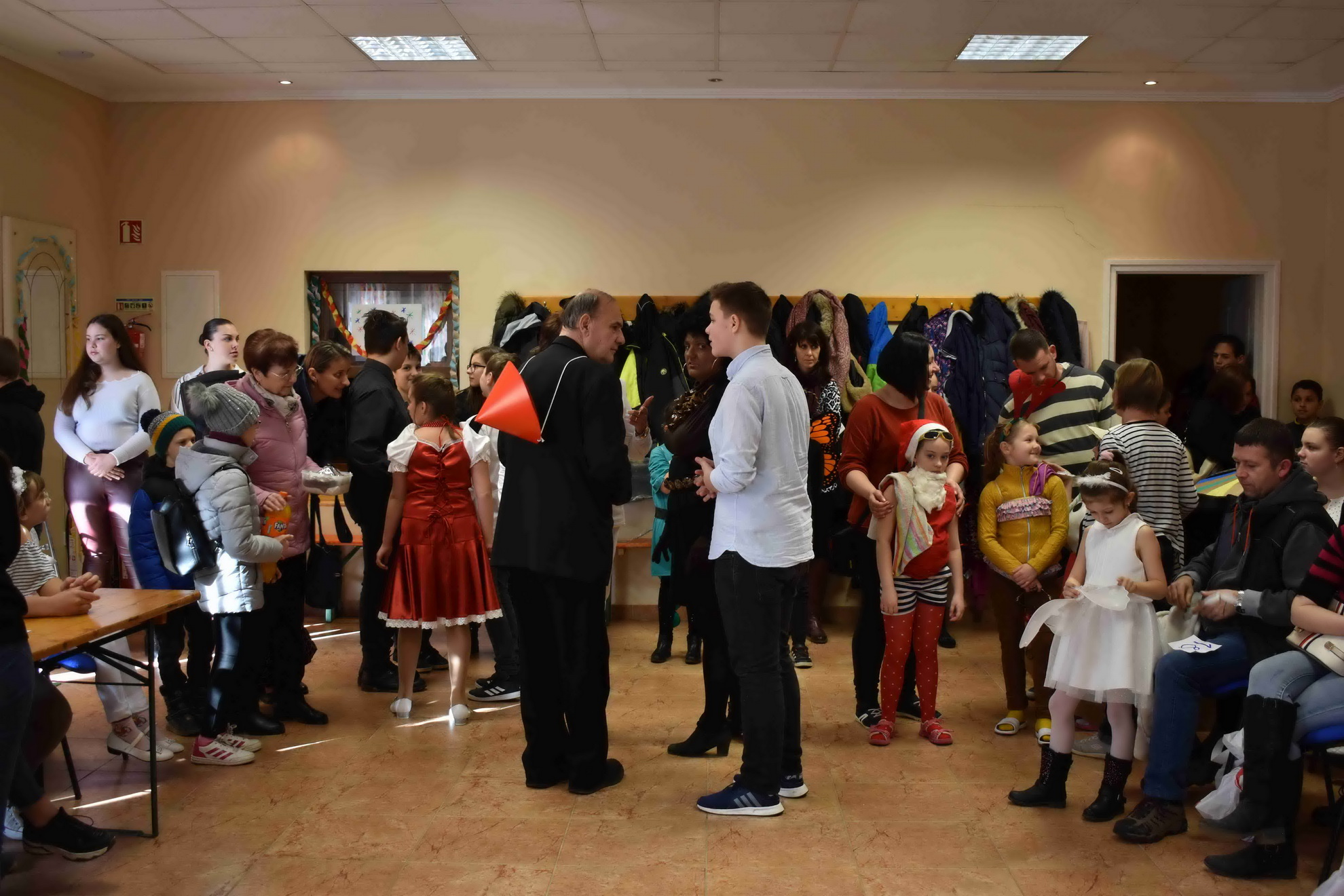 Az alsó és felső tagozatos tanulókat Kiss Iván c. prépost, esperes-plébános köszöntötte. A vidám hangulatot a világ népeit bemutató előadás alapozta meg, melyet Iván atya és a hitoktatók adtak elő. A mulatság ezután a szokásos és nagy izgalommal kísért jelmezversennyel folytatódott, ahol ismét sok gyermek vonult fel a jelenlévők és a szakértő zsűri előtt. Az idén is voltak különféle ötletes maskarák önálló és csoportos kategóriában. A nehéz helyzetben lévő bíráló bizottság ismét csak a leleményes megoldásokat díjazta, így például a TEK-et és a katonai repülést megjelentető „haditechnikai bemutatót”, a „fába szorult férget”, a „sajtkukacot”, a „transformers”-et, vagy éppen a „Mikulás szabadságra megy” című produkciót.