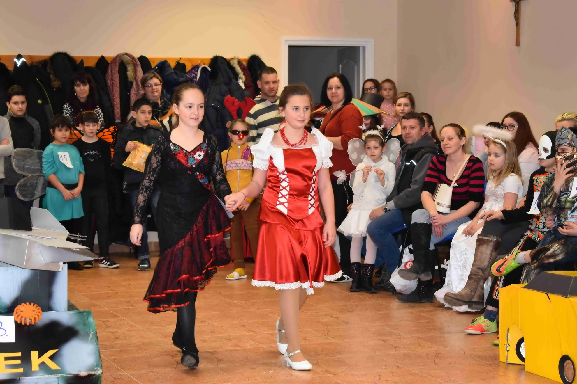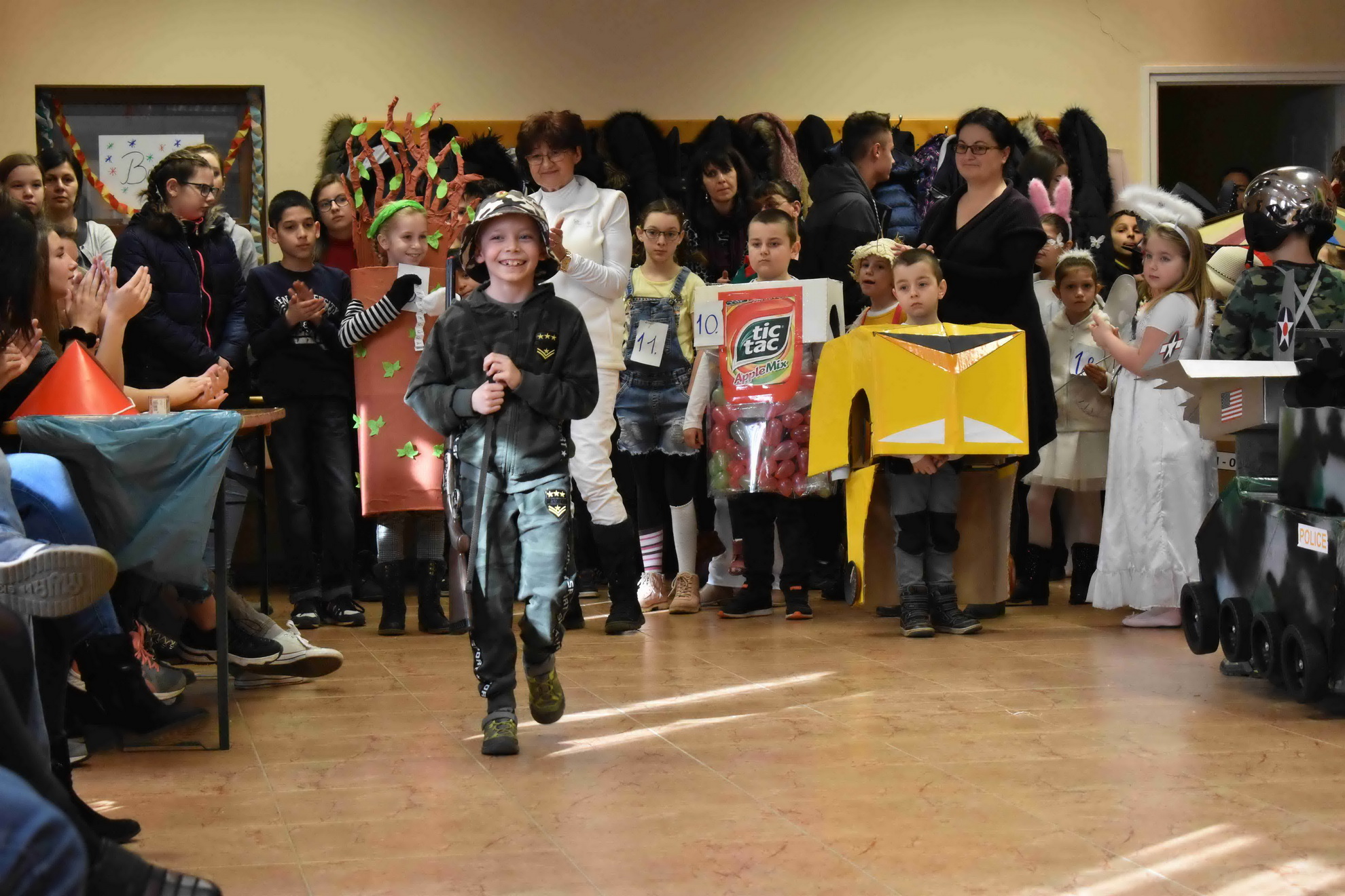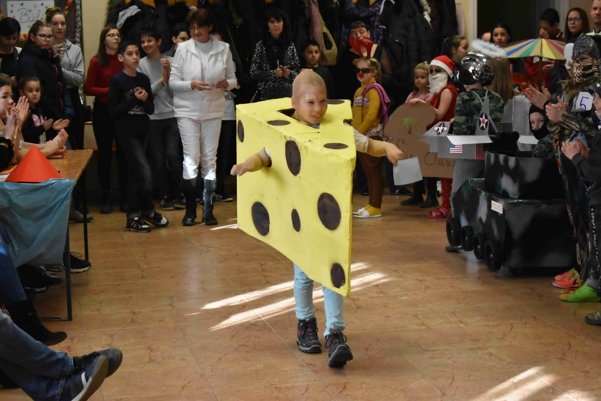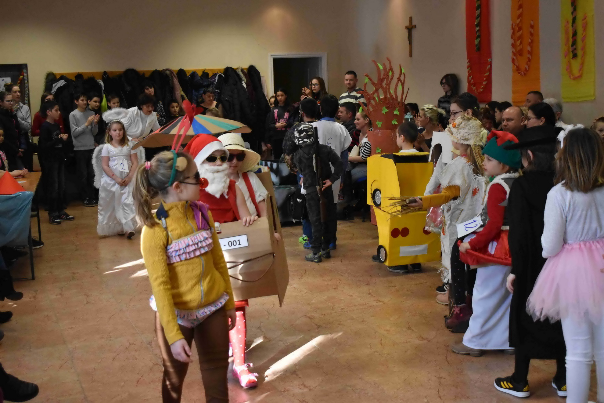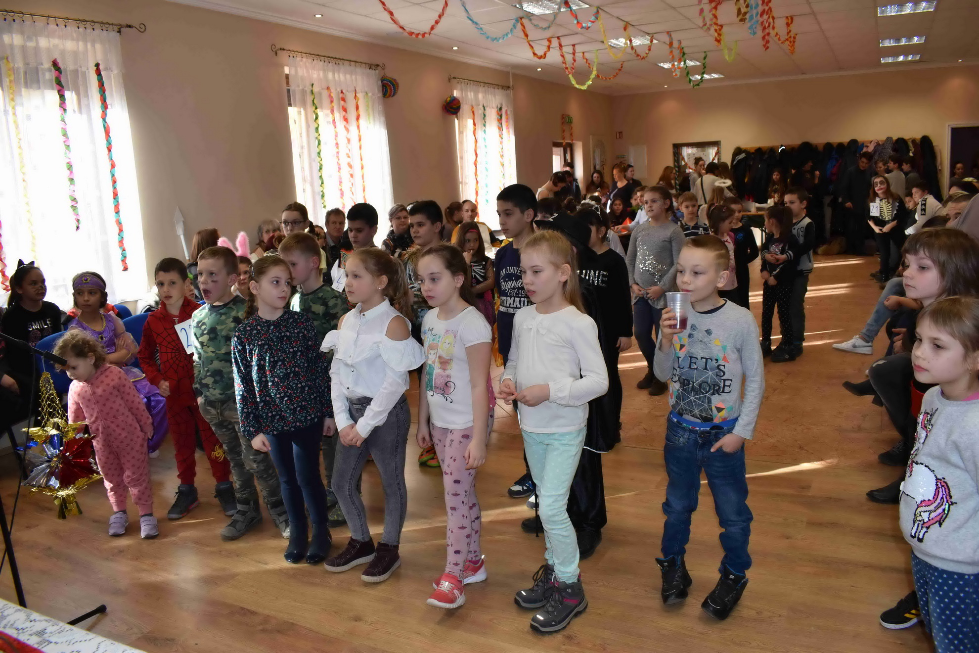 Az alsó és felső tagozatos tanulókat Kiss Iván c. prépost, esperes-plébános köszöntötte. A vidám hangulatot a világ népeit bemutató előadás alapozta meg, melyet Iván atya és a hitoktatók adtak elő. A mulatság ezután a szokásos és nagy izgalommal kísért jelmezversennyel folytatódott, ahol ismét sok gyermek vonult fel a jelenlévők és a szakértő zsűri előtt. Az idén is voltak különféle ötletes maskarák önálló és csoportos kategóriában. A nehéz helyzetben lévő bíráló bizottság ismét csak a leleményes megoldásokat díjazta, így például a TEK-et és a katonai repülést megjelentető „haditechnikai bemutatót”, a „fába szorult férget”, a „sajtkukacot”, a „transformers”-et, vagy éppen a „Mikulás szabadságra megy” című produkciót.