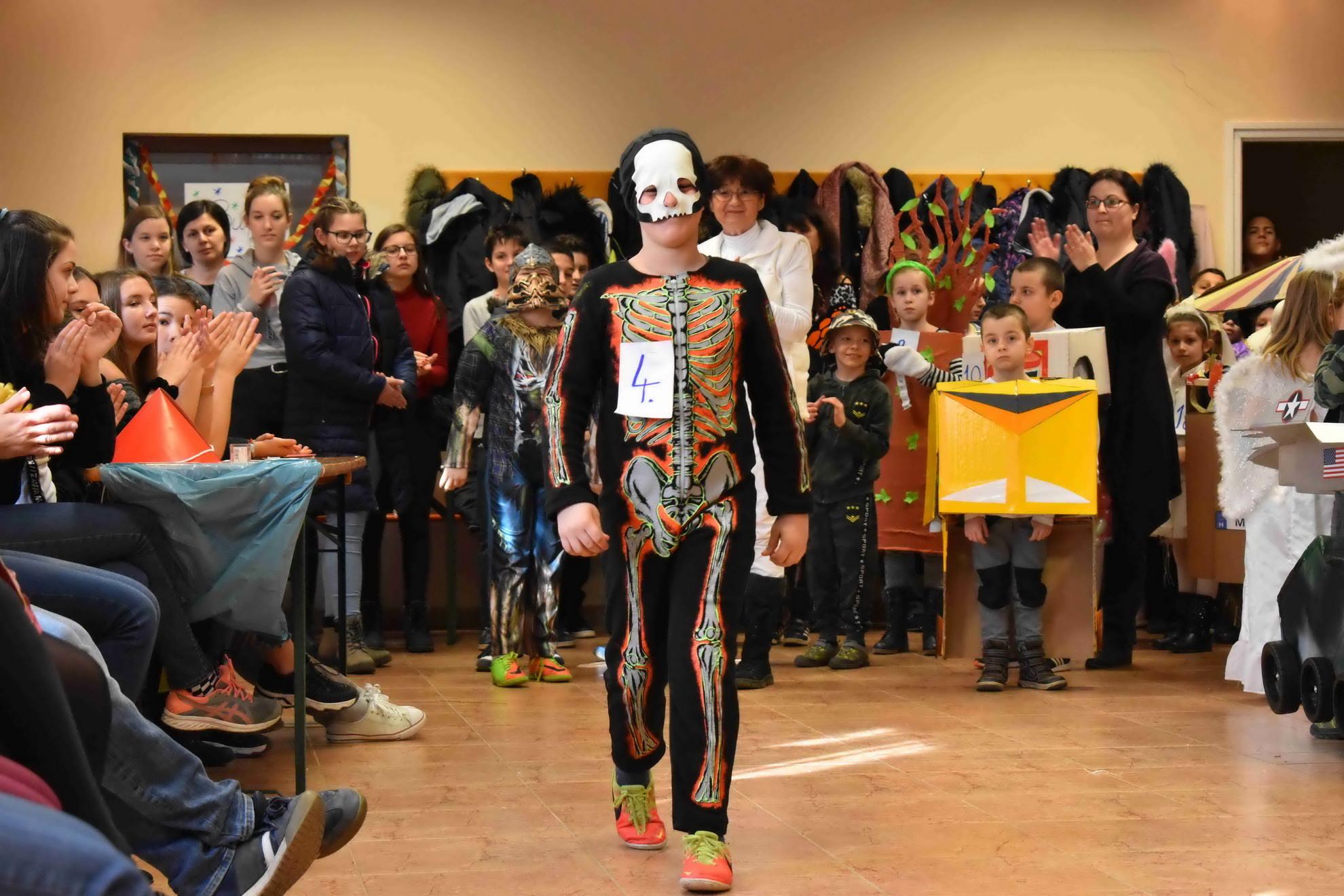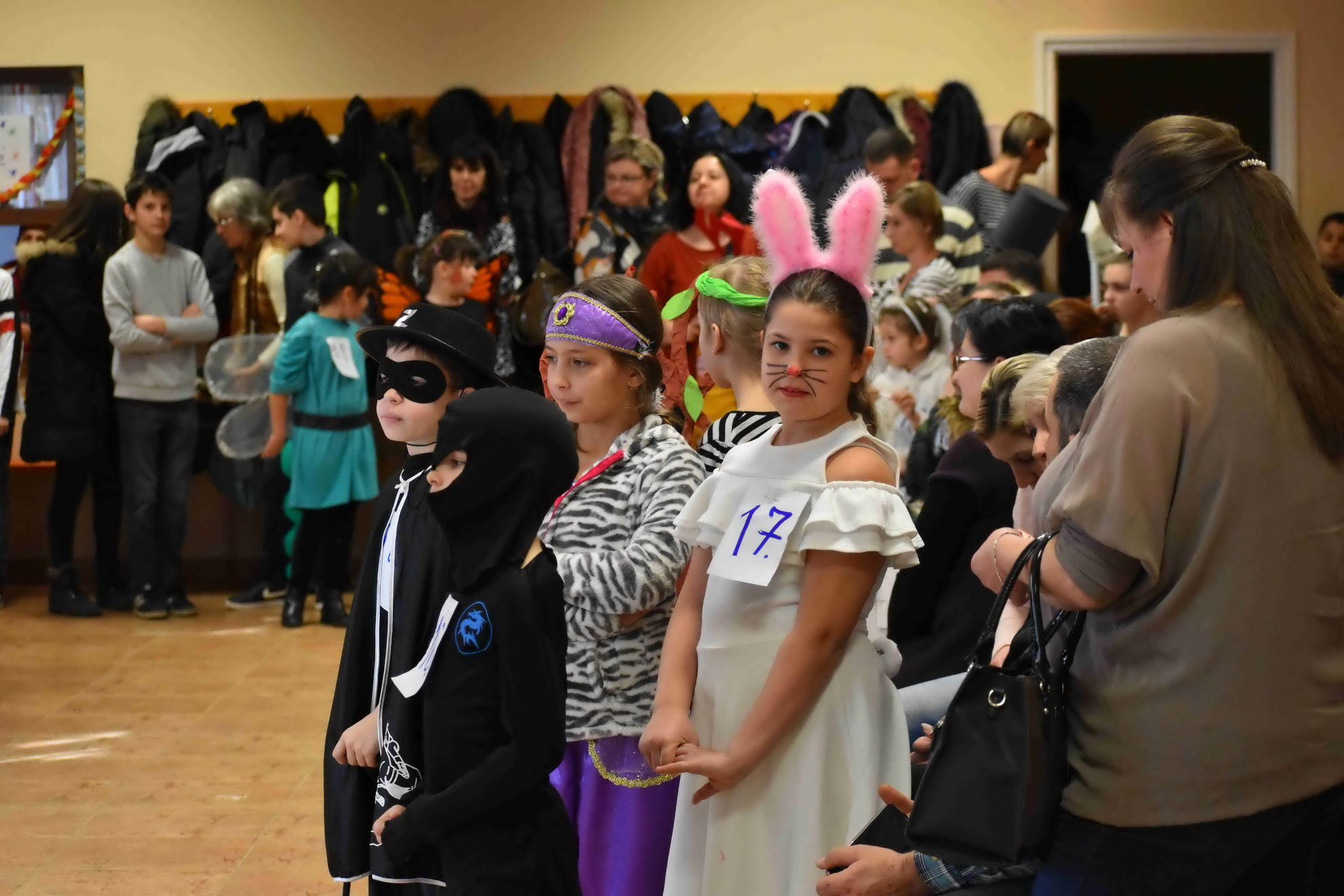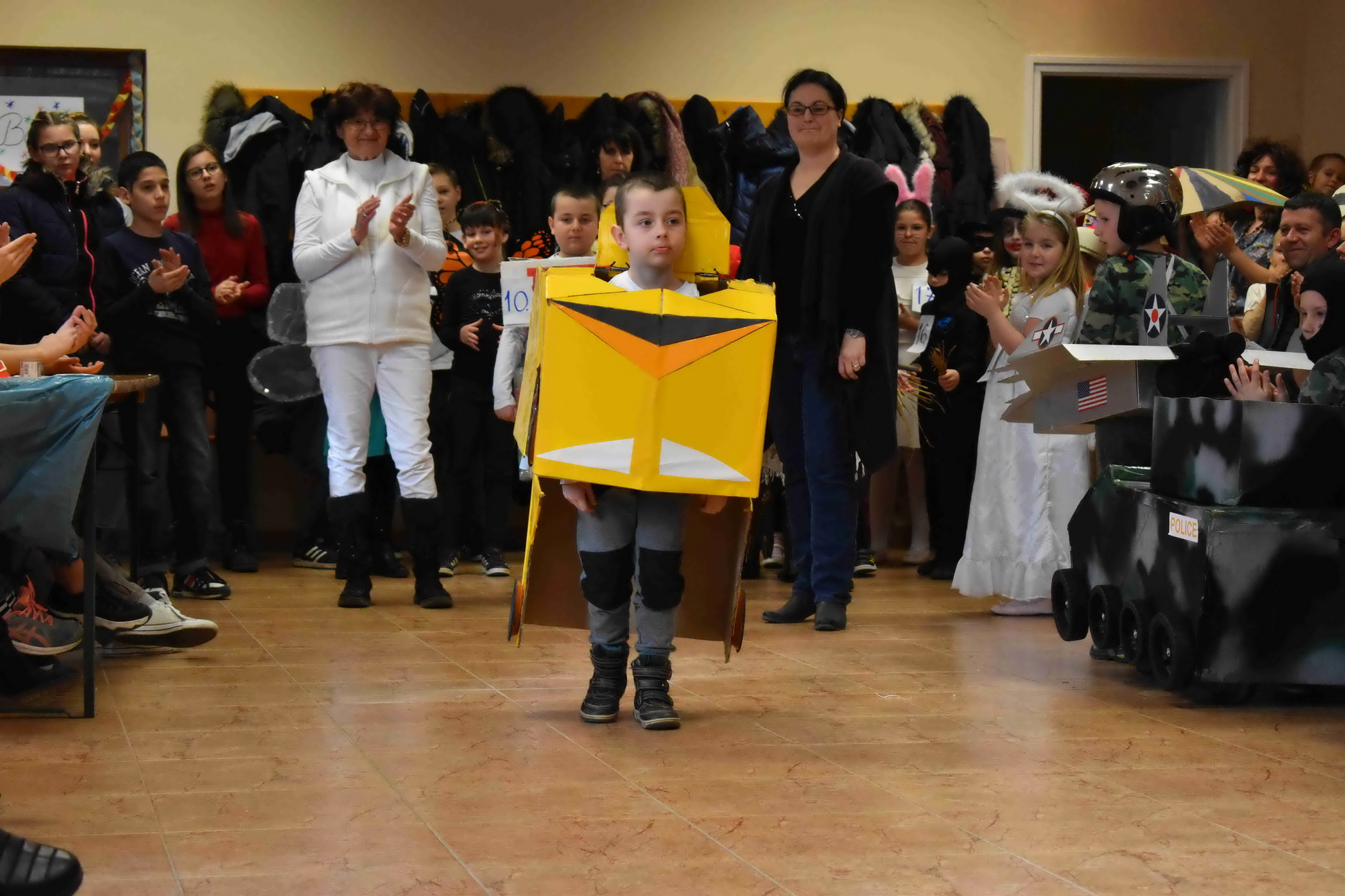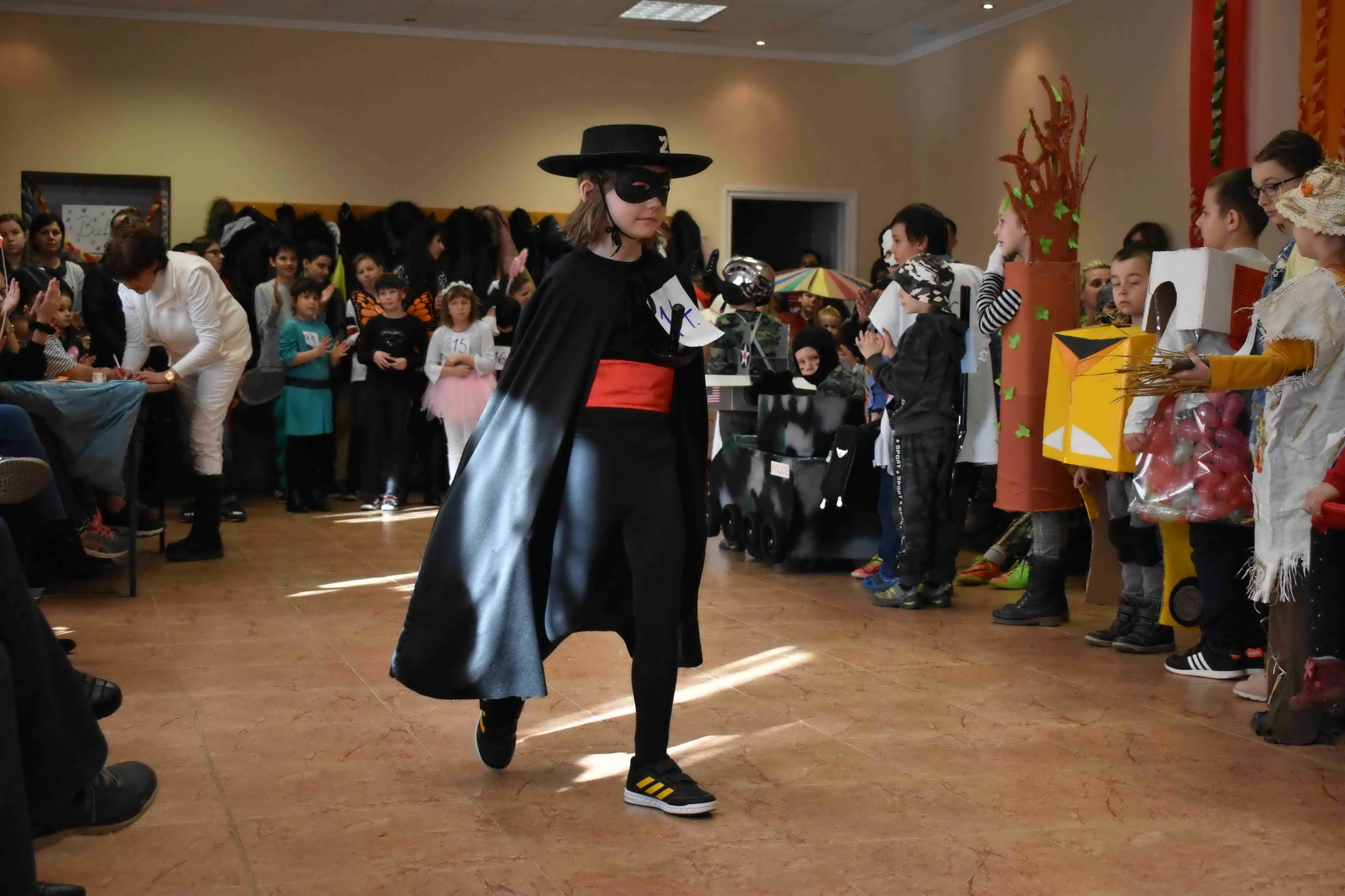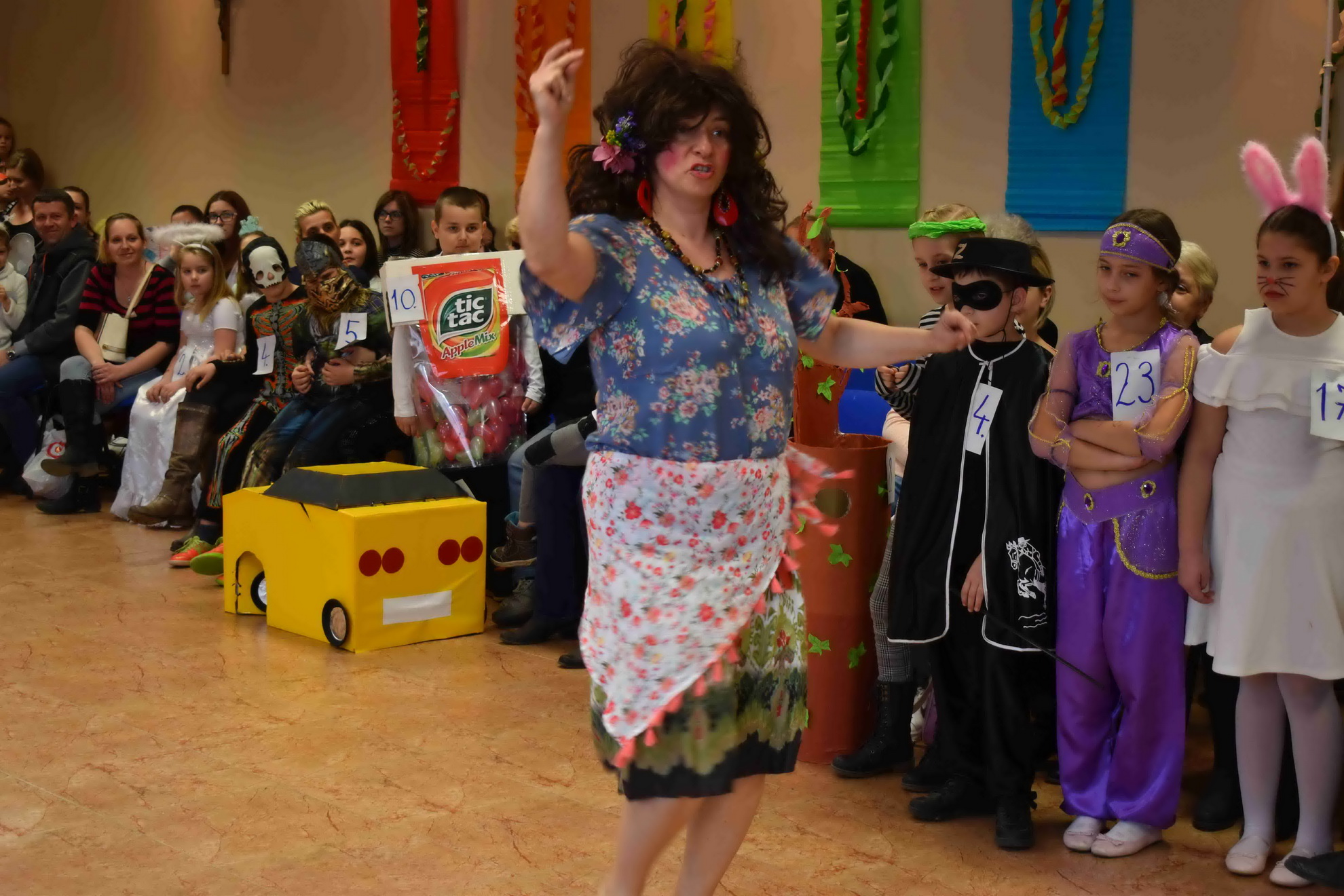 Az alsó és felső tagozatos tanulókat Kiss Iván c. prépost, esperes-plébános köszöntötte. A vidám hangulatot a világ népeit bemutató előadás alapozta meg, melyet Iván atya és a hitoktatók adtak elő. A mulatság ezután a szokásos és nagy izgalommal kísért jelmezversennyel folytatódott, ahol ismét sok gyermek vonult fel a jelenlévők és a szakértő zsűri előtt. Az idén is voltak különféle ötletes maskarák önálló és csoportos kategóriában. A nehéz helyzetben lévő bíráló bizottság ismét csak a leleményes megoldásokat díjazta, így például a TEK-et és a katonai repülést megjelentető „haditechnikai bemutatót”, a „fába szorult férget”, a „sajtkukacot”, a „transformers”-et, vagy éppen a „Mikulás szabadságra megy” című produkciót.
