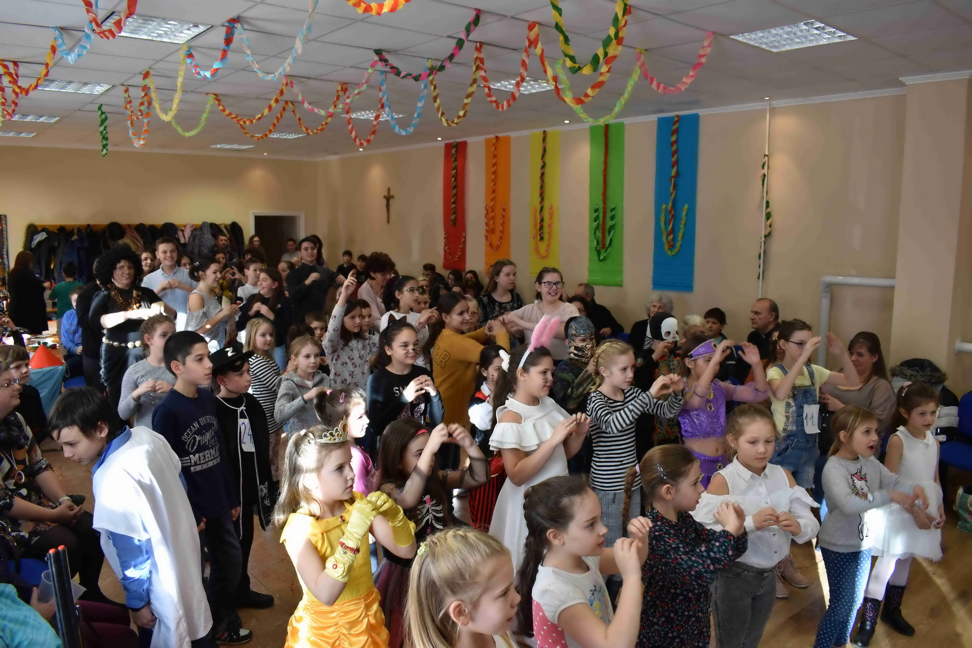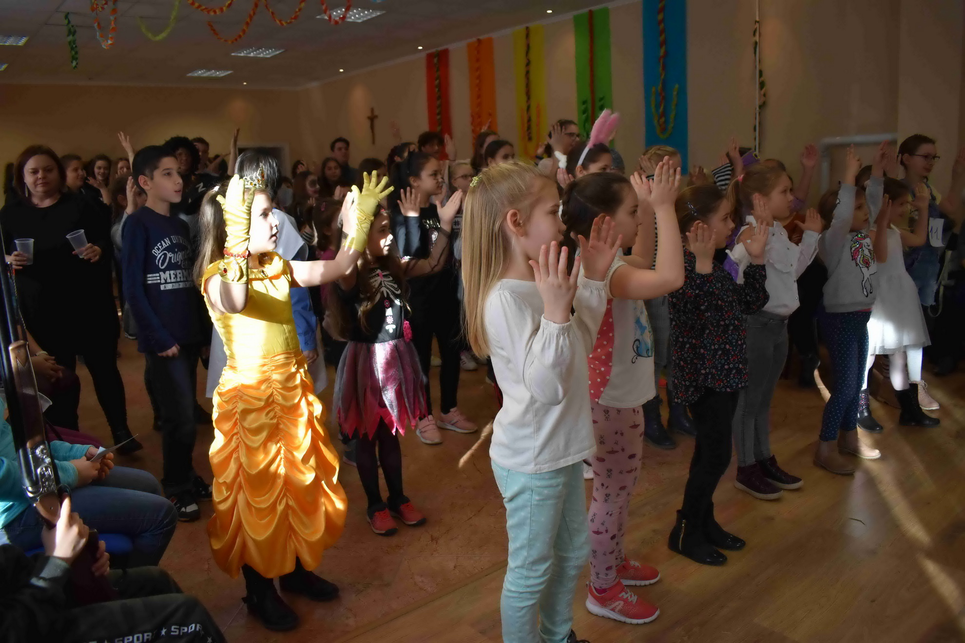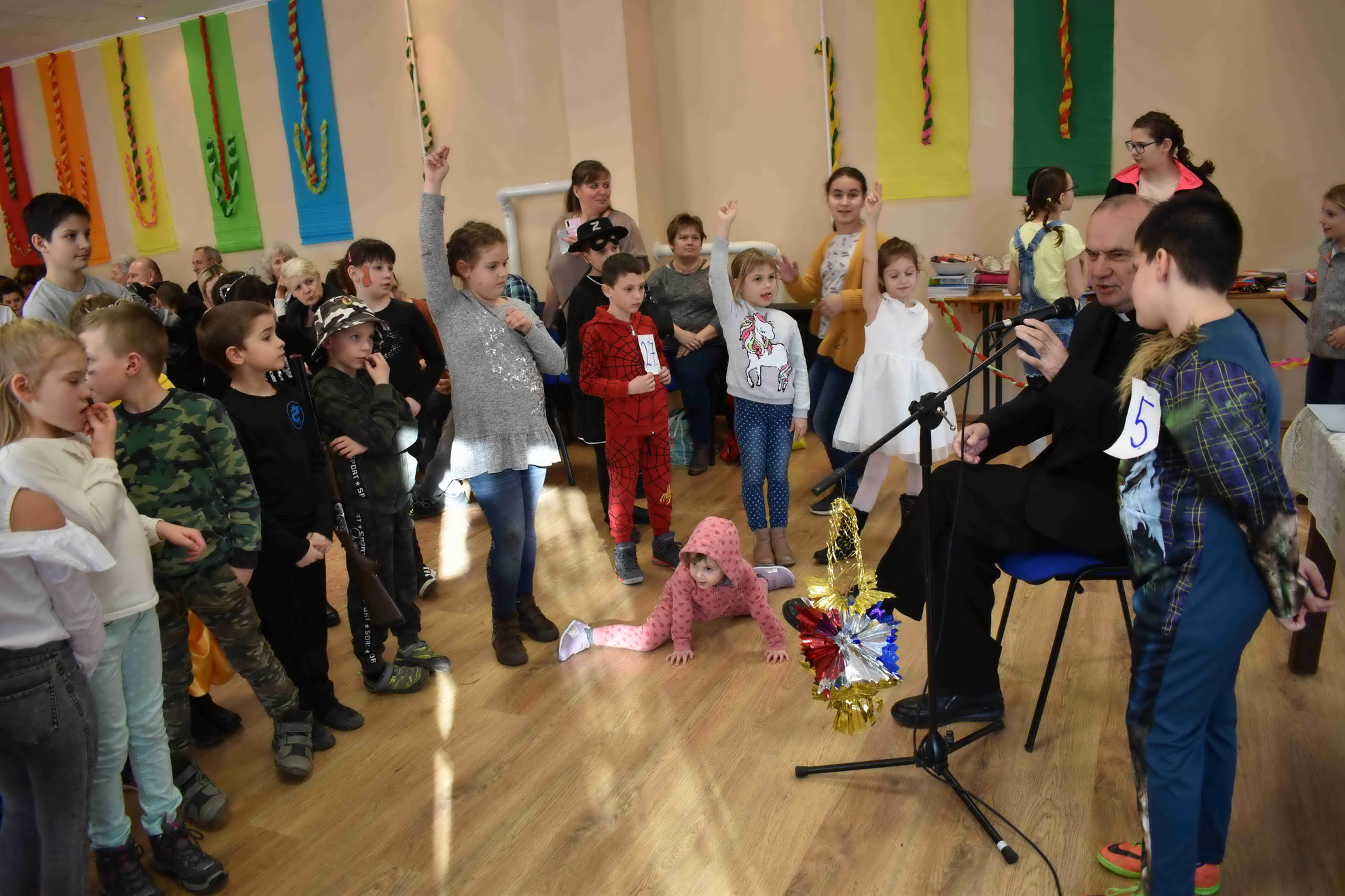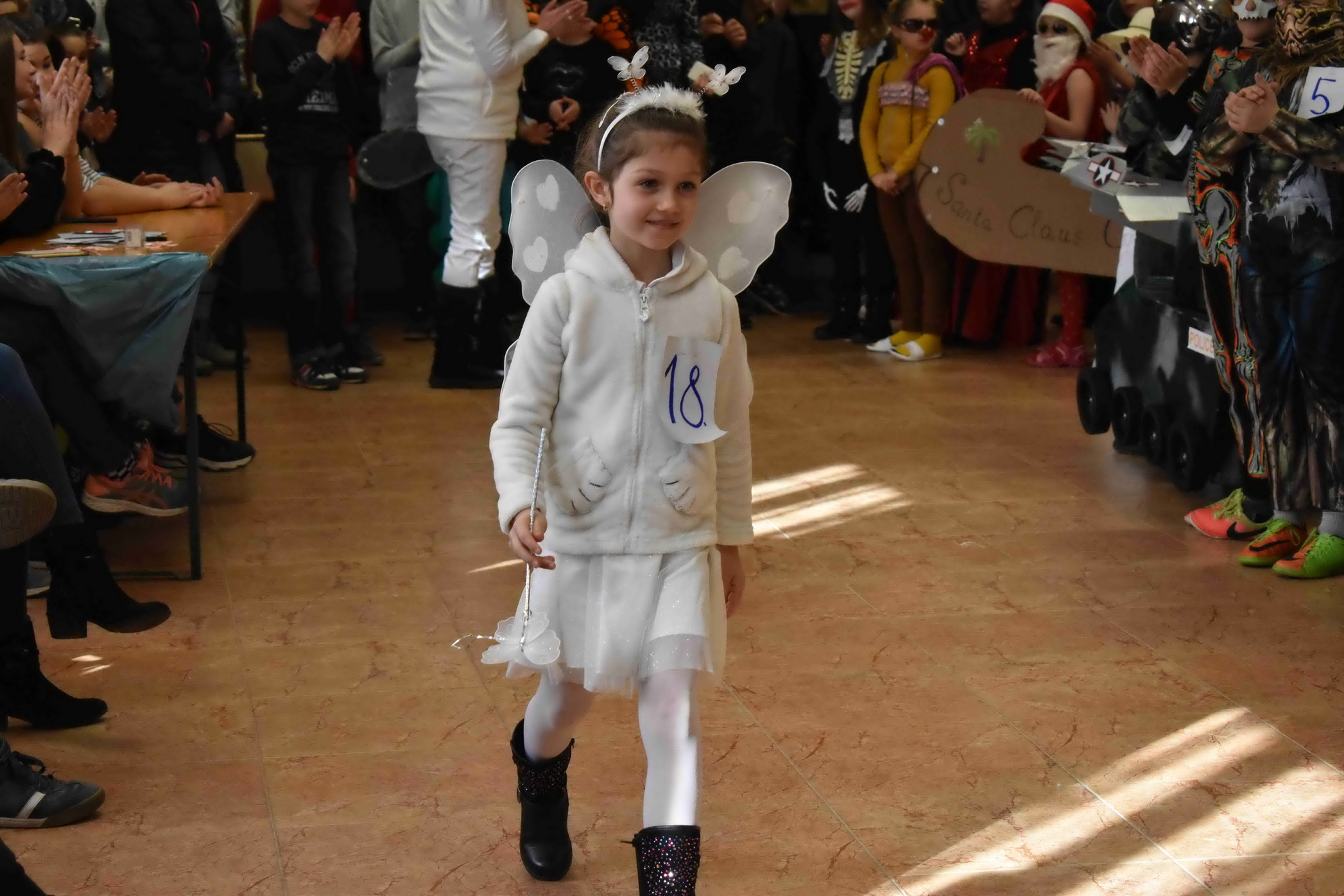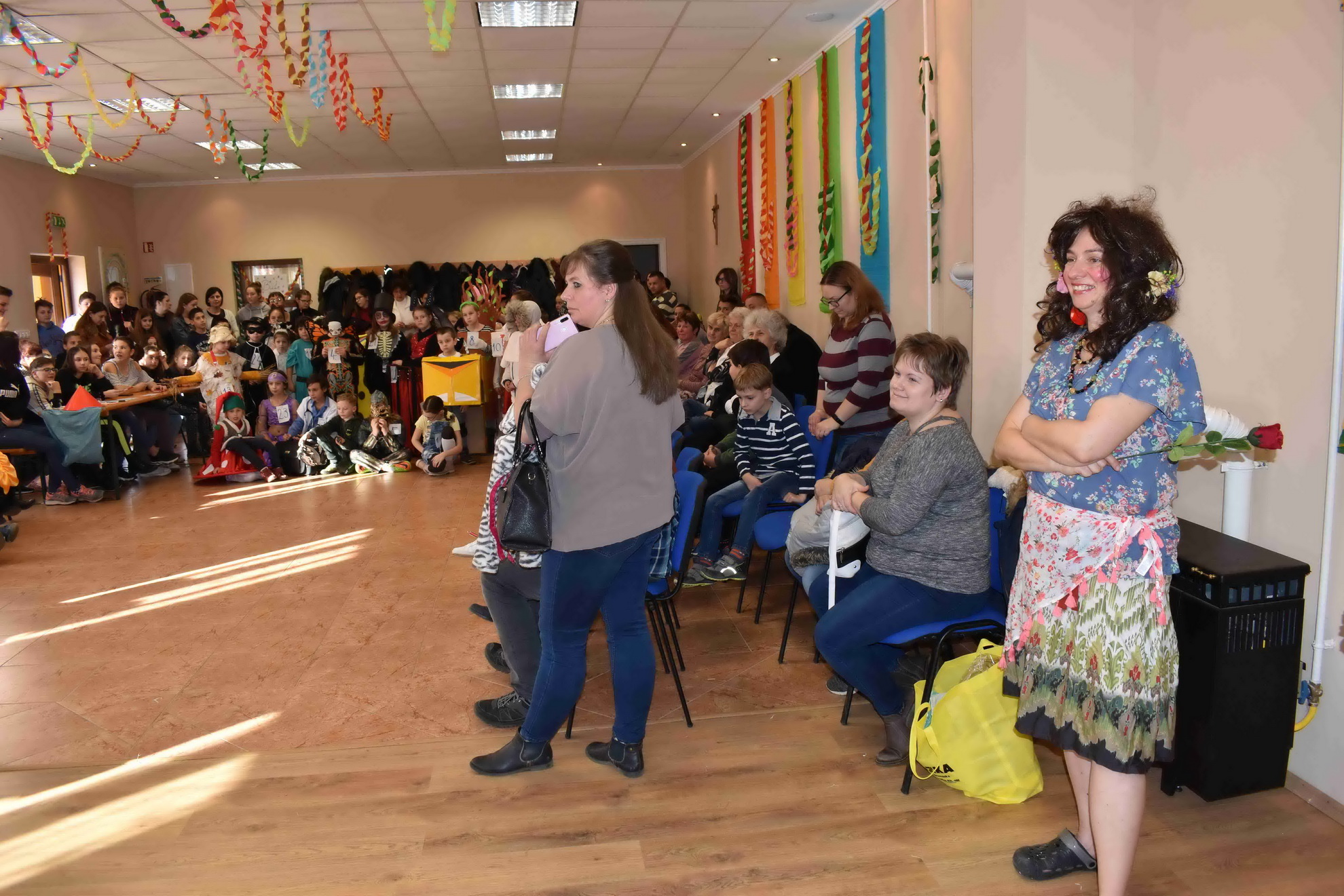 Az alsó és felső tagozatos tanulókat Kiss Iván c. prépost, esperes-plébános köszöntötte. A vidám hangulatot a világ népeit bemutató előadás alapozta meg, melyet Iván atya és a hitoktatók adtak elő. A mulatság ezután a szokásos és nagy izgalommal kísért jelmezversennyel folytatódott, ahol ismét sok gyermek vonult fel a jelenlévők és a szakértő zsűri előtt. Az idén is voltak különféle ötletes maskarák önálló és csoportos kategóriában. A nehéz helyzetben lévő bíráló bizottság ismét csak a leleményes megoldásokat díjazta, így például a TEK-et és a katonai repülést megjelentető „haditechnikai bemutatót”, a „fába szorult férget”, a „sajtkukacot”, a „transformers”-et, vagy éppen a „Mikulás szabadságra megy” című produkciót.