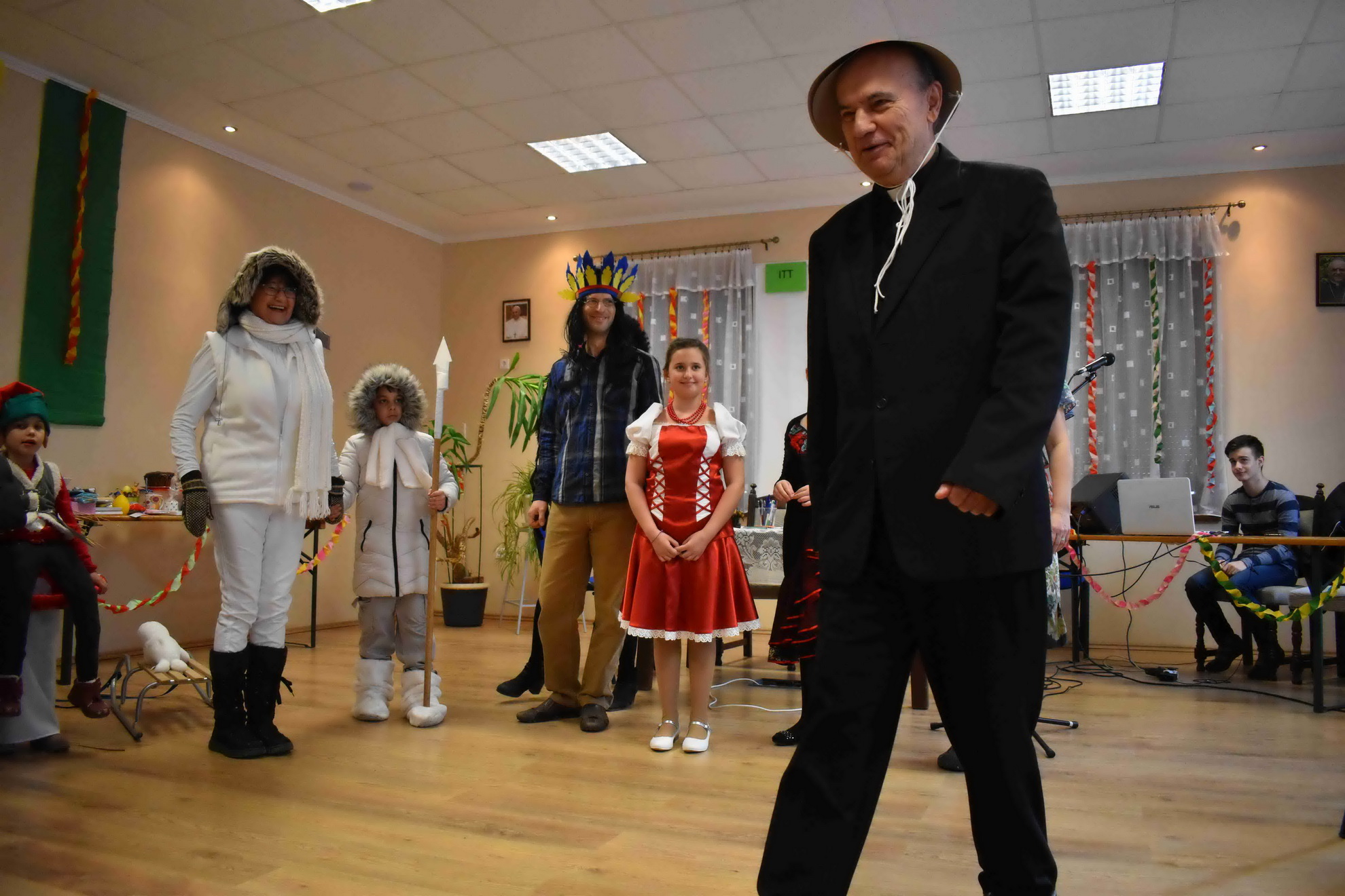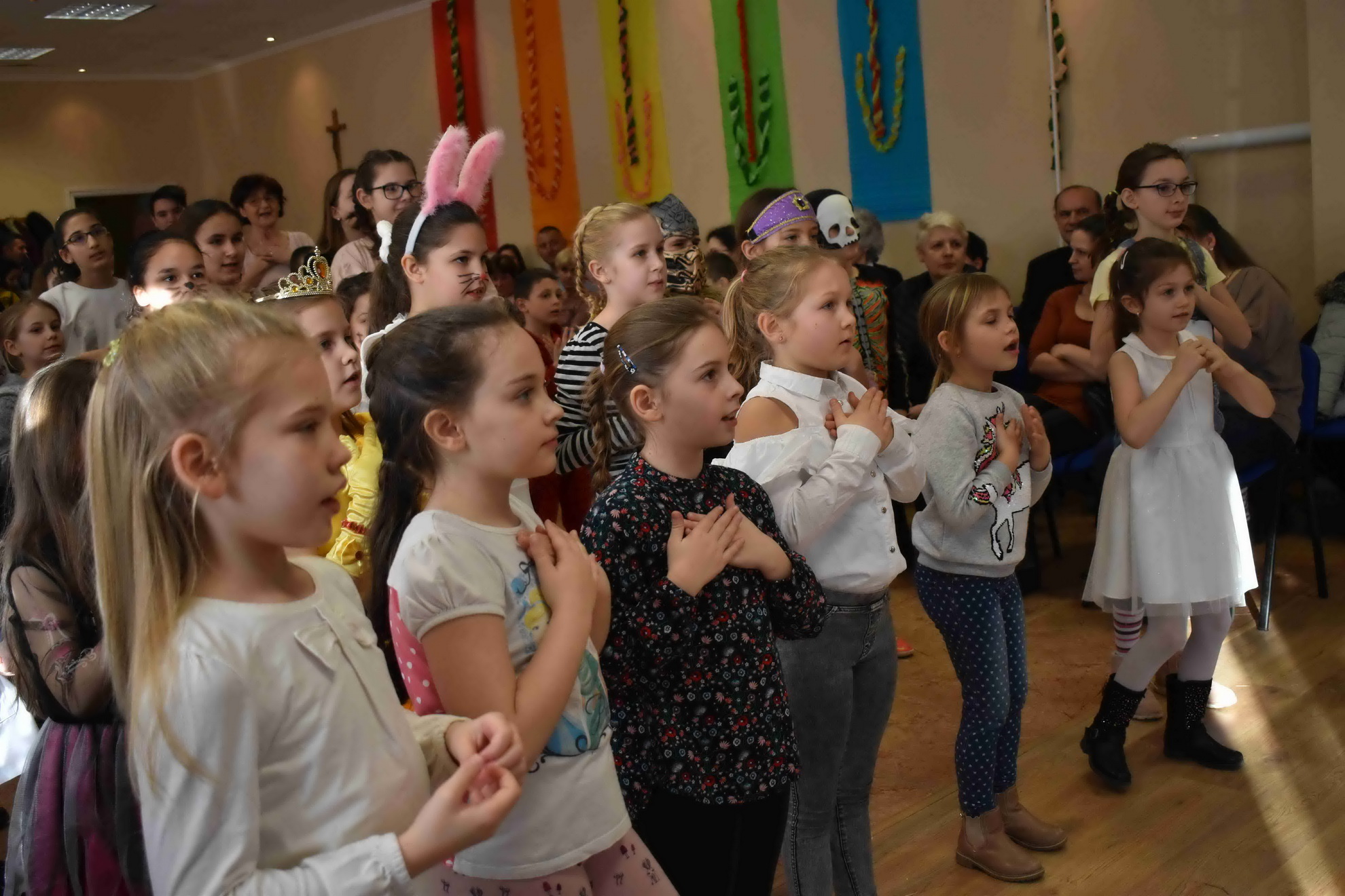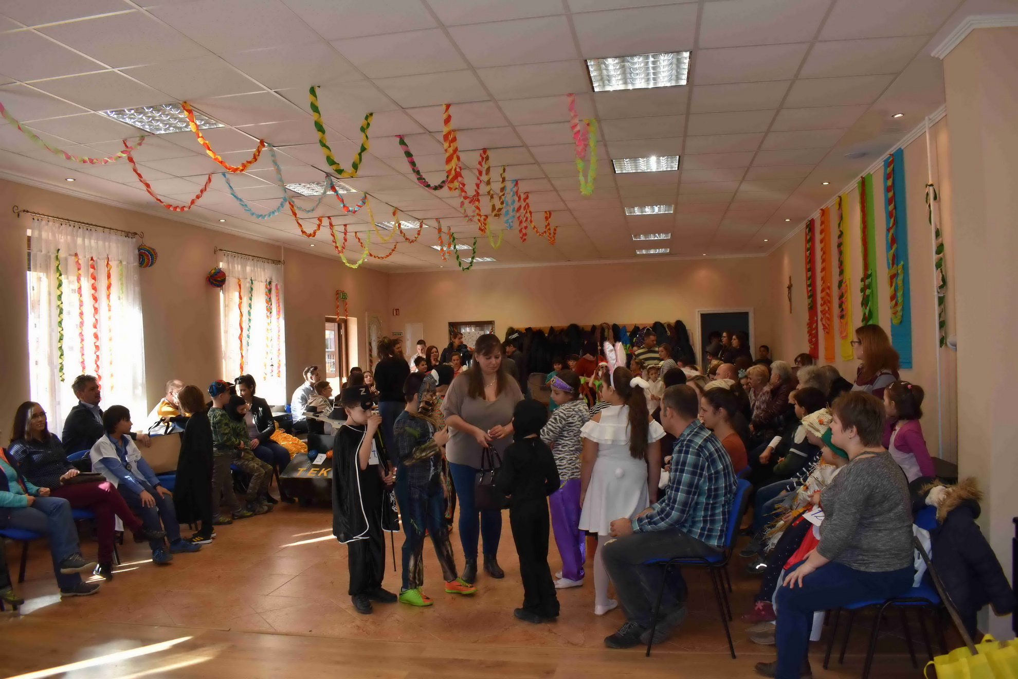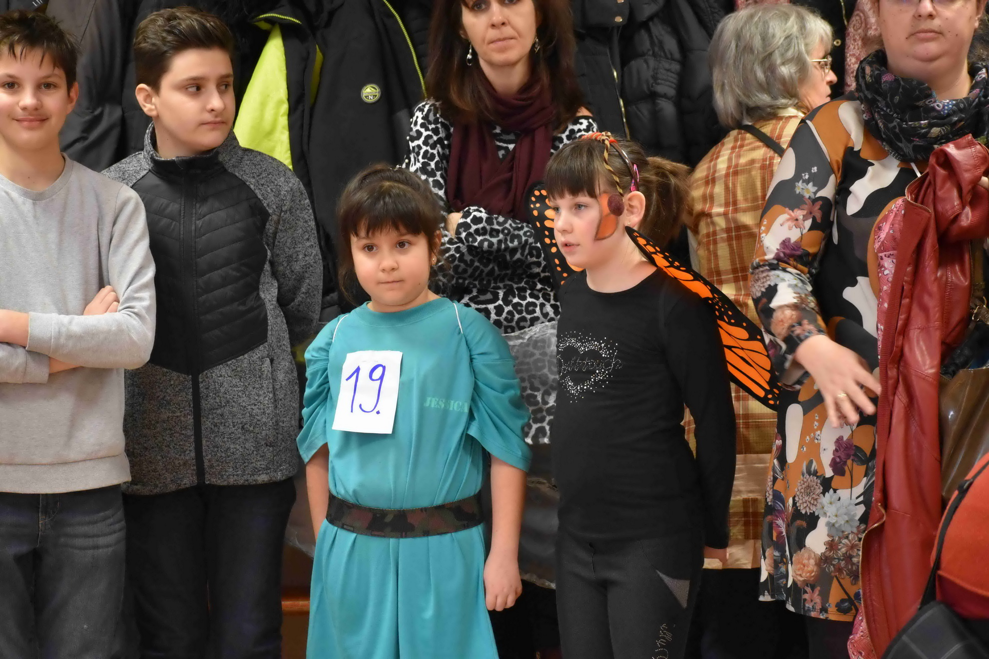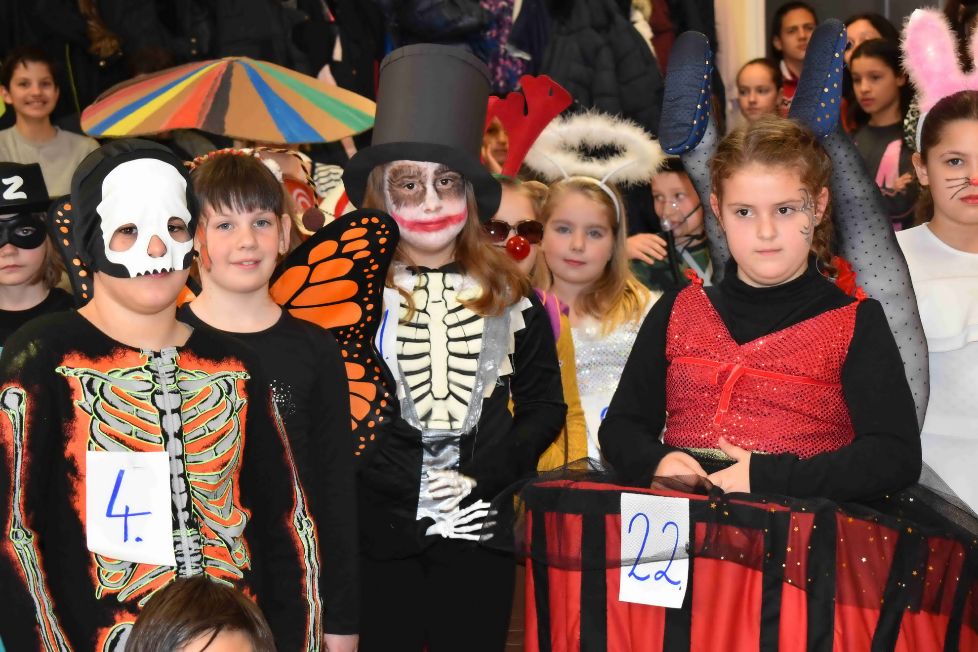 Az alsó és felső tagozatos tanulókat Kiss Iván c. prépost, esperes-plébános köszöntötte. A vidám hangulatot a világ népeit bemutató előadás alapozta meg, melyet Iván atya és a hitoktatók adtak elő. A mulatság ezután a szokásos és nagy izgalommal kísért jelmezversennyel folytatódott, ahol ismét sok gyermek vonult fel a jelenlévők és a szakértő zsűri előtt. Az idén is voltak különféle ötletes maskarák önálló és csoportos kategóriában. A nehéz helyzetben lévő bíráló bizottság ismét csak a leleményes megoldásokat díjazta, így például a TEK-et és a katonai repülést megjelentető „haditechnikai bemutatót”, a „fába szorult férget”, a „sajtkukacot”, a „transformers”-et, vagy éppen a „Mikulás szabadságra megy” című produkciót.