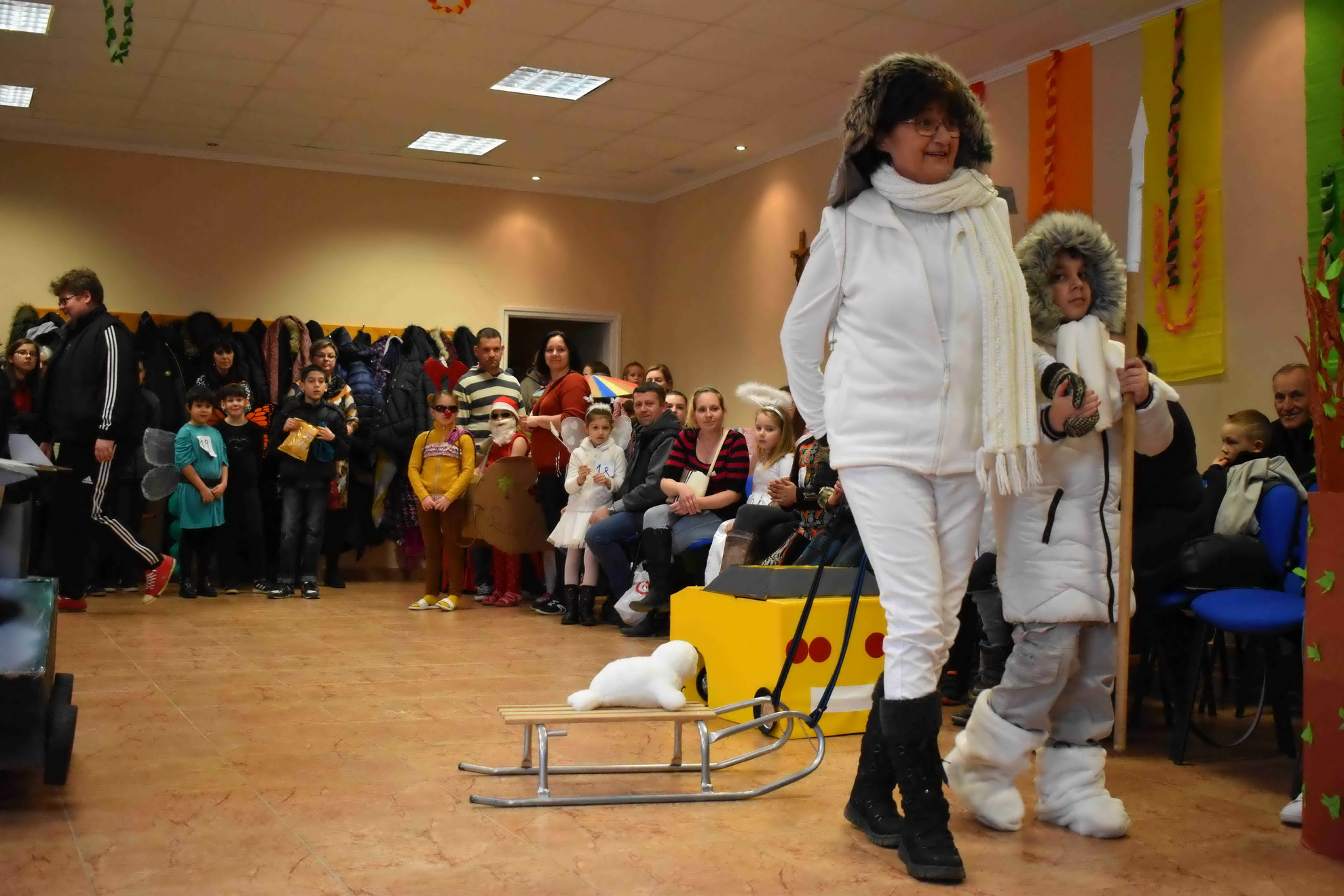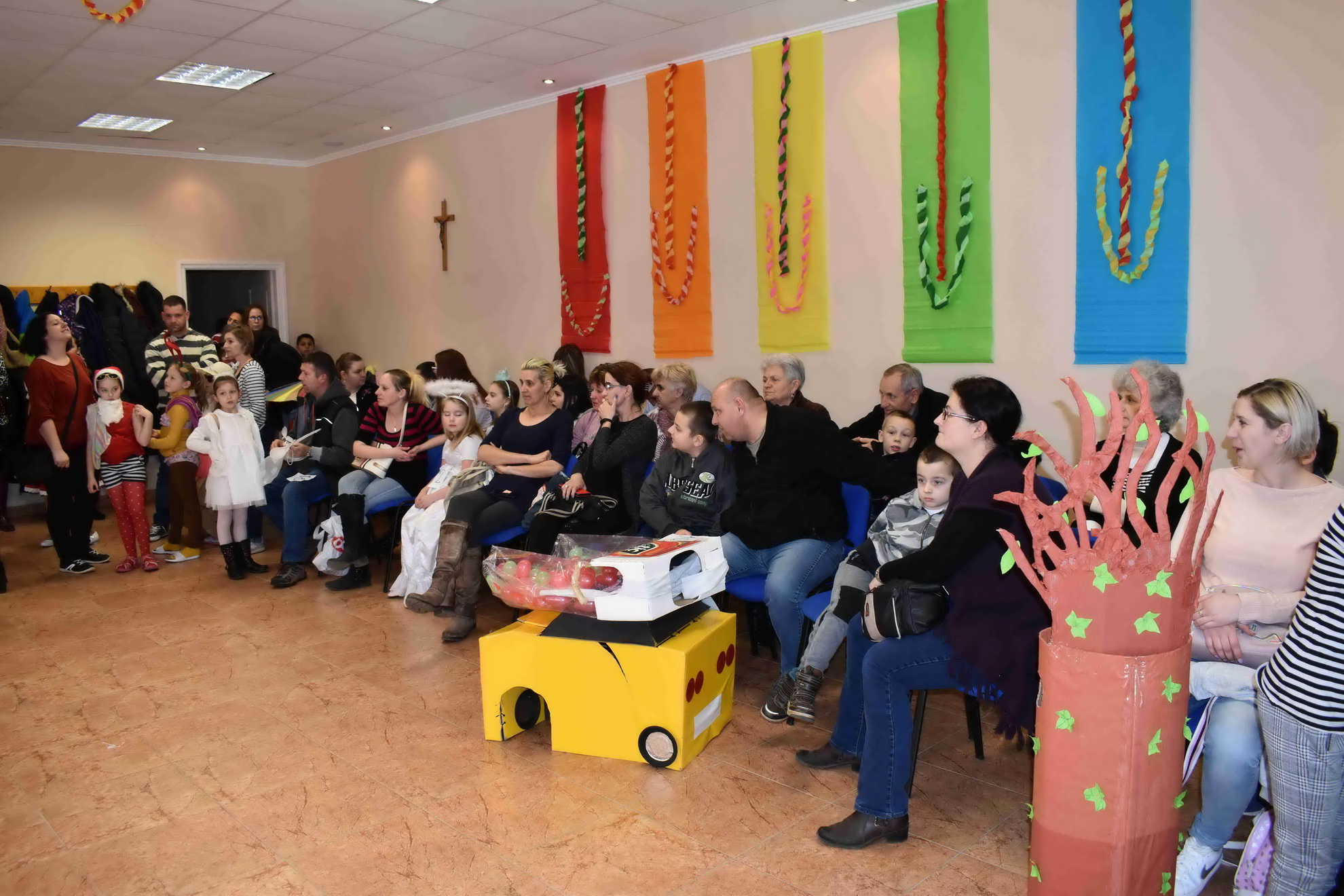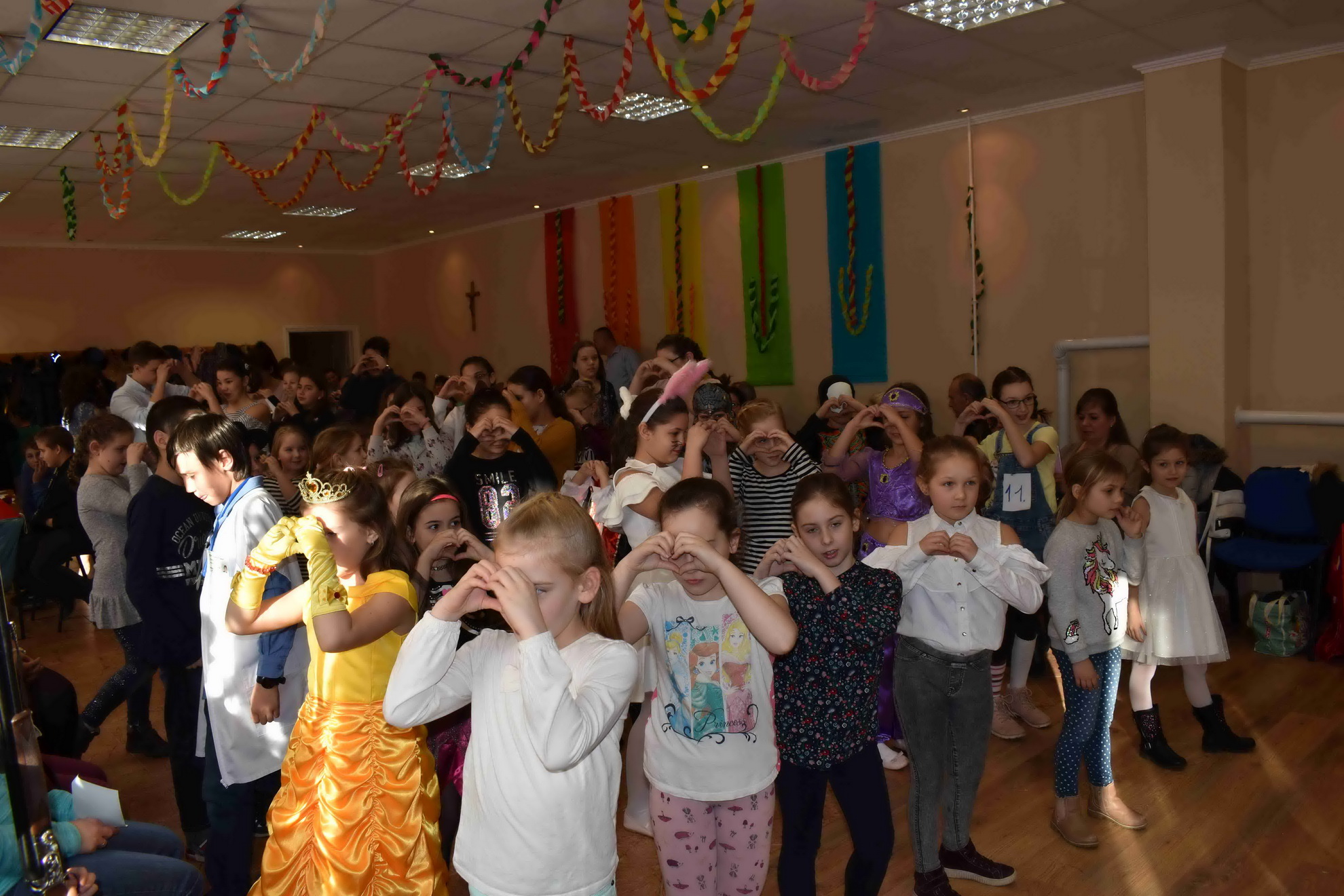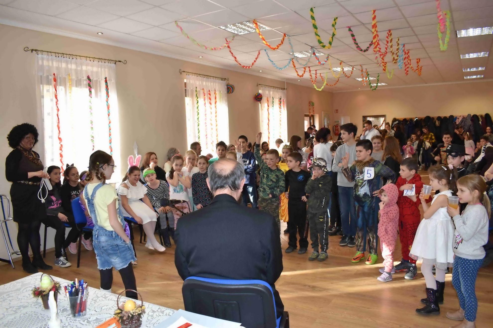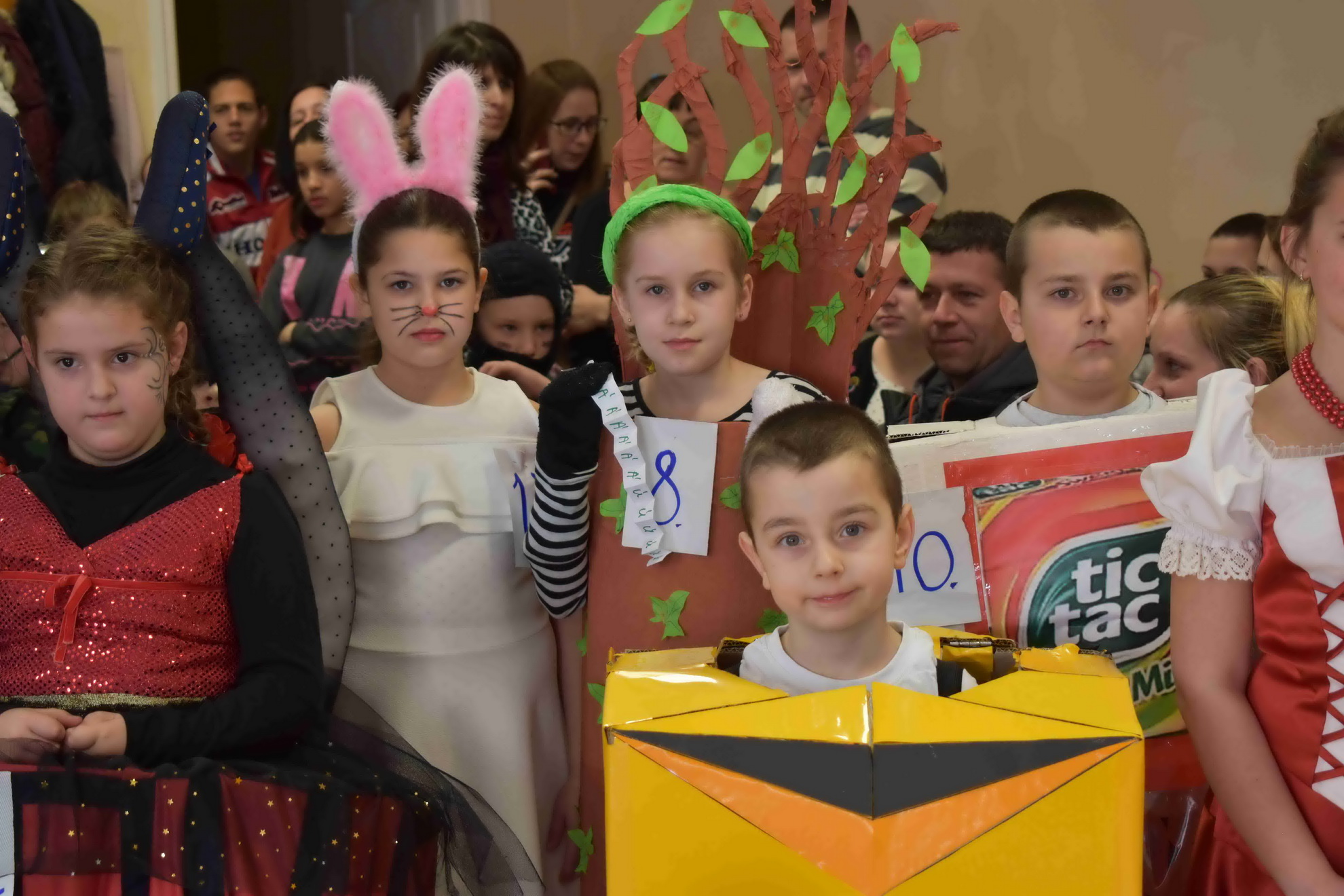 Az alsó és felső tagozatos tanulókat Kiss Iván c. prépost, esperes-plébános köszöntötte. A vidám hangulatot a világ népeit bemutató előadás alapozta meg, melyet Iván atya és a hitoktatók adtak elő. A mulatság ezután a szokásos és nagy izgalommal kísért jelmezversennyel folytatódott, ahol ismét sok gyermek vonult fel a jelenlévők és a szakértő zsűri előtt. Az idén is voltak különféle ötletes maskarák önálló és csoportos kategóriában. A nehéz helyzetben lévő bíráló bizottság ismét csak a leleményes megoldásokat díjazta, így például a TEK-et és a katonai repülést megjelentető „haditechnikai bemutatót”, a „fába szorult férget”, a „sajtkukacot”, a „transformers”-et, vagy éppen a „Mikulás szabadságra megy” című produkciót.