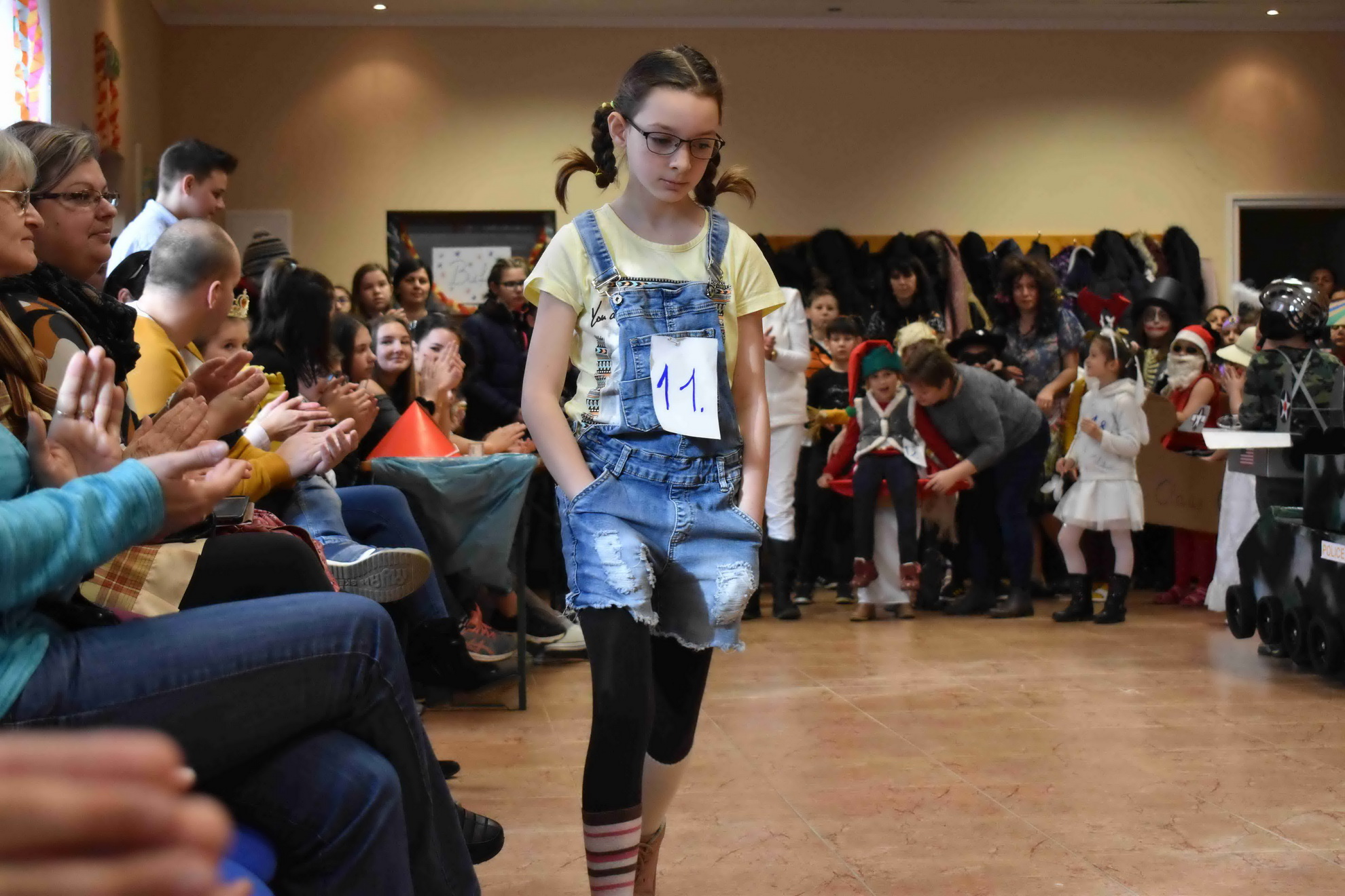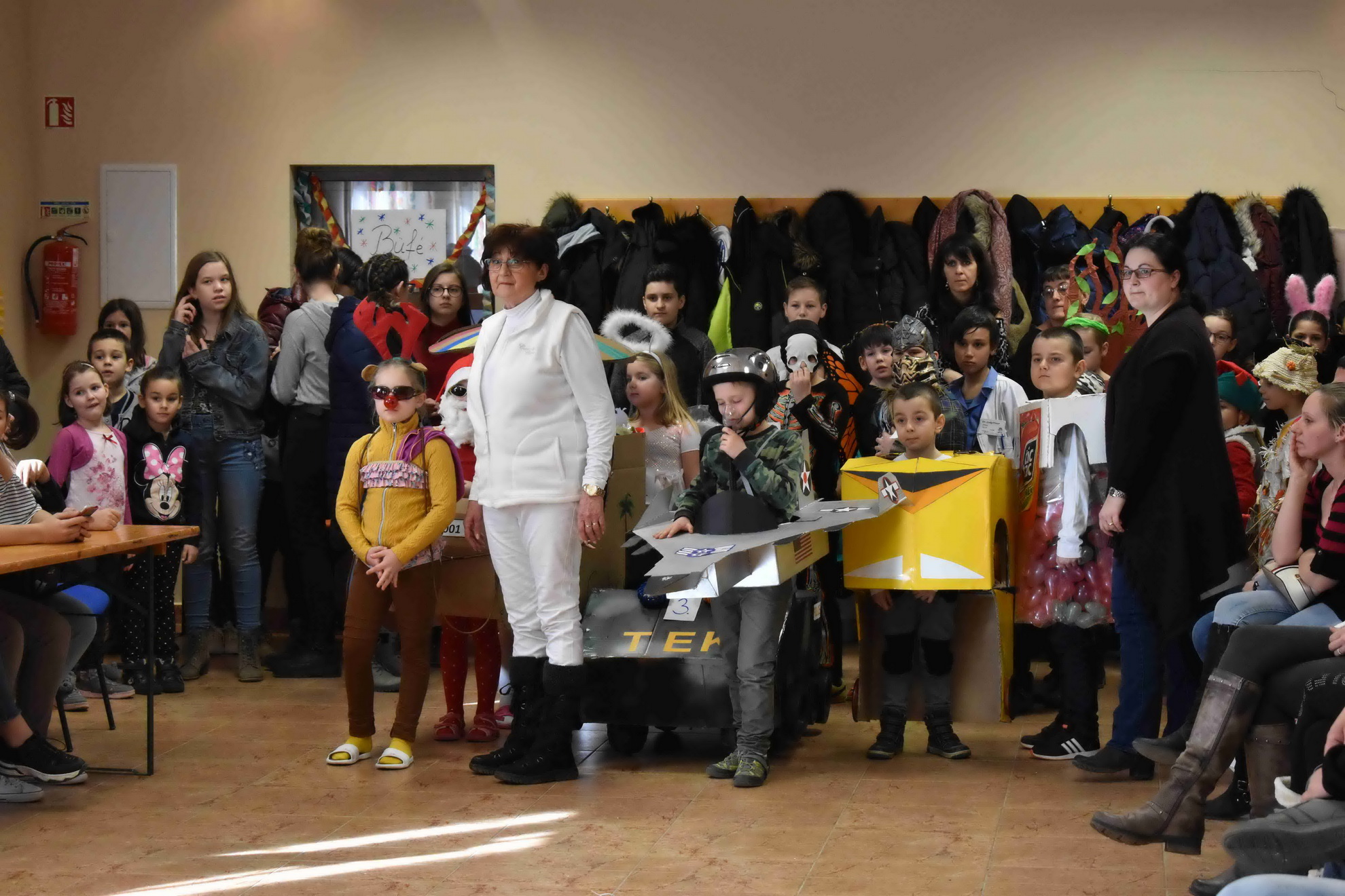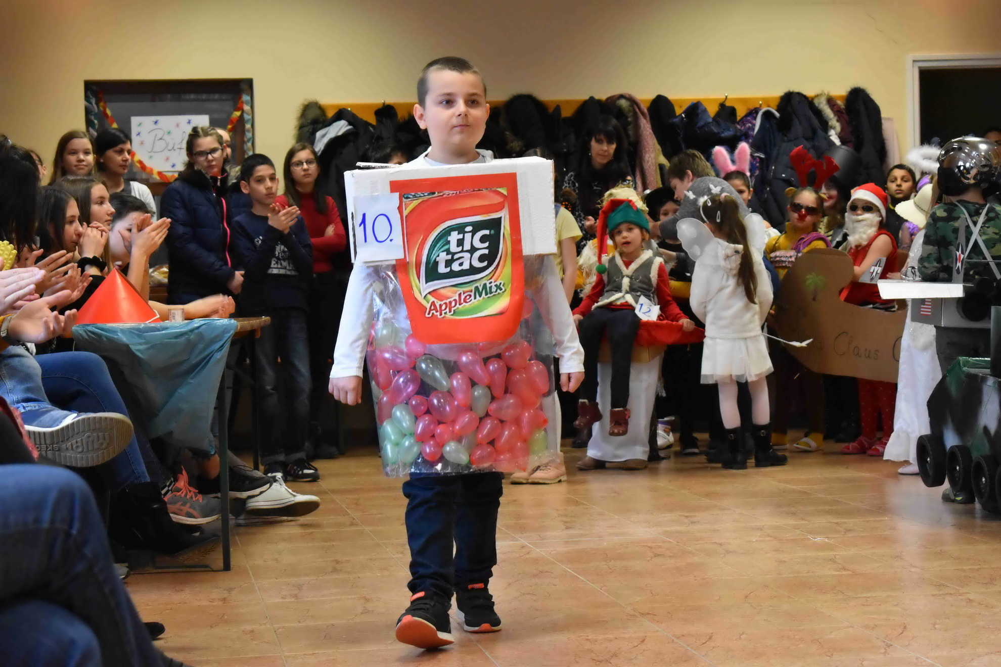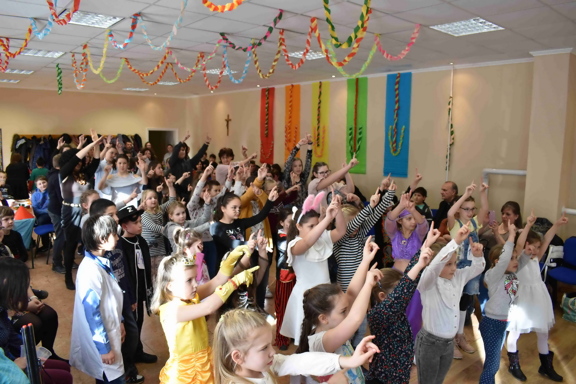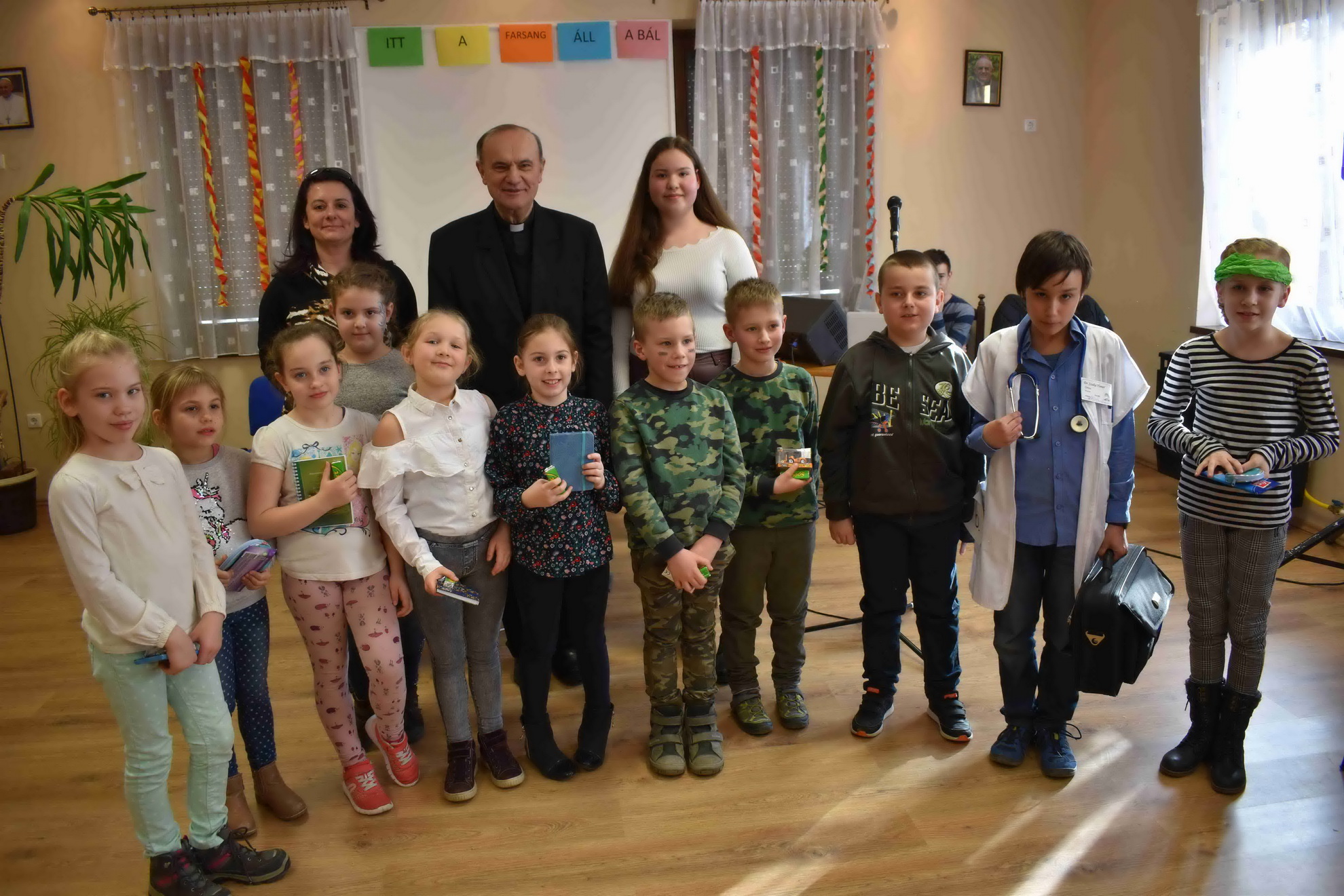 Az alsó és felső tagozatos tanulókat Kiss Iván c. prépost, esperes-plébános köszöntötte. A vidám hangulatot a világ népeit bemutató előadás alapozta meg, melyet Iván atya és a hitoktatók adtak elő. A mulatság ezután a szokásos és nagy izgalommal kísért jelmezversennyel folytatódott, ahol ismét sok gyermek vonult fel a jelenlévők és a szakértő zsűri előtt. Az idén is voltak különféle ötletes maskarák önálló és csoportos kategóriában. A nehéz helyzetben lévő bíráló bizottság ismét csak a leleményes megoldásokat díjazta, így például a TEK-et és a katonai repülést megjelentető „haditechnikai bemutatót”, a „fába szorult férget”, a „sajtkukacot”, a „transformers”-et, vagy éppen a „Mikulás szabadságra megy” című produkciót.