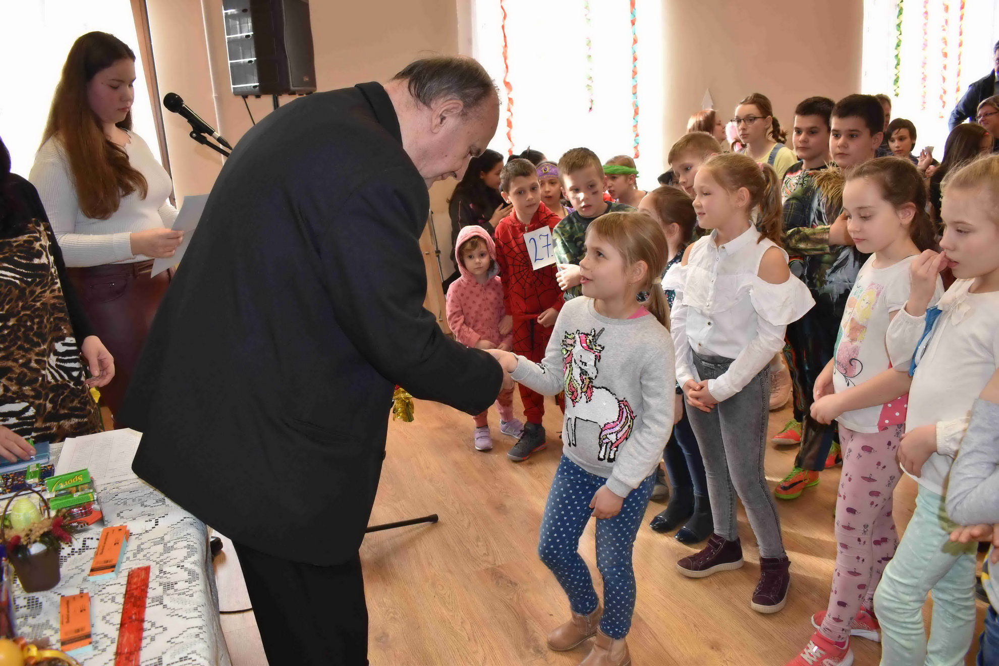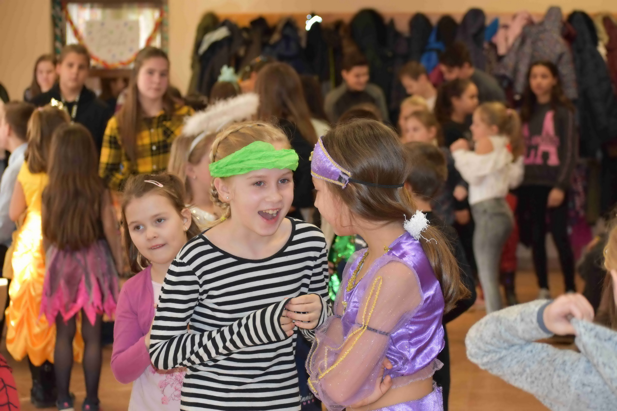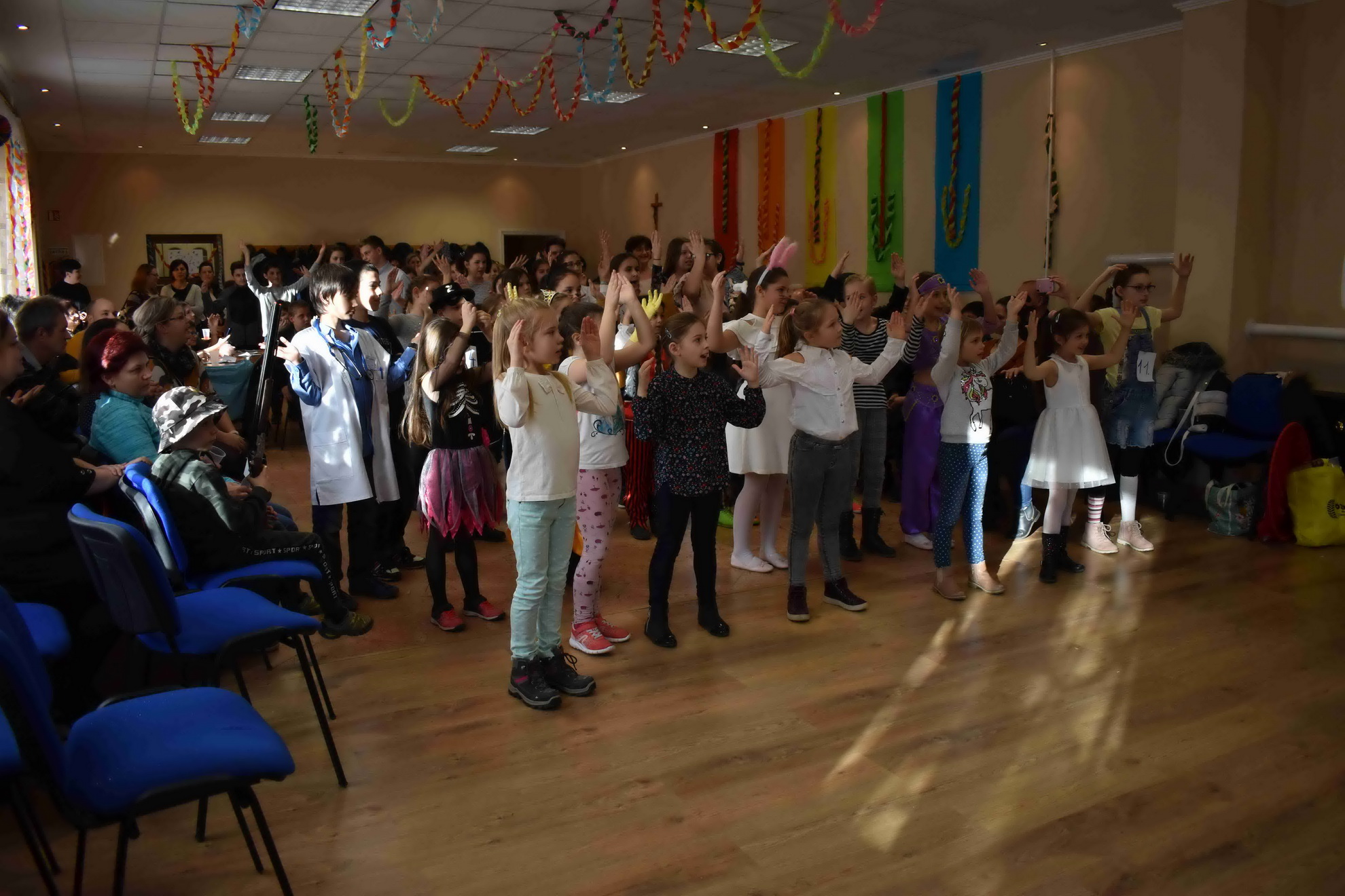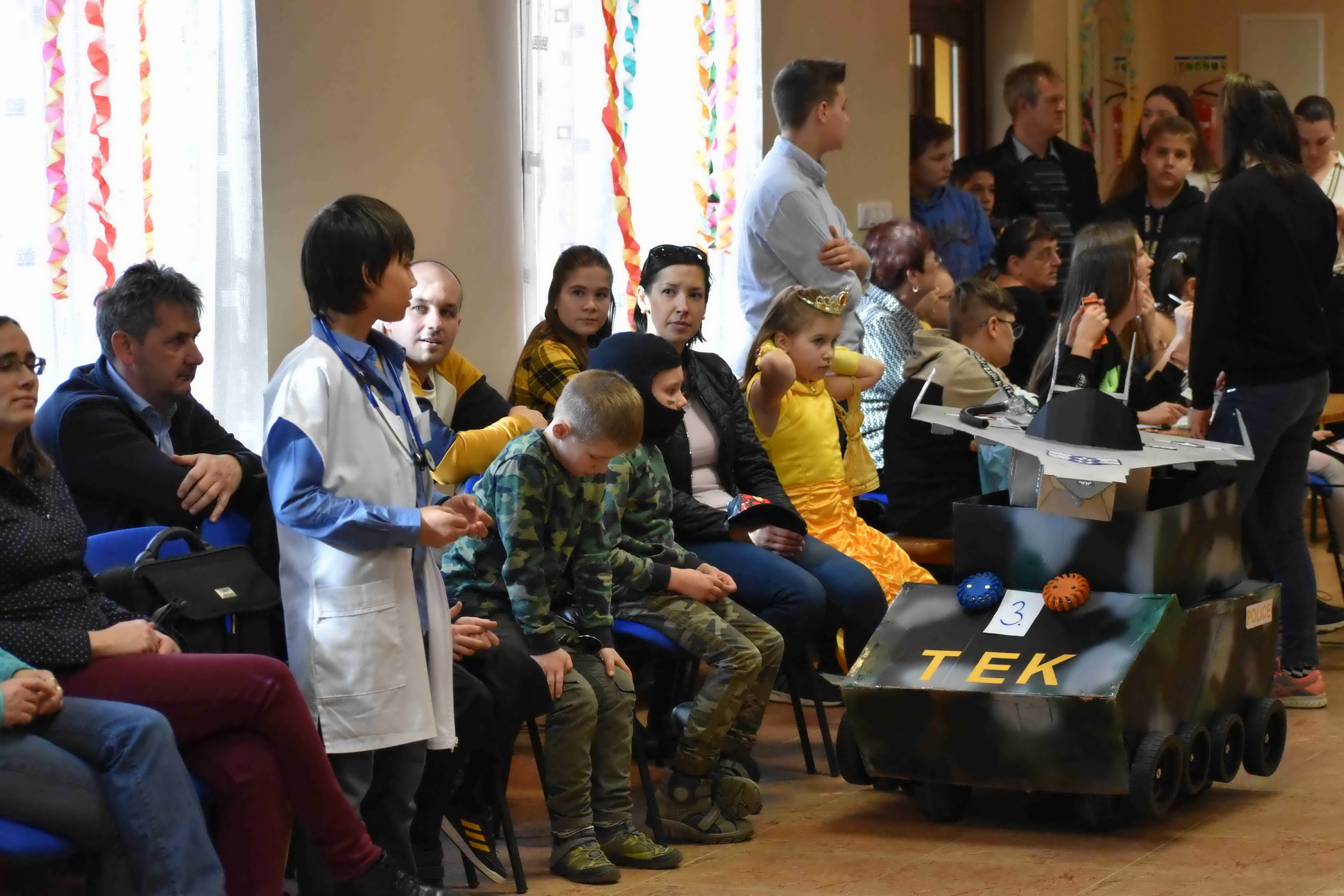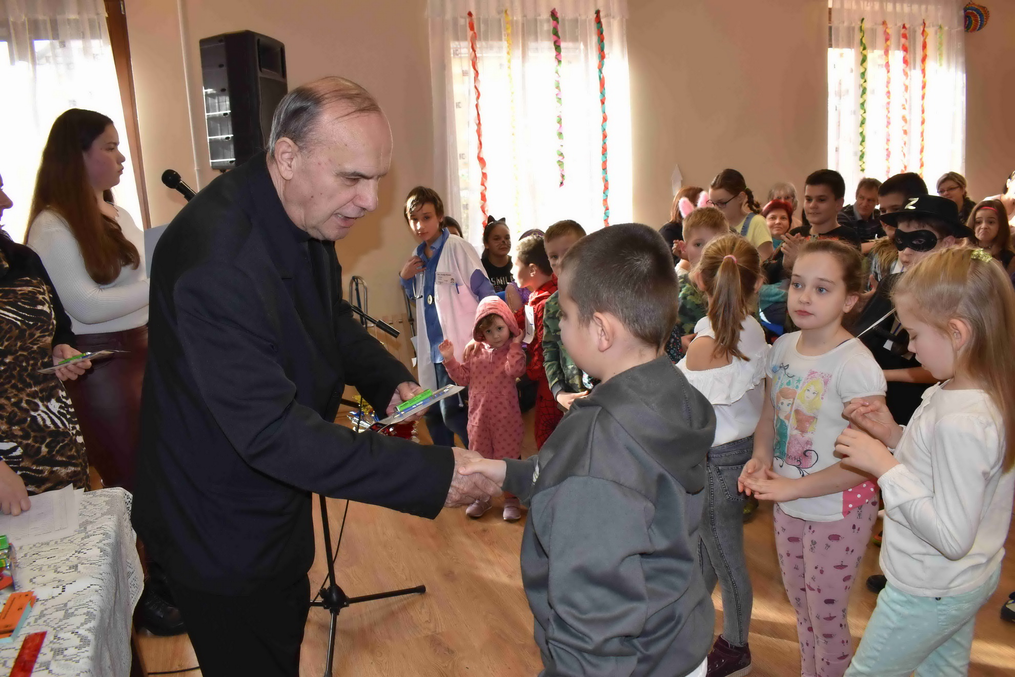 Az alsó és felső tagozatos tanulókat Kiss Iván c. prépost, esperes-plébános köszöntötte. A vidám hangulatot a világ népeit bemutató előadás alapozta meg, melyet Iván atya és a hitoktatók adtak elő. A mulatság ezután a szokásos és nagy izgalommal kísért jelmezversennyel folytatódott, ahol ismét sok gyermek vonult fel a jelenlévők és a szakértő zsűri előtt. Az idén is voltak különféle ötletes maskarák önálló és csoportos kategóriában. A nehéz helyzetben lévő bíráló bizottság ismét csak a leleményes megoldásokat díjazta, így például a TEK-et és a katonai repülést megjelentető „haditechnikai bemutatót”, a „fába szorult férget”, a „sajtkukacot”, a „transformers”-et, vagy éppen a „Mikulás szabadságra megy” című produkciót.