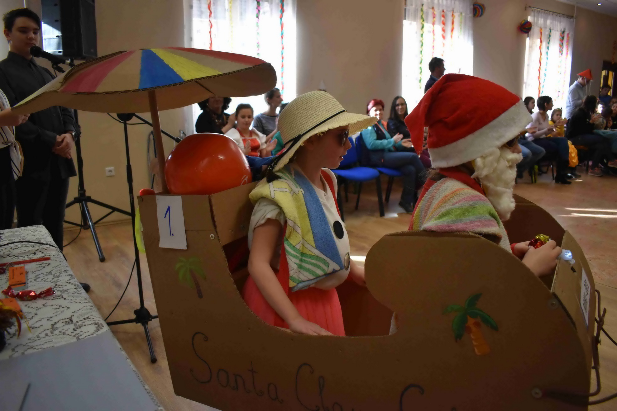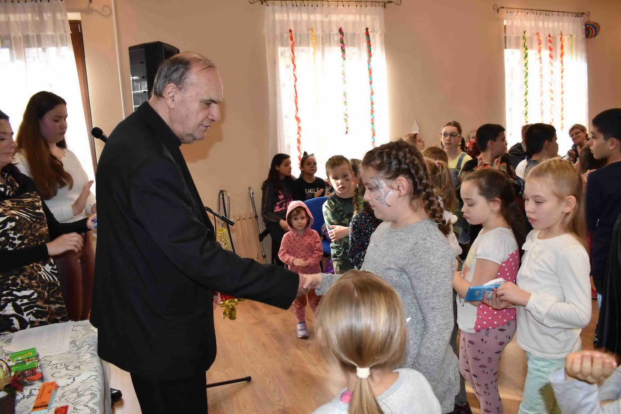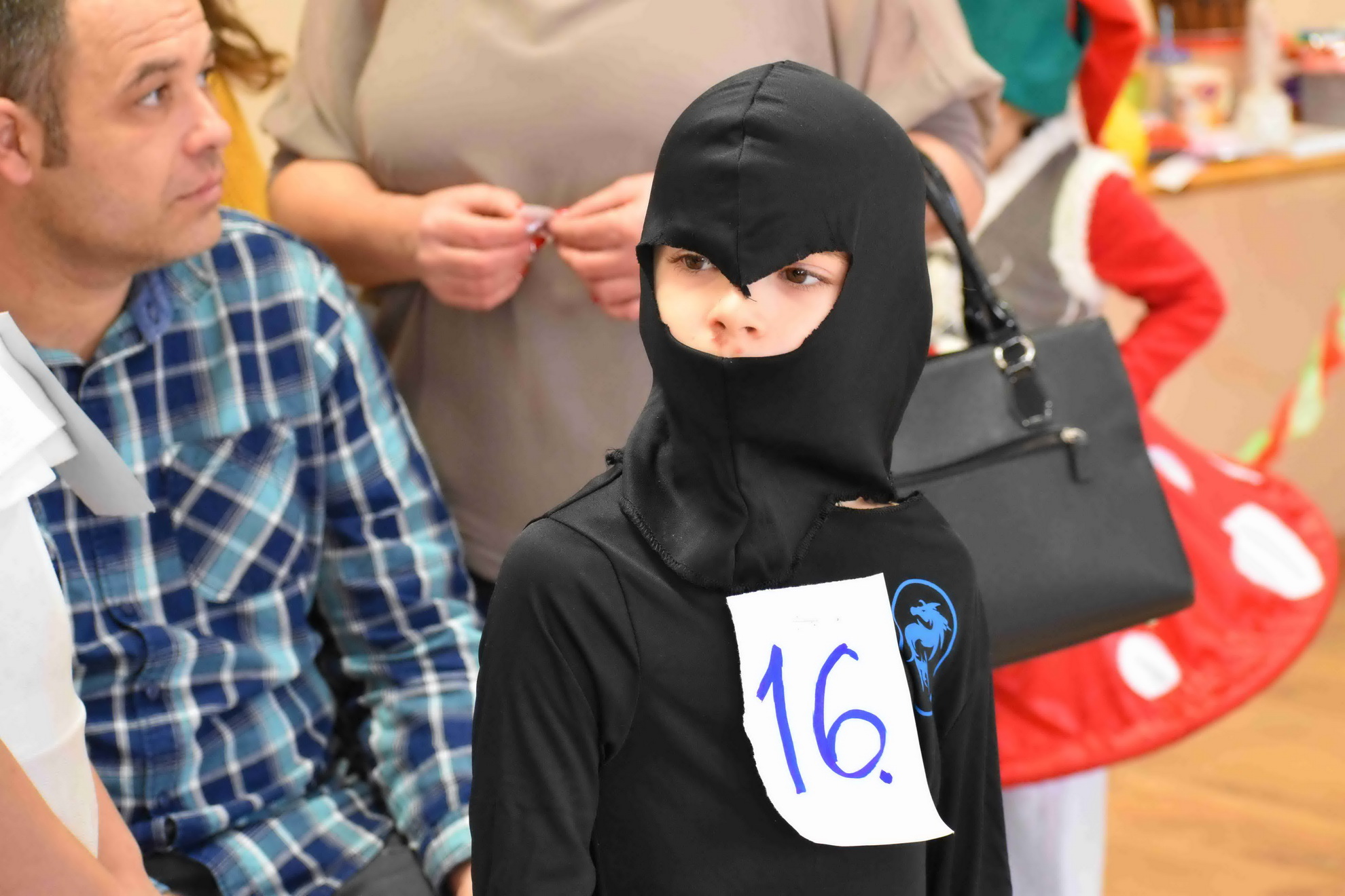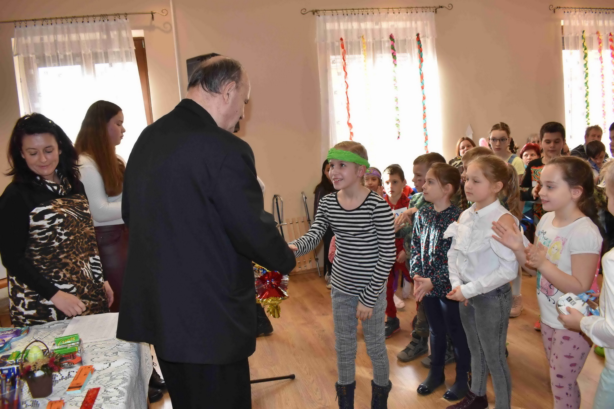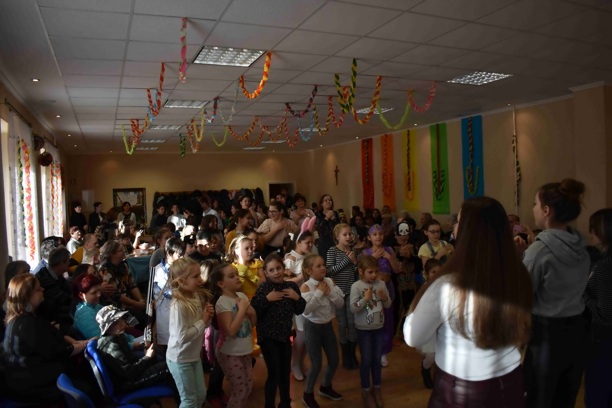 Az alsó és felső tagozatos tanulókat Kiss Iván c. prépost, esperes-plébános köszöntötte. A vidám hangulatot a világ népeit bemutató előadás alapozta meg, melyet Iván atya és a hitoktatók adtak elő. A mulatság ezután a szokásos és nagy izgalommal kísért jelmezversennyel folytatódott, ahol ismét sok gyermek vonult fel a jelenlévők és a szakértő zsűri előtt. Az idén is voltak különféle ötletes maskarák önálló és csoportos kategóriában. A nehéz helyzetben lévő bíráló bizottság ismét csak a leleményes megoldásokat díjazta, így például a TEK-et és a katonai repülést megjelentető „haditechnikai bemutatót”, a „fába szorult férget”, a „sajtkukacot”, a „transformers”-et, vagy éppen a „Mikulás szabadságra megy” című produkciót.