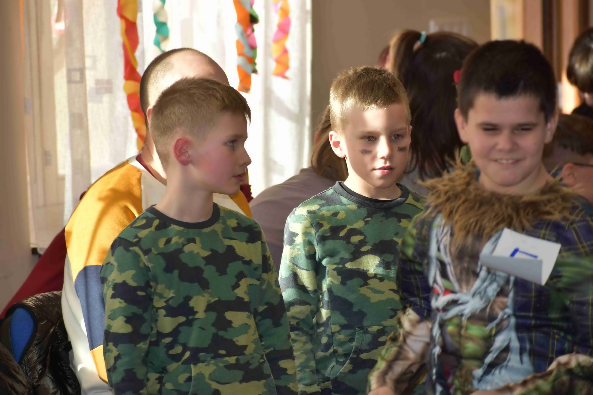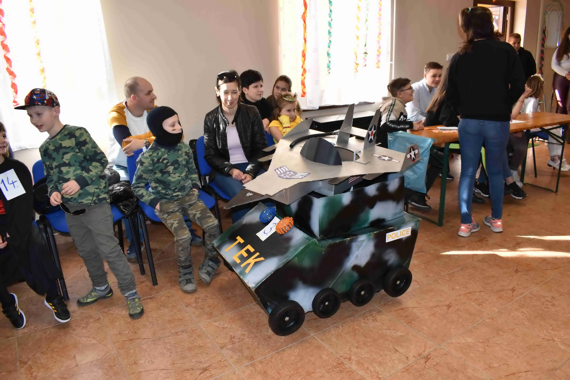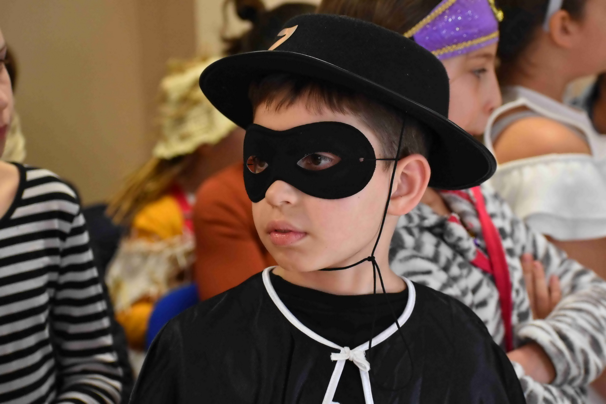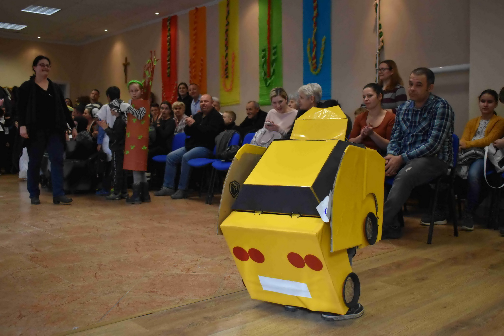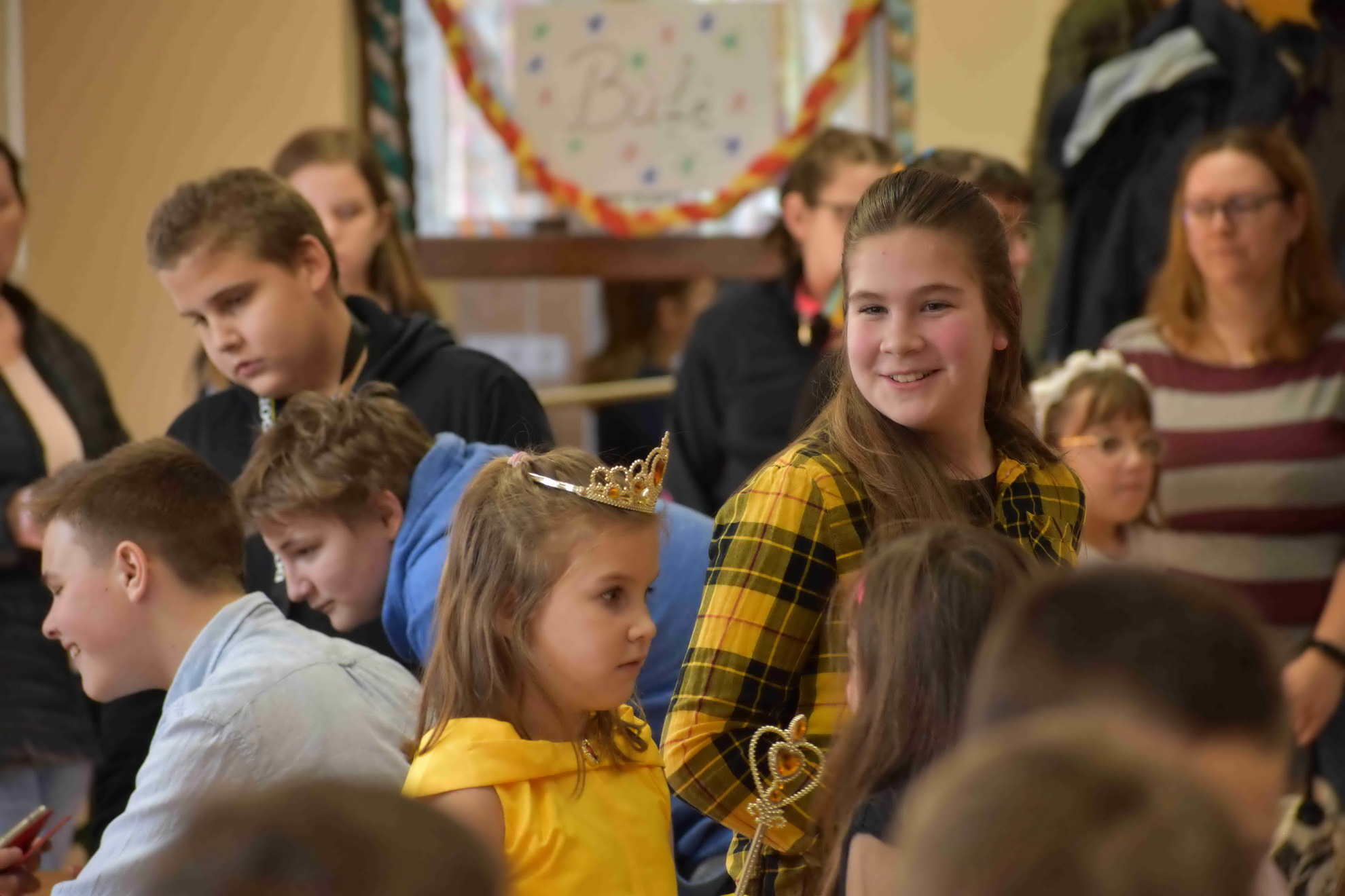 Az alsó és felső tagozatos tanulókat Kiss Iván c. prépost, esperes-plébános köszöntötte. A vidám hangulatot a világ népeit bemutató előadás alapozta meg, melyet Iván atya és a hitoktatók adtak elő. A mulatság ezután a szokásos és nagy izgalommal kísért jelmezversennyel folytatódott, ahol ismét sok gyermek vonult fel a jelenlévők és a szakértő zsűri előtt. Az idén is voltak különféle ötletes maskarák önálló és csoportos kategóriában. A nehéz helyzetben lévő bíráló bizottság ismét csak a leleményes megoldásokat díjazta, így például a TEK-et és a katonai repülést megjelentető „haditechnikai bemutatót”, a „fába szorult férget”, a „sajtkukacot”, a „transformers”-et, vagy éppen a „Mikulás szabadságra megy” című produkciót.