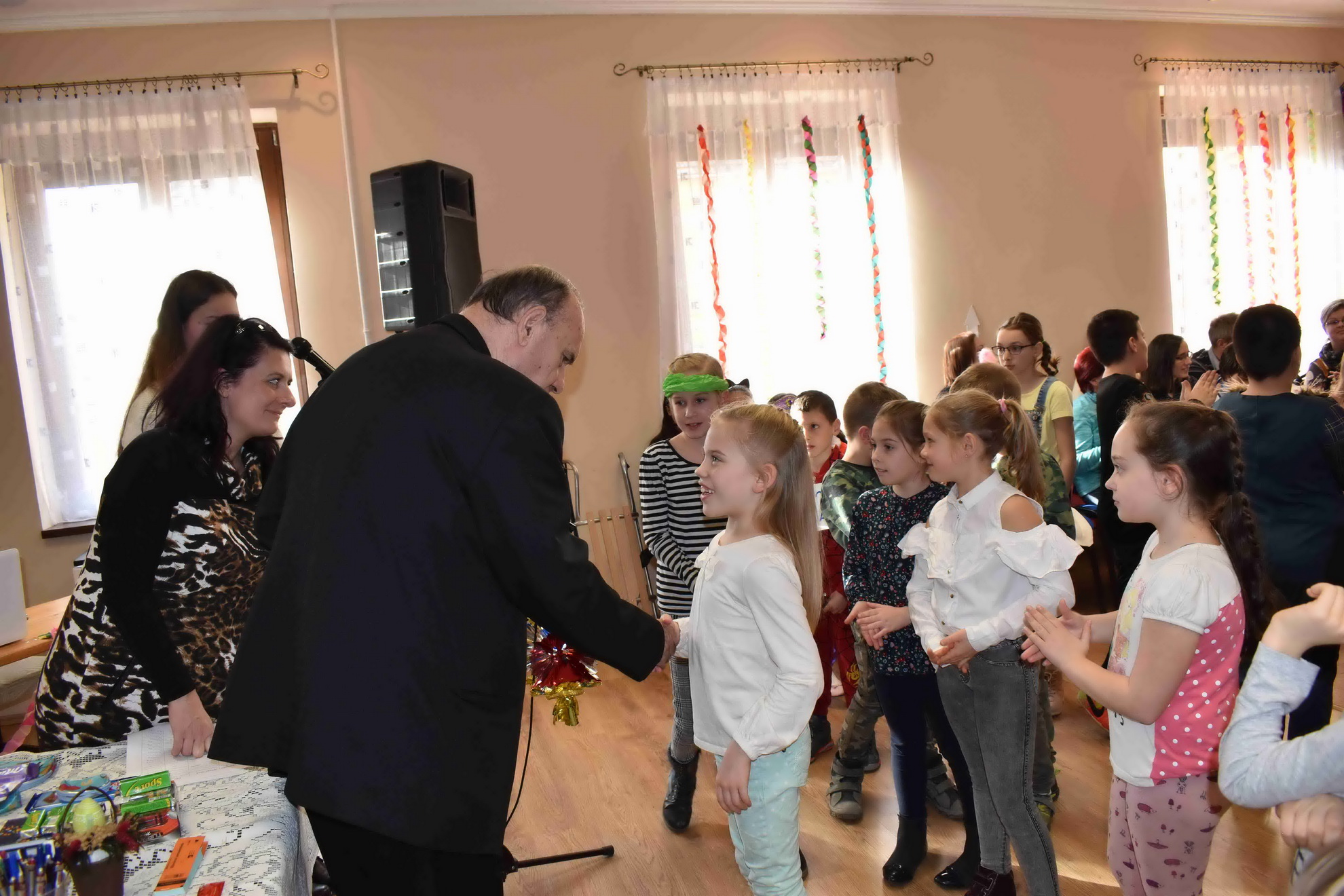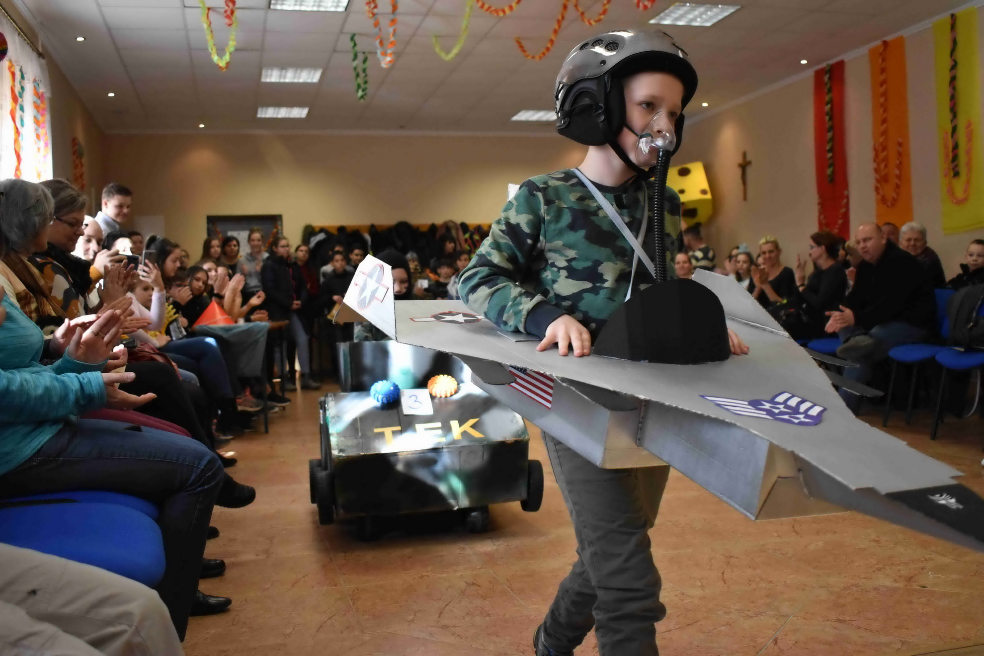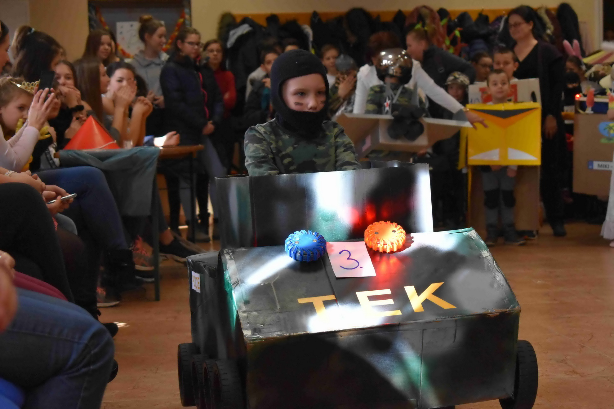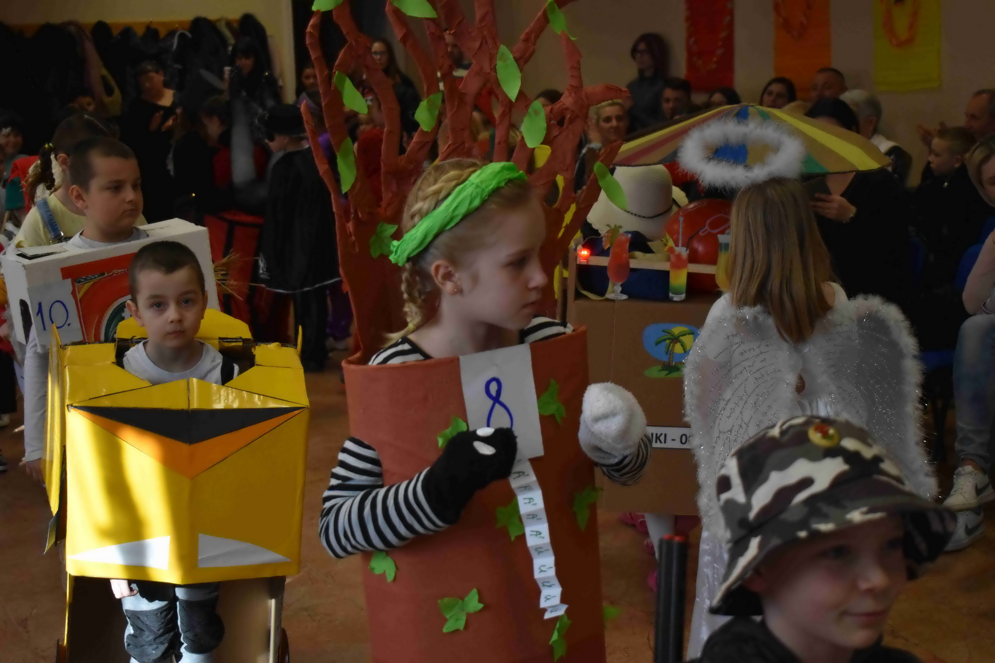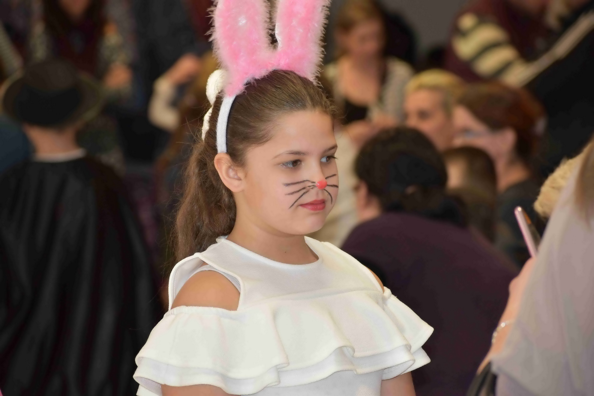 Az alsó és felső tagozatos tanulókat Kiss Iván c. prépost, esperes-plébános köszöntötte. A vidám hangulatot a világ népeit bemutató előadás alapozta meg, melyet Iván atya és a hitoktatók adtak elő. A mulatság ezután a szokásos és nagy izgalommal kísért jelmezversennyel folytatódott, ahol ismét sok gyermek vonult fel a jelenlévők és a szakértő zsűri előtt. Az idén is voltak különféle ötletes maskarák önálló és csoportos kategóriában. A nehéz helyzetben lévő bíráló bizottság ismét csak a leleményes megoldásokat díjazta, így például a TEK-et és a katonai repülést megjelentető „haditechnikai bemutatót”, a „fába szorult férget”, a „sajtkukacot”, a „transformers”-et, vagy éppen a „Mikulás szabadságra megy” című produkciót.