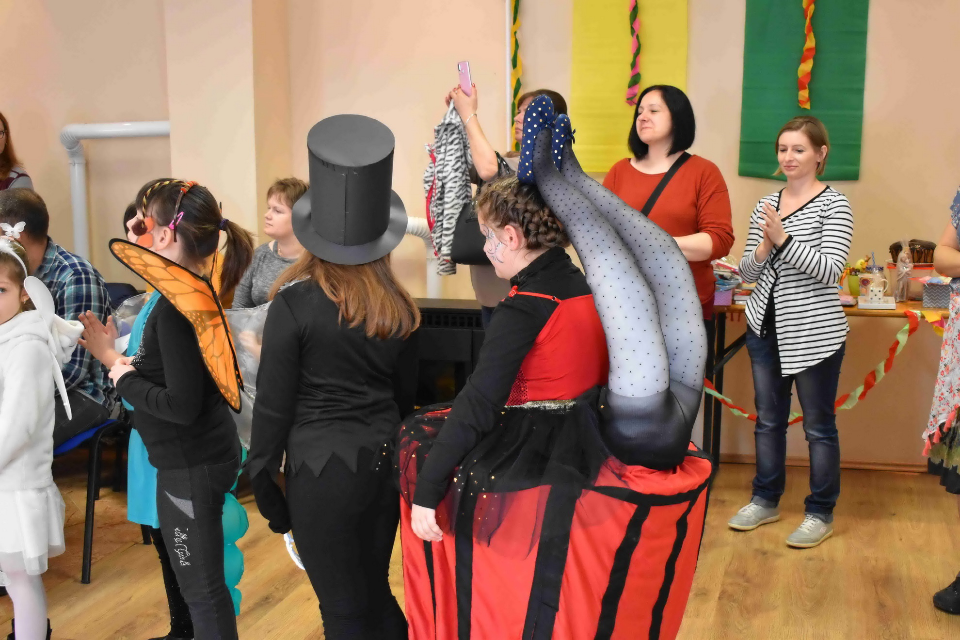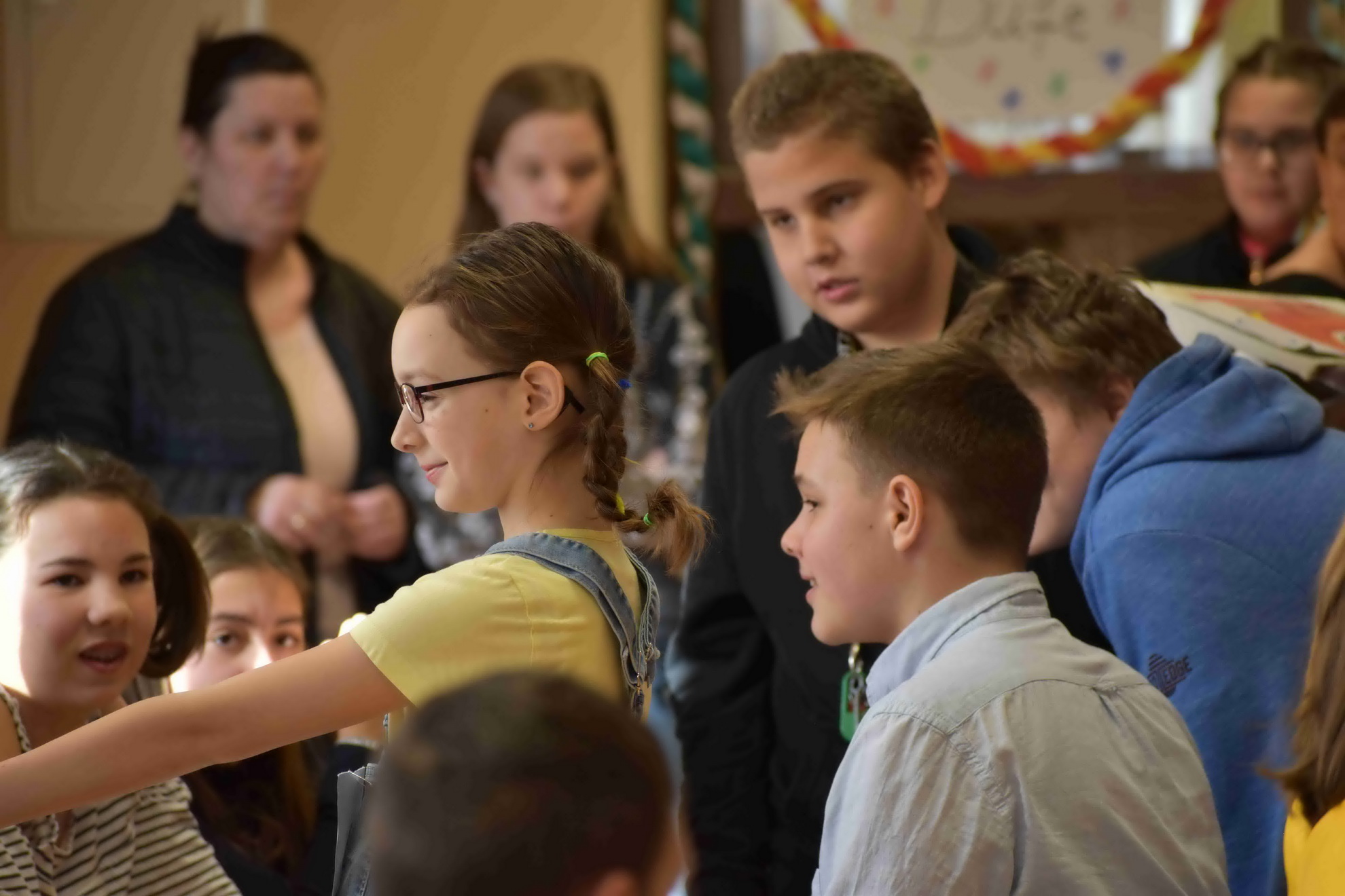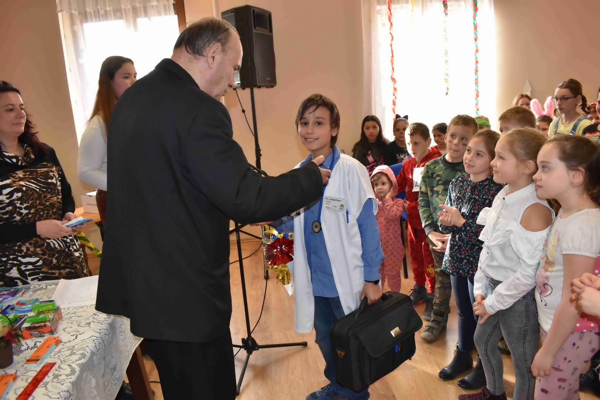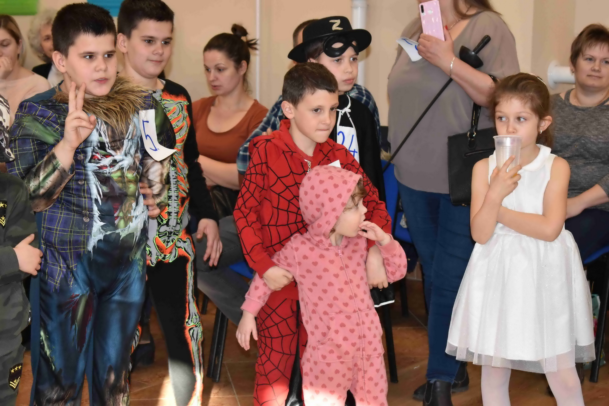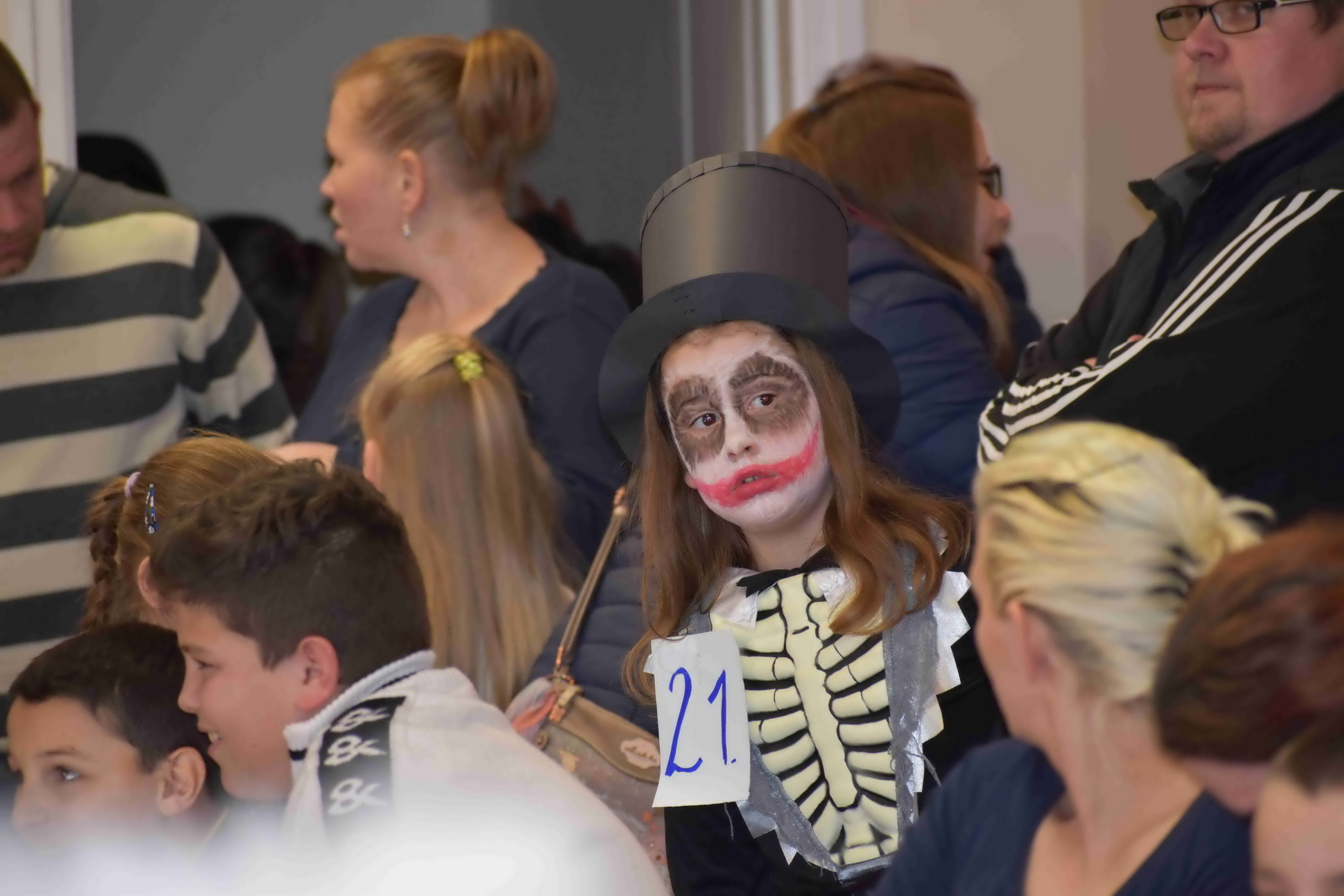 Az alsó és felső tagozatos tanulókat Kiss Iván c. prépost, esperes-plébános köszöntötte. A vidám hangulatot a világ népeit bemutató előadás alapozta meg, melyet Iván atya és a hitoktatók adtak elő. A mulatság ezután a szokásos és nagy izgalommal kísért jelmezversennyel folytatódott, ahol ismét sok gyermek vonult fel a jelenlévők és a szakértő zsűri előtt. Az idén is voltak különféle ötletes maskarák önálló és csoportos kategóriában. A nehéz helyzetben lévő bíráló bizottság ismét csak a leleményes megoldásokat díjazta, így például a TEK-et és a katonai repülést megjelentető „haditechnikai bemutatót”, a „fába szorult férget”, a „sajtkukacot”, a „transformers”-et, vagy éppen a „Mikulás szabadságra megy” című produkciót.