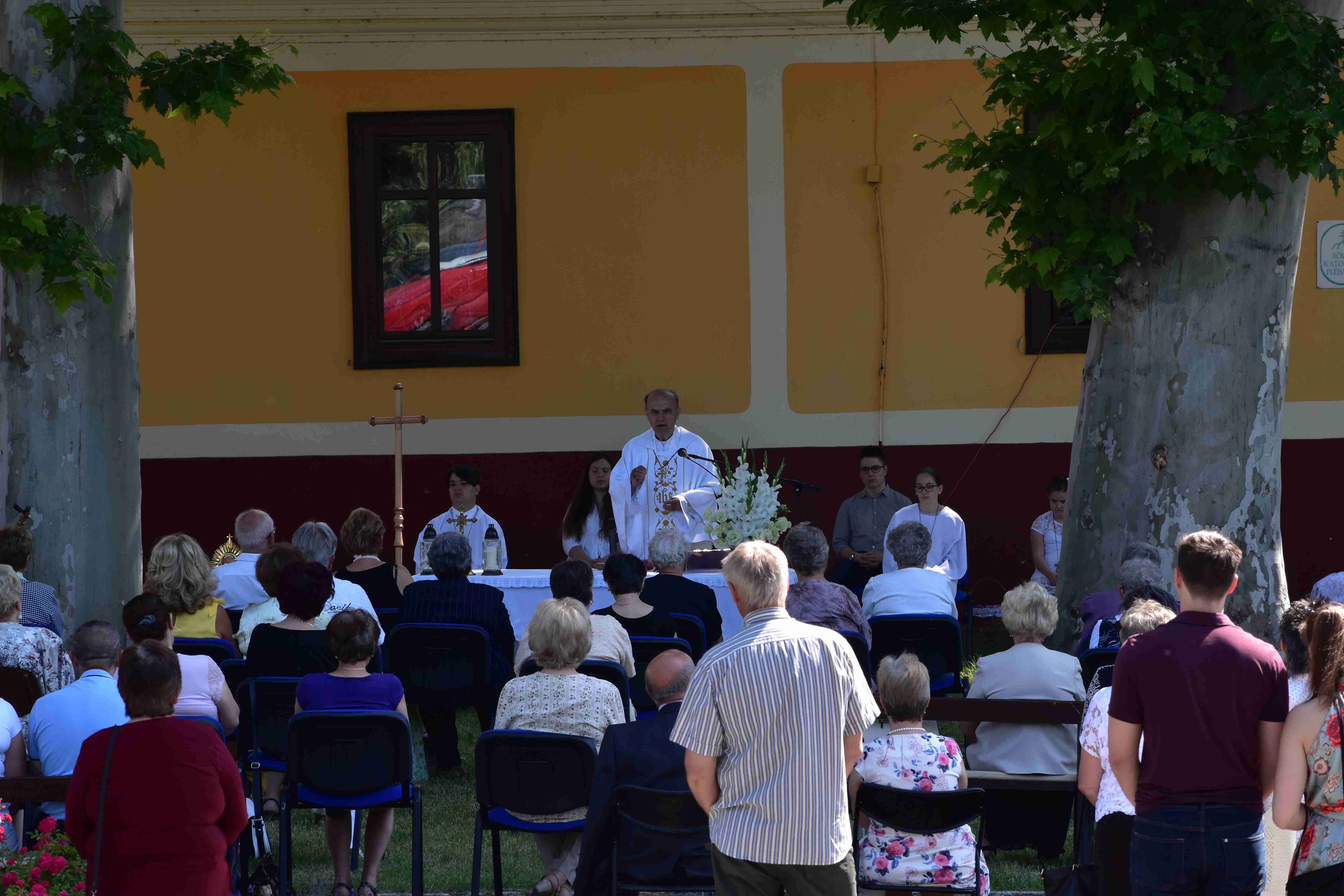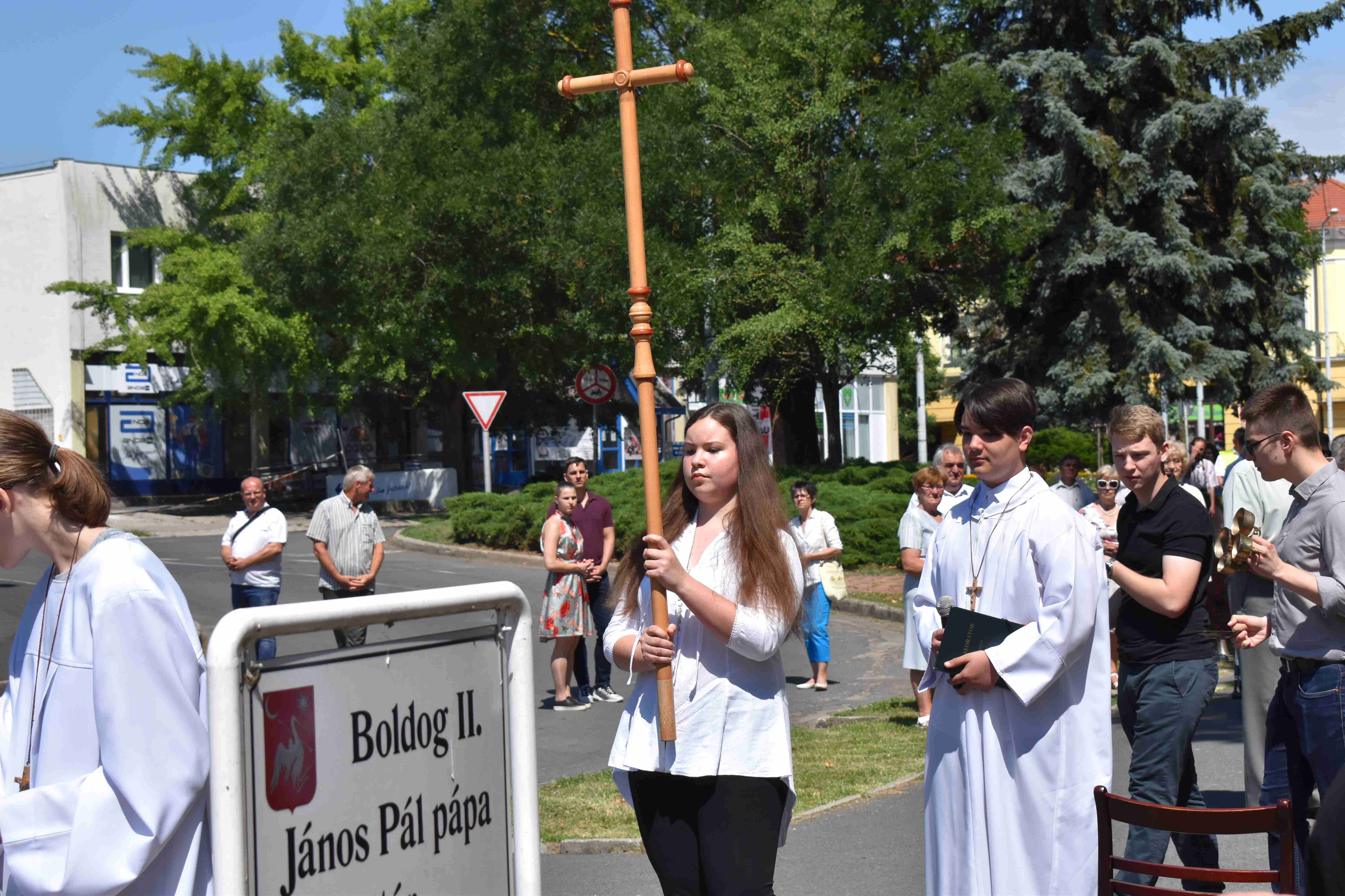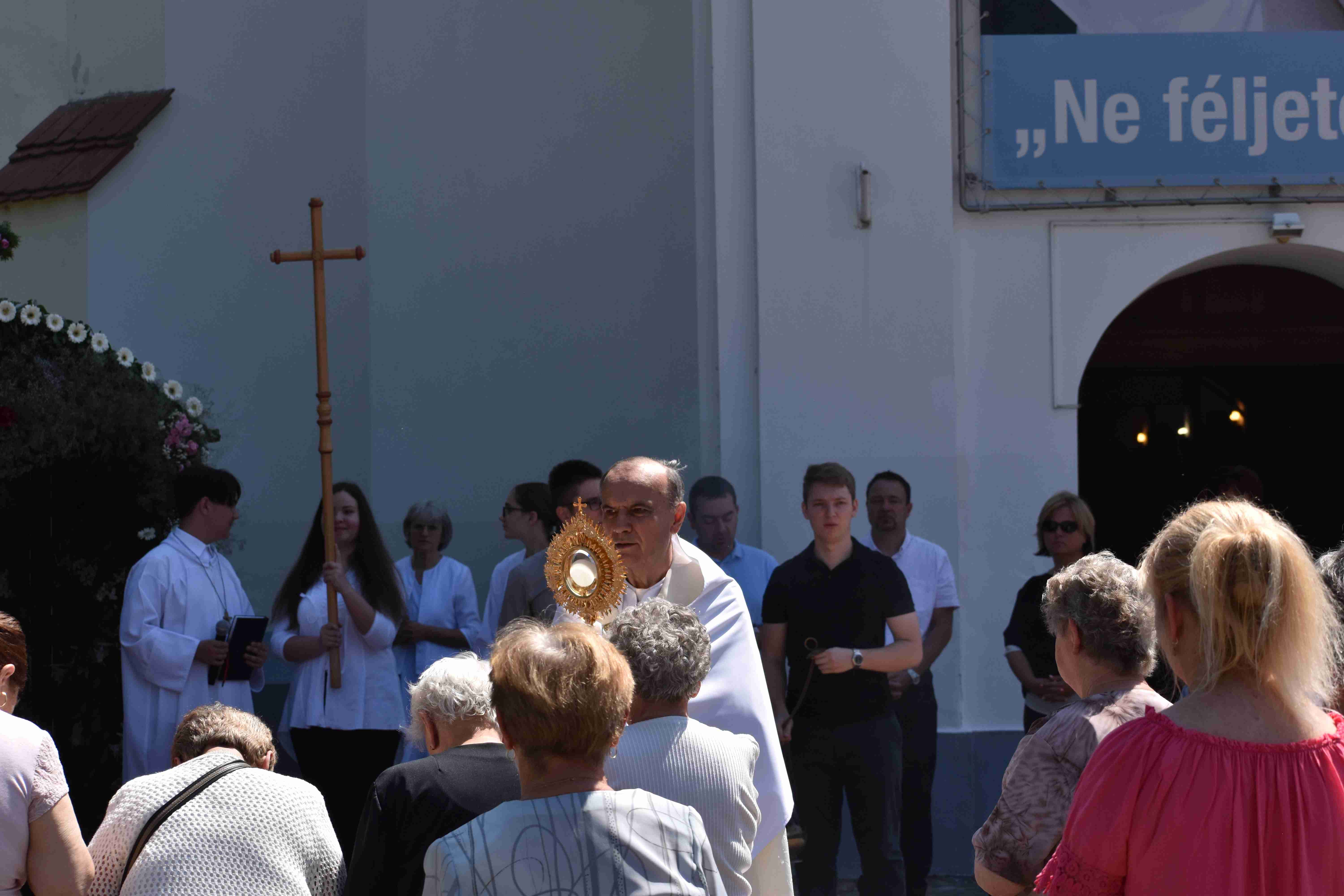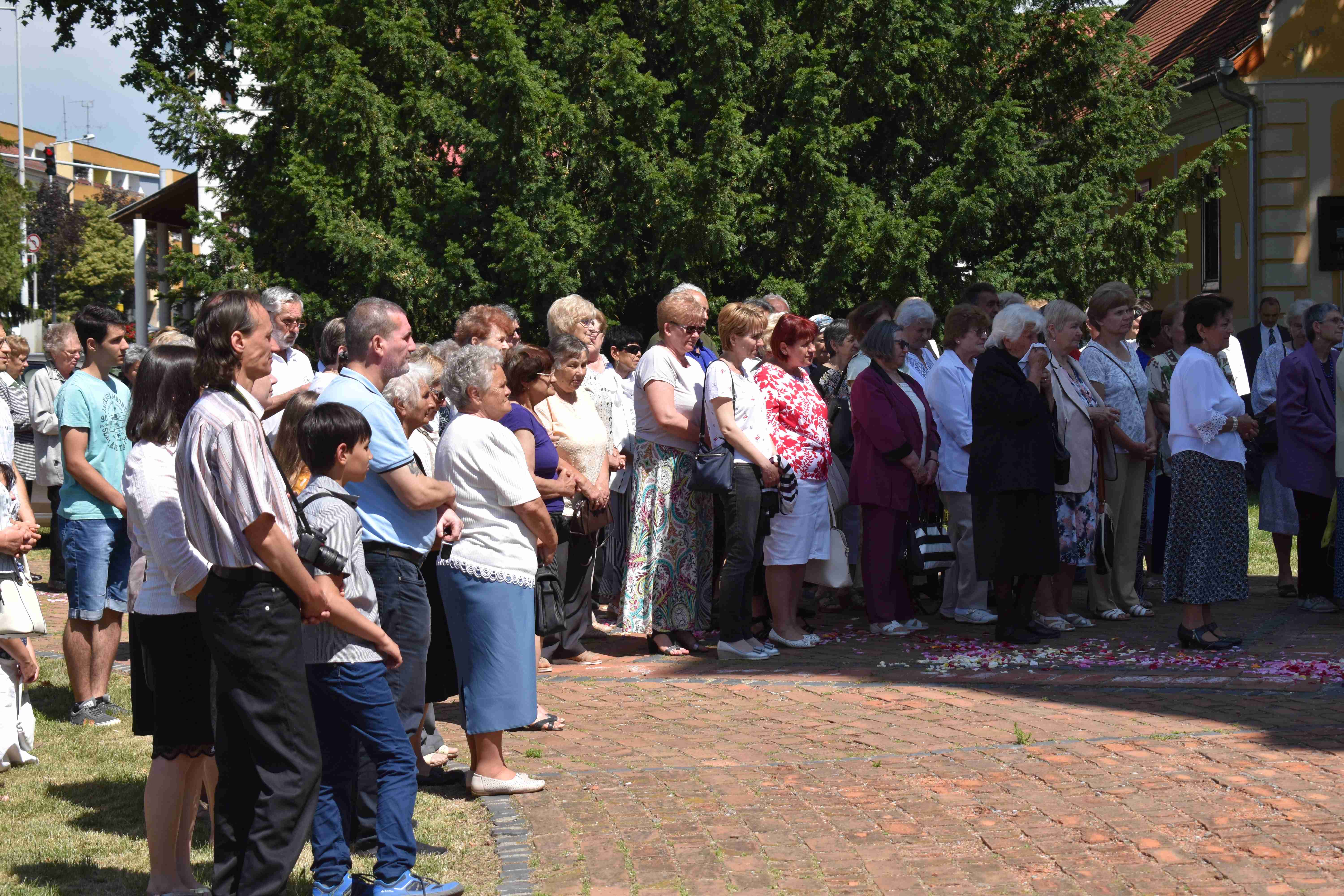 Az ünnepi szentmisét ezúttal a Római KatolikusPlébániahivatalelőtt tartották meg a Hősök terén és Boldog II. János Pál pápa téren az öreg fák árnyékában. Kiss Iván c. prépost, esperes-plébános szentbeszédében az utolsó vacsorán Jézus által alapított Oltáriszentségről beszélt, amikor Jézus a kenyeret az ő testének, a bort pedig az ő vérének nevezte. Az Oltáriszentség a szentmisében jön létre, ahol Krisztus valóságosan van jelen. Úrnapján mindig kiviszik az Oltáriszentséget az utcákra és a terekre, hogy áldást adjanak vele.