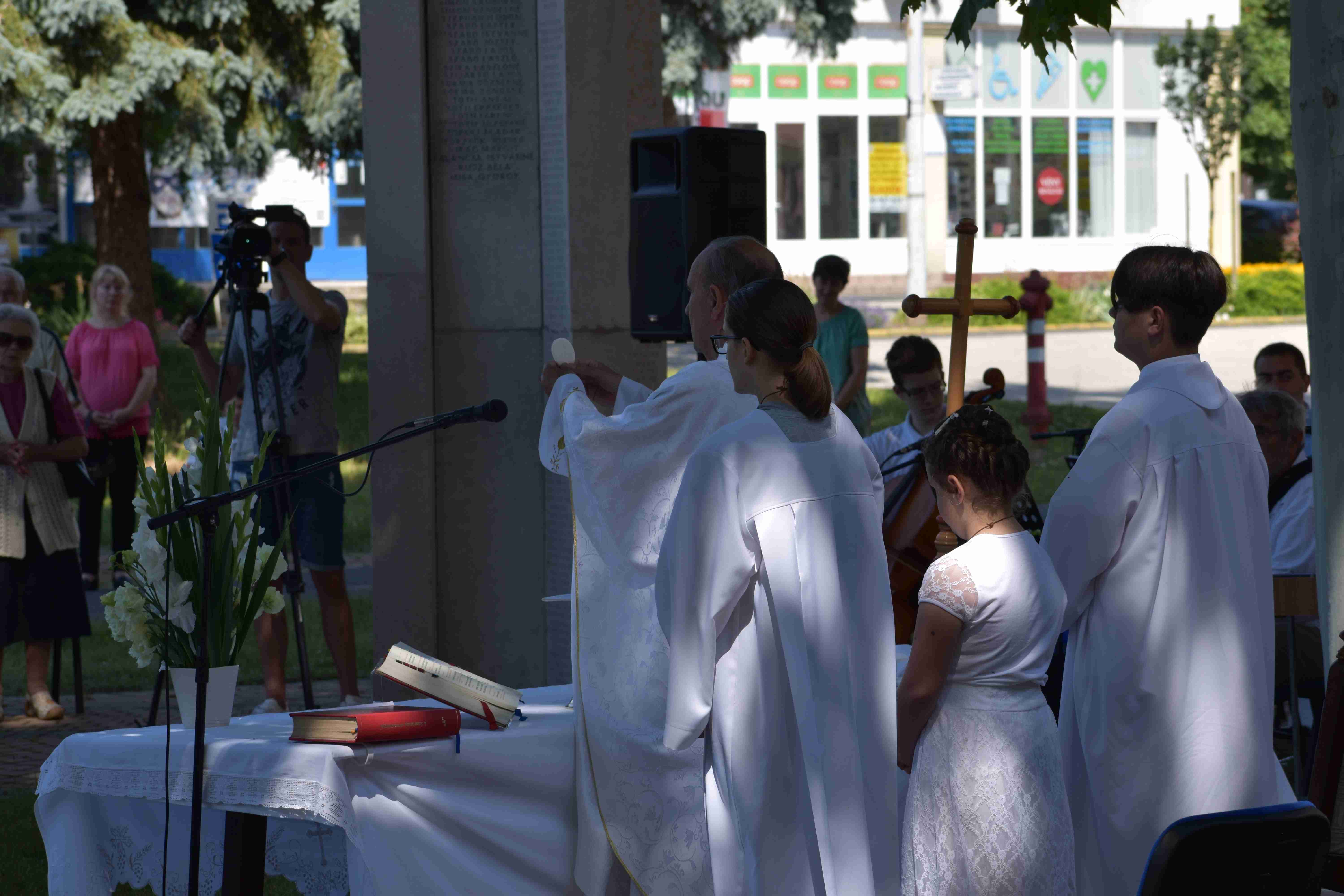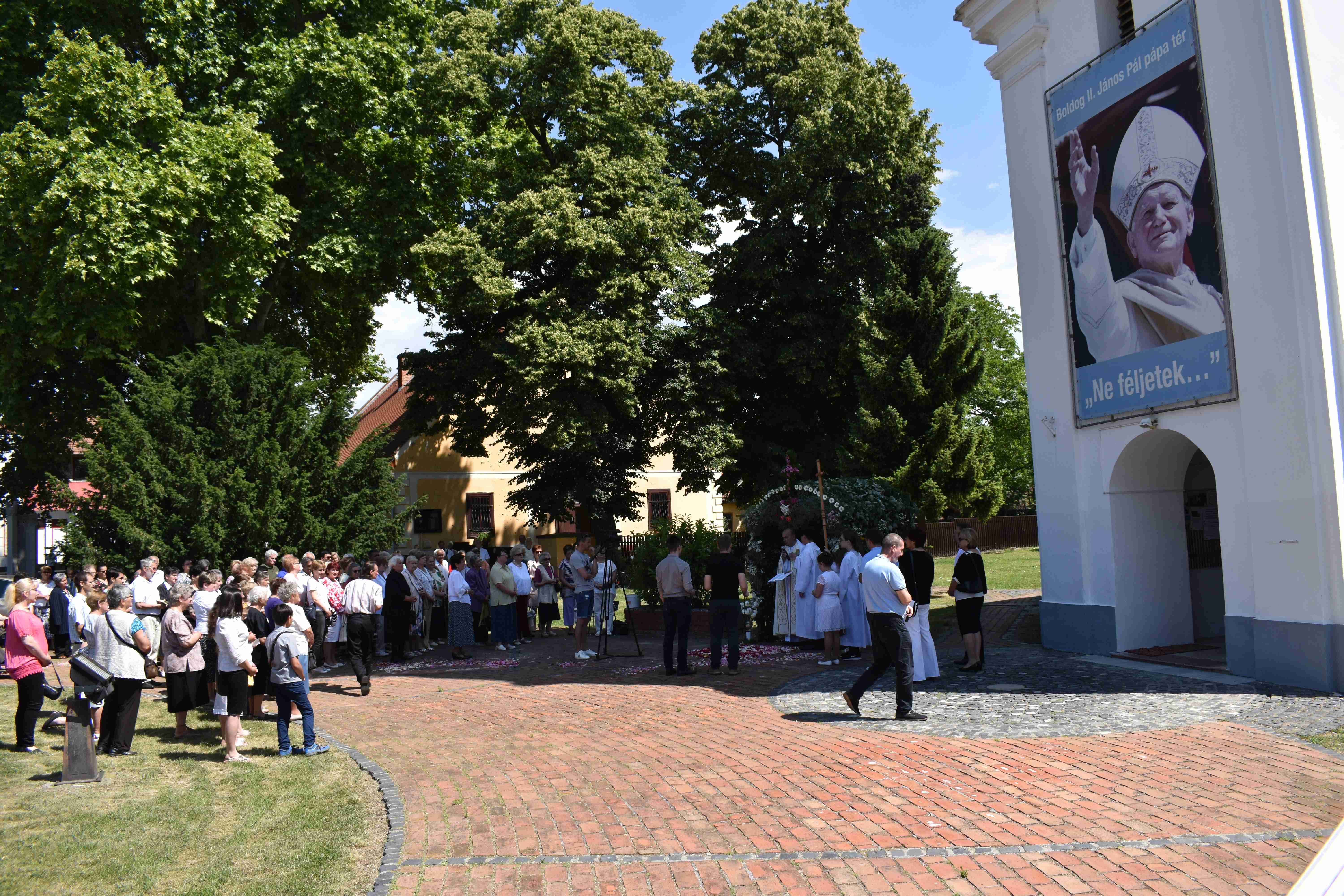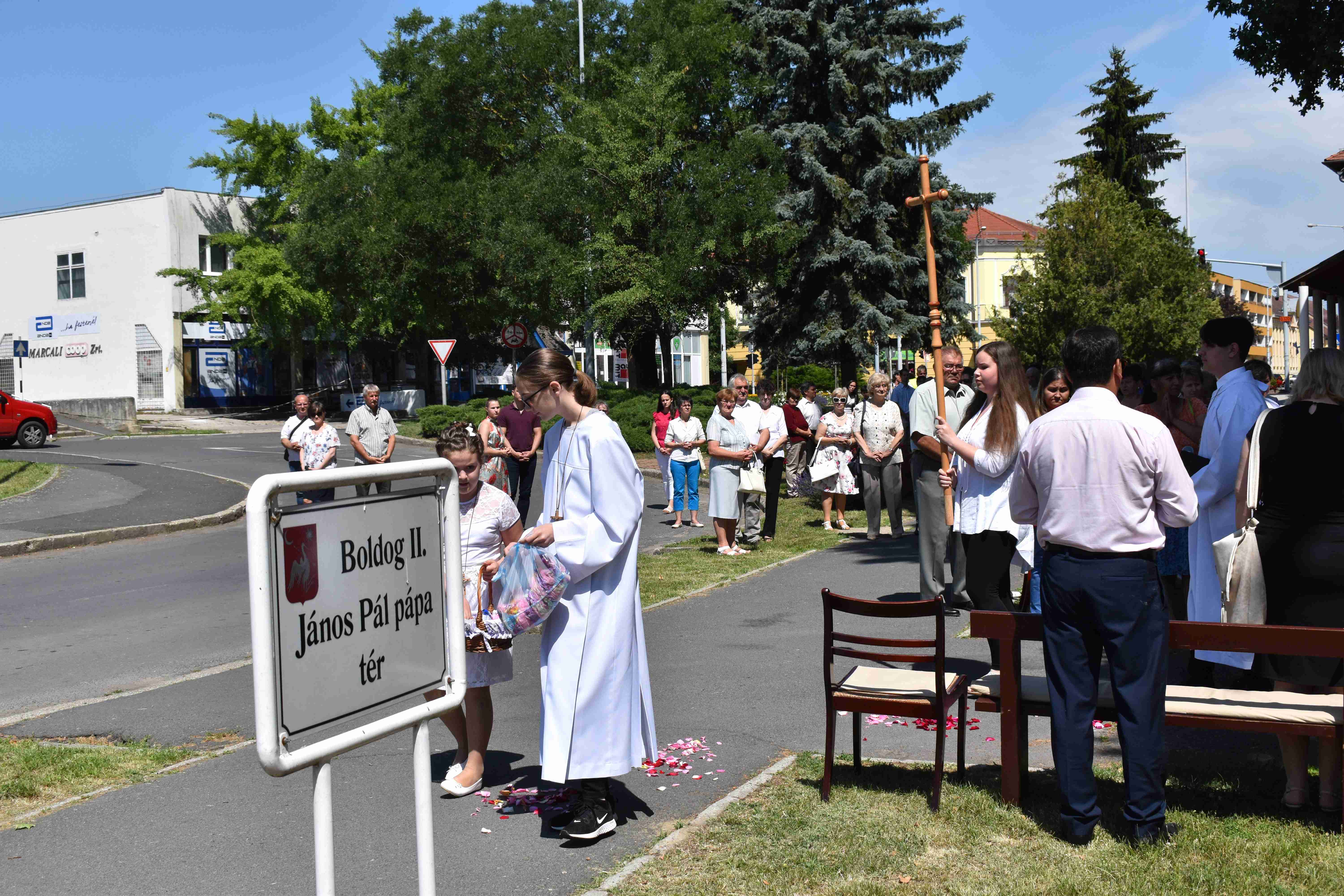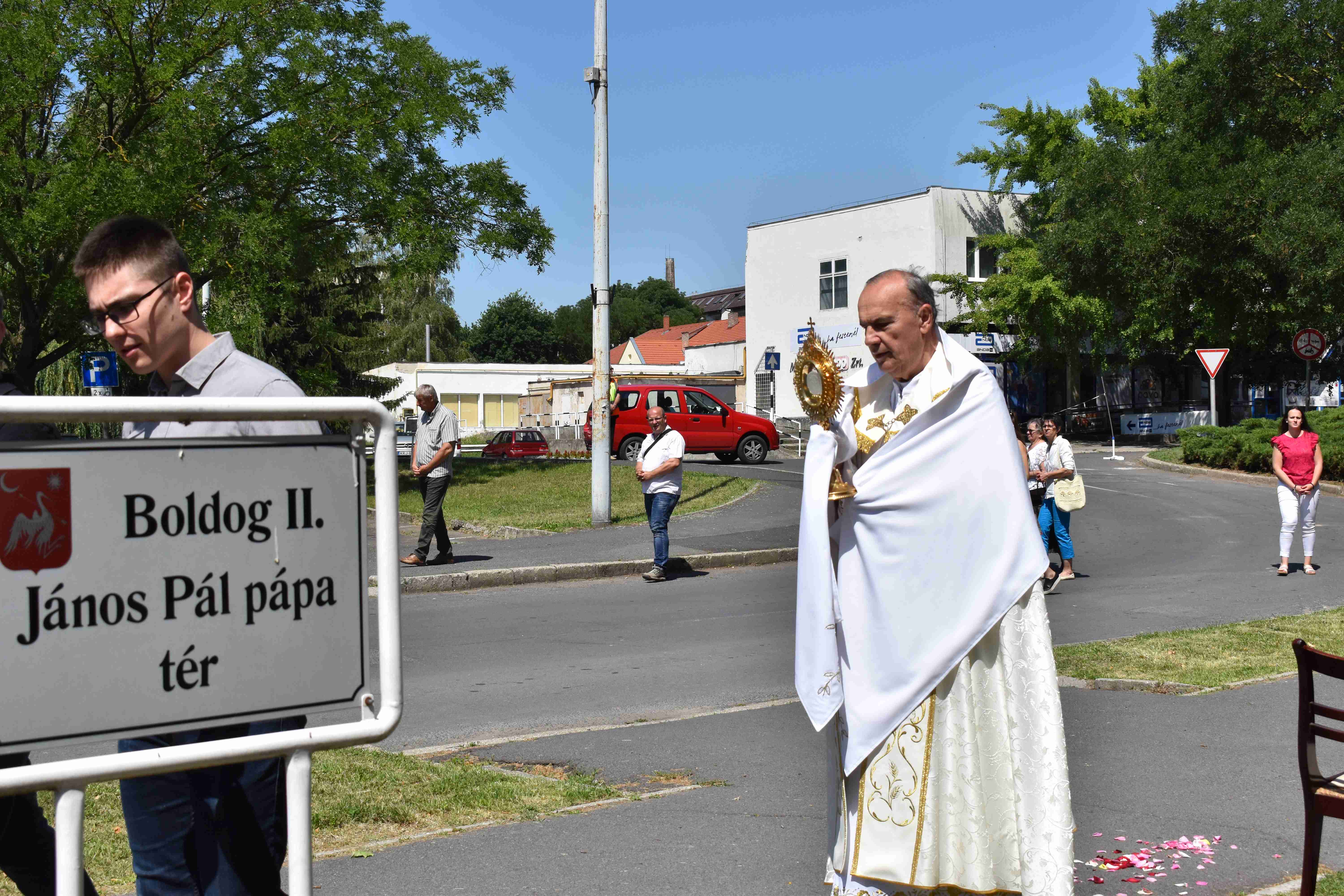 Az ünnepi szentmisét ezúttal a Római KatolikusPlébániahivatalelőtt tartották meg a Hősök terén és Boldog II. János Pál pápa téren az öreg fák árnyékában. Kiss Iván c. prépost, esperes-plébános szentbeszédében az utolsó vacsorán Jézus által alapított Oltáriszentségről beszélt, amikor Jézus a kenyeret az ő testének, a bort pedig az ő vérének nevezte. Az Oltáriszentség a szentmisében jön létre, ahol Krisztus valóságosan van jelen. Úrnapján mindig kiviszik az Oltáriszentséget az utcákra és a terekre, hogy áldást adjanak vele.