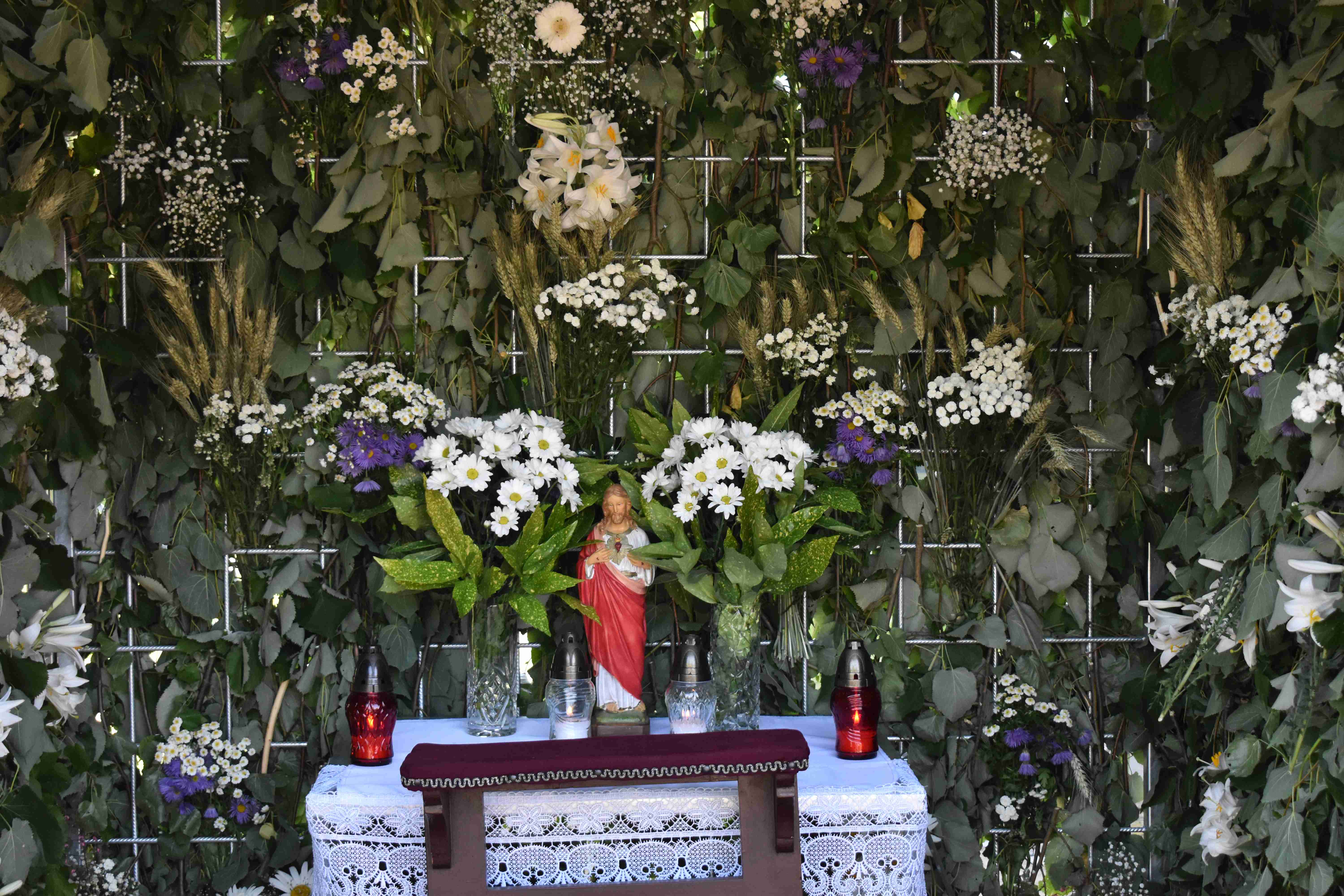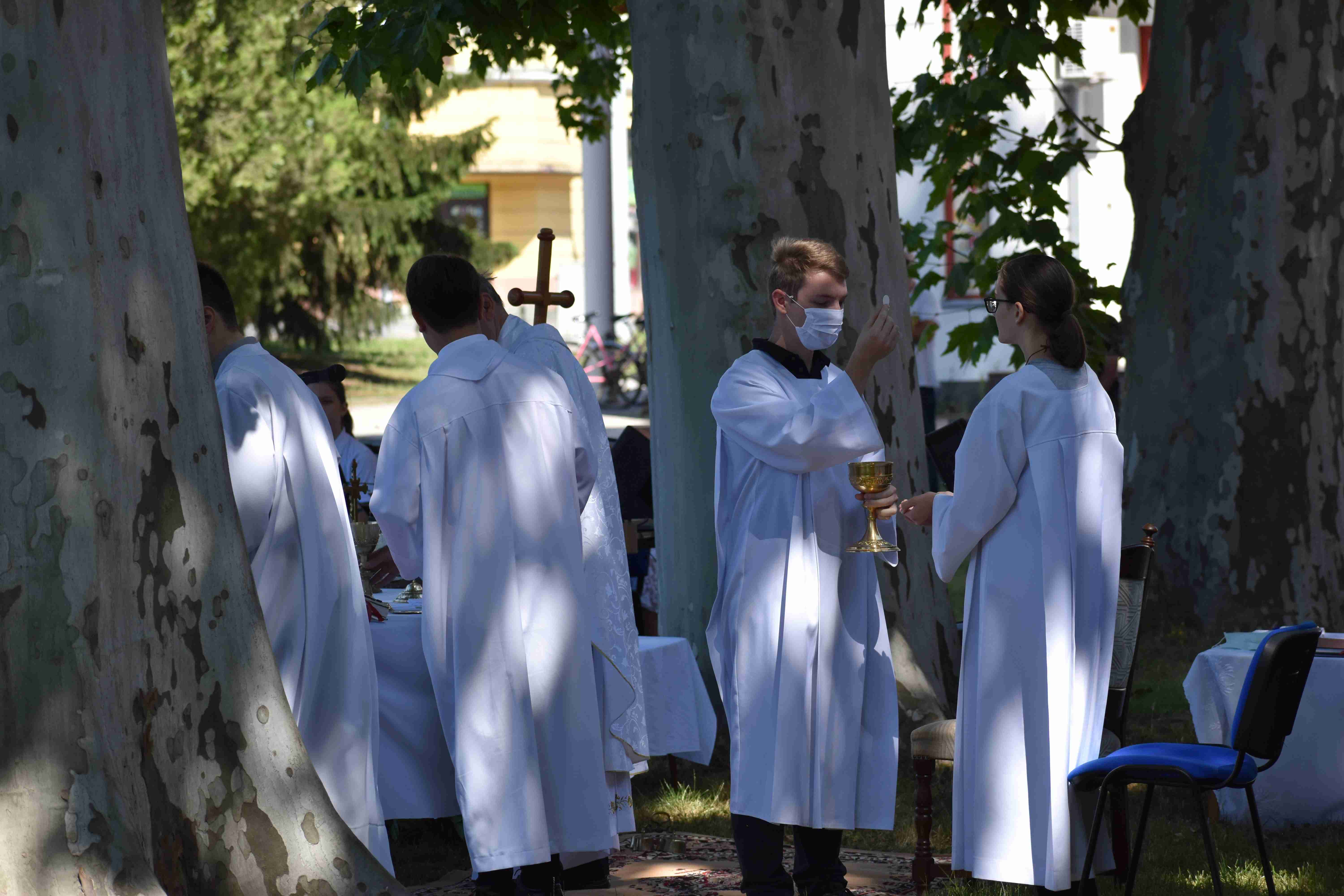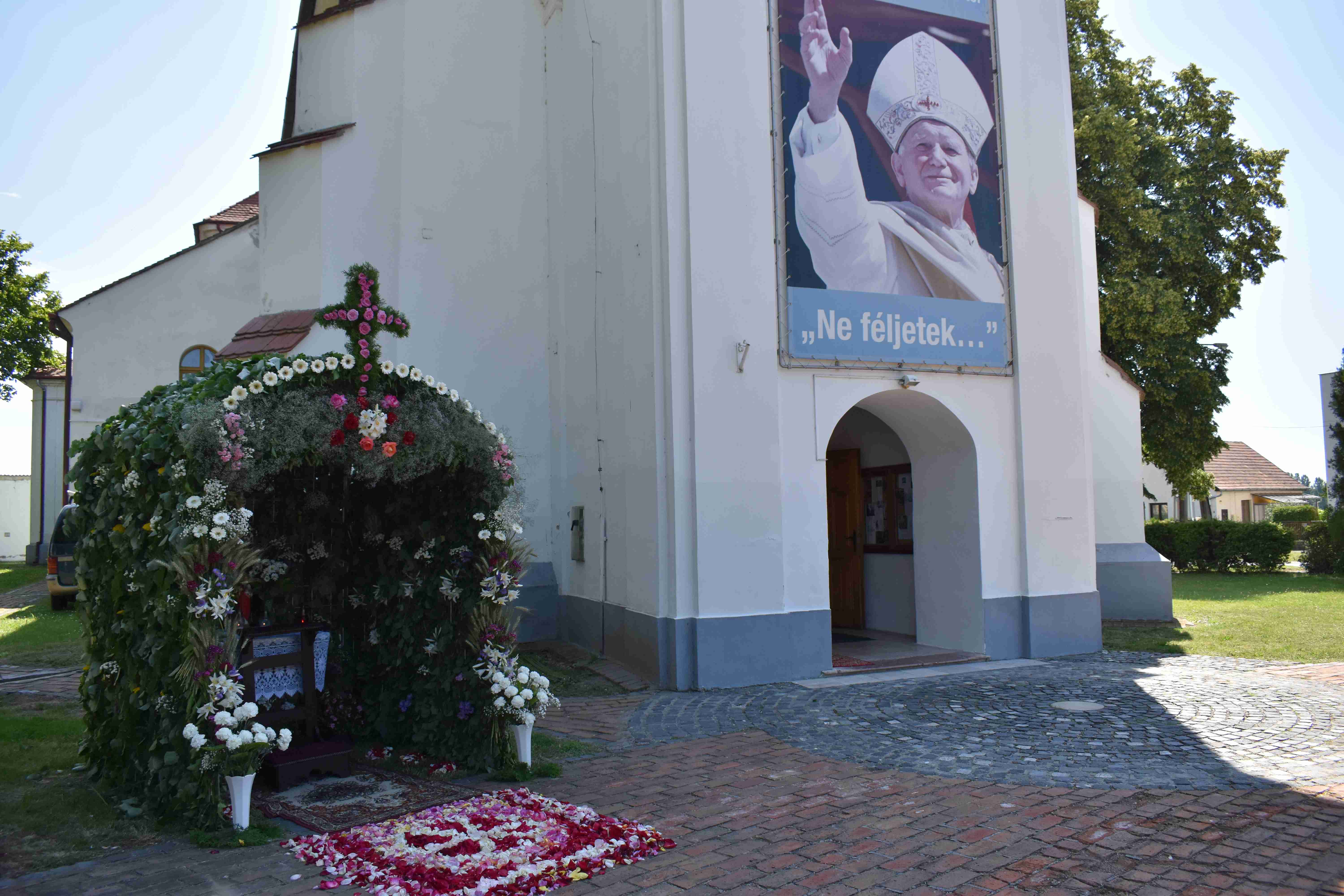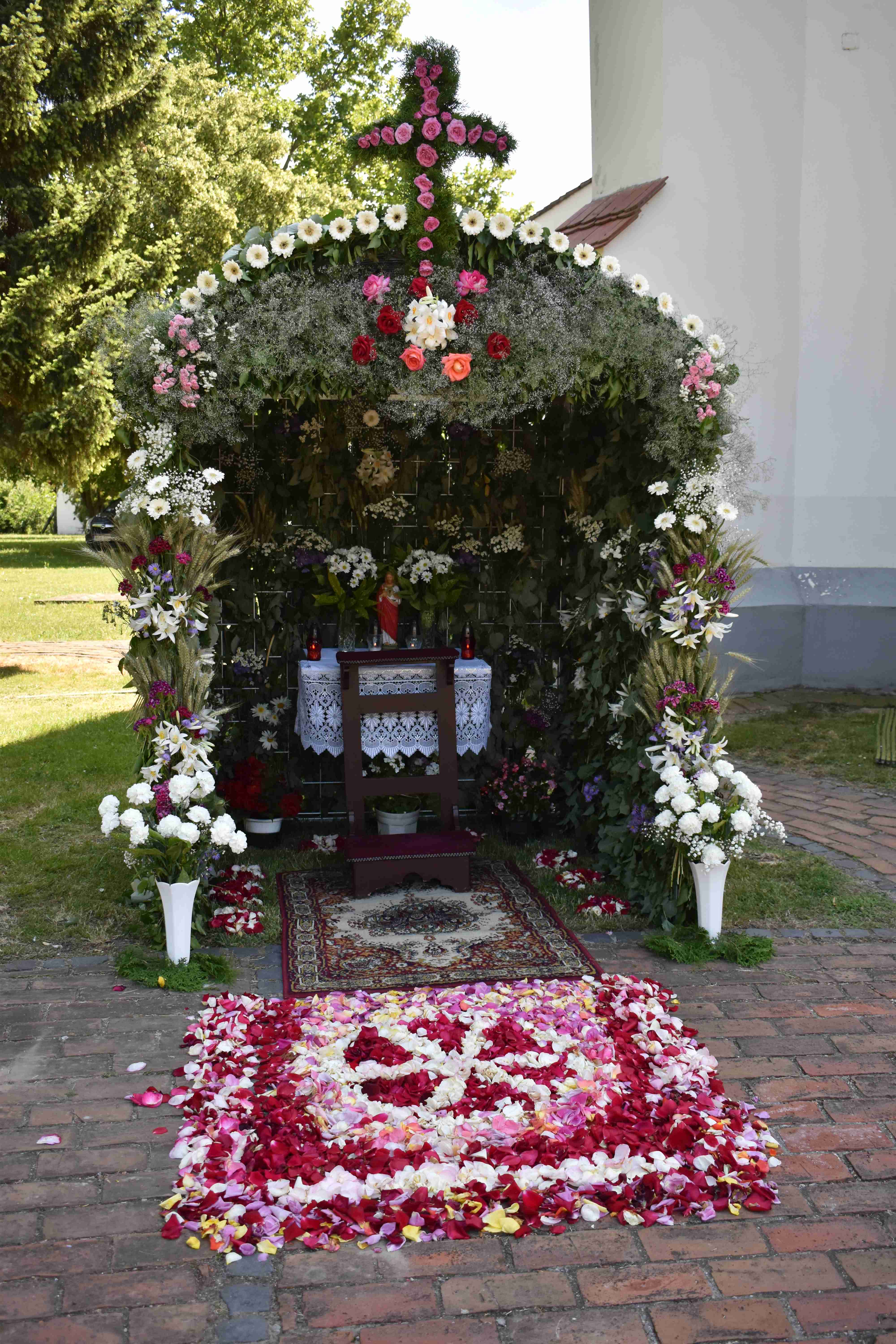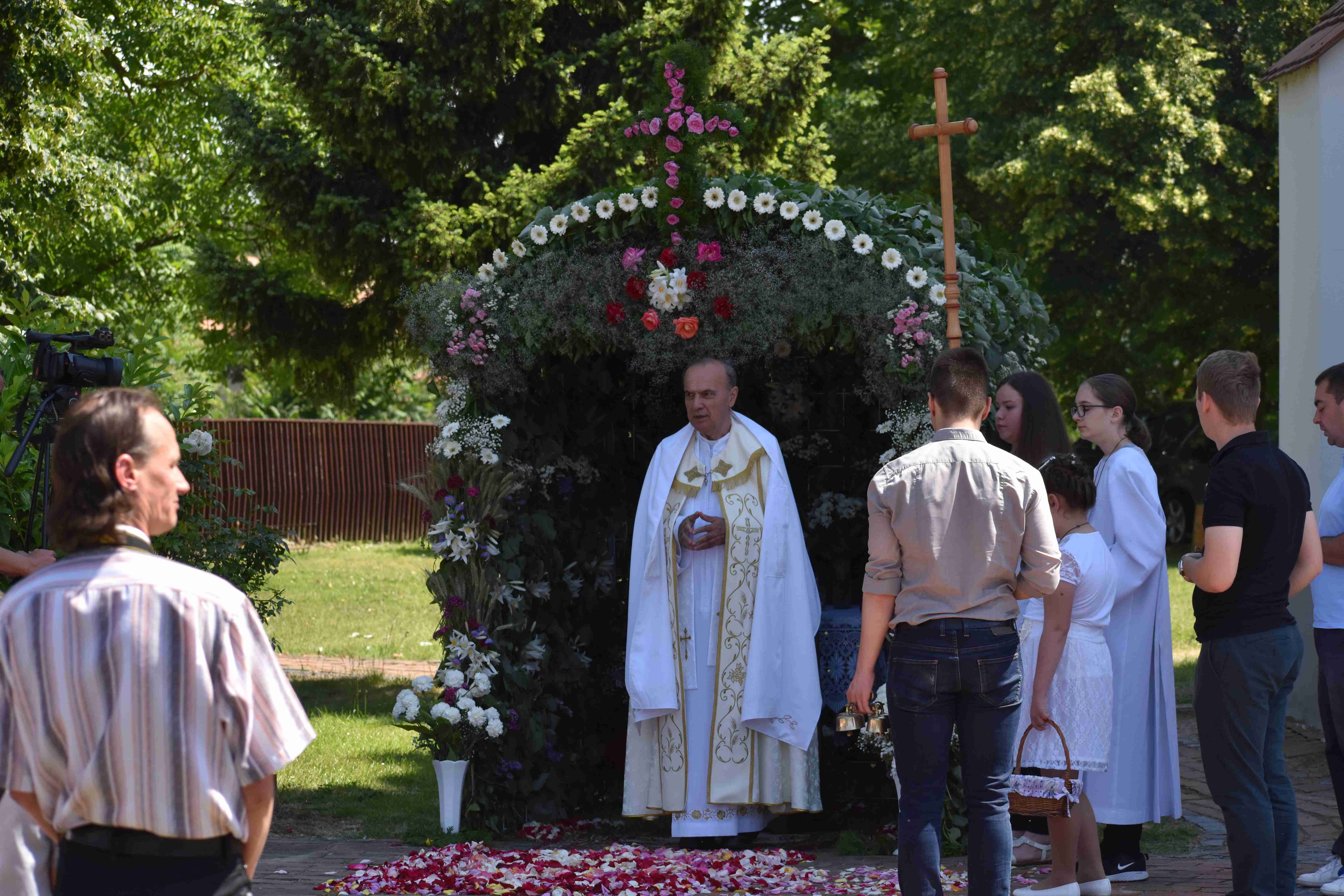 Az idén – a koronavírus-járványra való tekintettel – mindössze egyetlen lombsátrat készítettek el az egyházközség közösségeinek tagjai és díszítettek fel, majd Iván atya egy rövid körmenettel végezte el a liturgiát, s adott áldást a nagy számban megjelent hívekre.