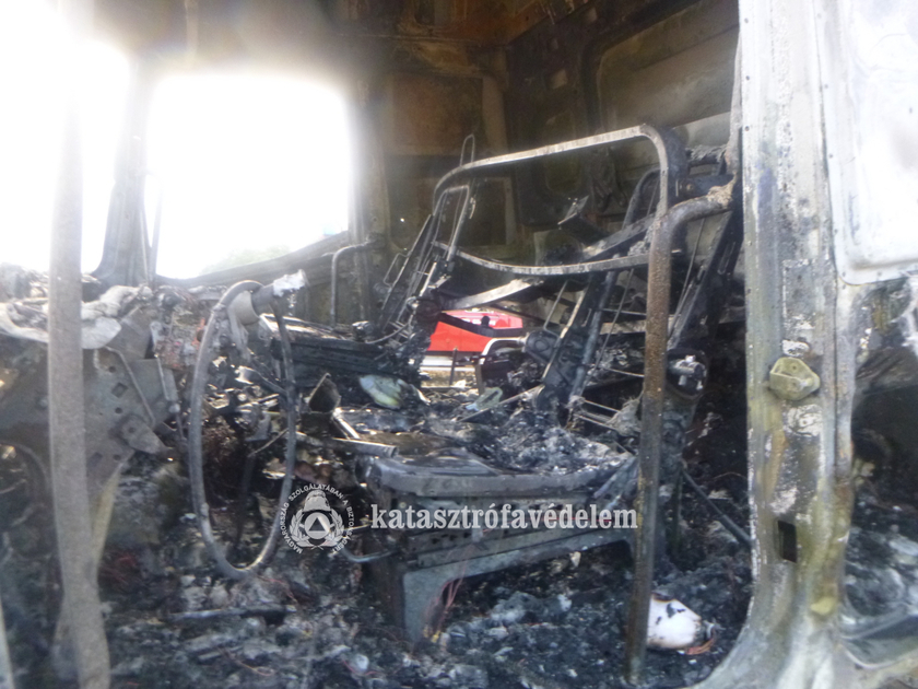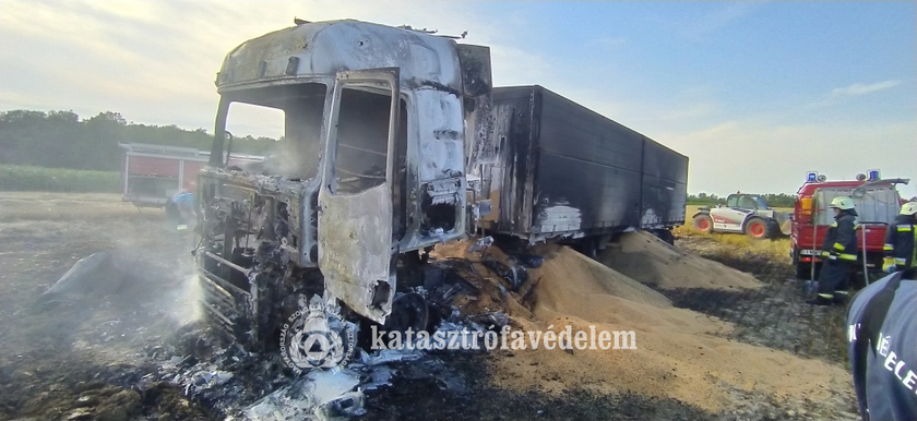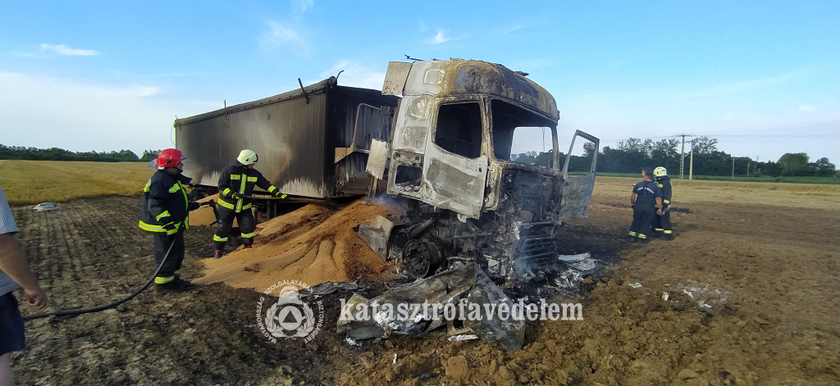 Nem sokkal később kigyulladt és teljes terjedelmében égett egy gabonát szállító kamion Lábod külterületén. A jármű közelében a lábon álló gabona is lángra kapott. A tűzhöz a nagyatádi, a barcsi és a szigetvári hivatásos, valamint a görgetegi és a lábodi önkéntes tűzoltókat riasztották, akik a katasztrófavédelmi műveleti szolgálat irányítása mellett négy vízsugárral és kéziszerszámokkal több, mint három óra alatt tudták teljesen eloltani a lángokat. A tűz körülhatárolásában egy erőgép is segítette az egységek munkáját.