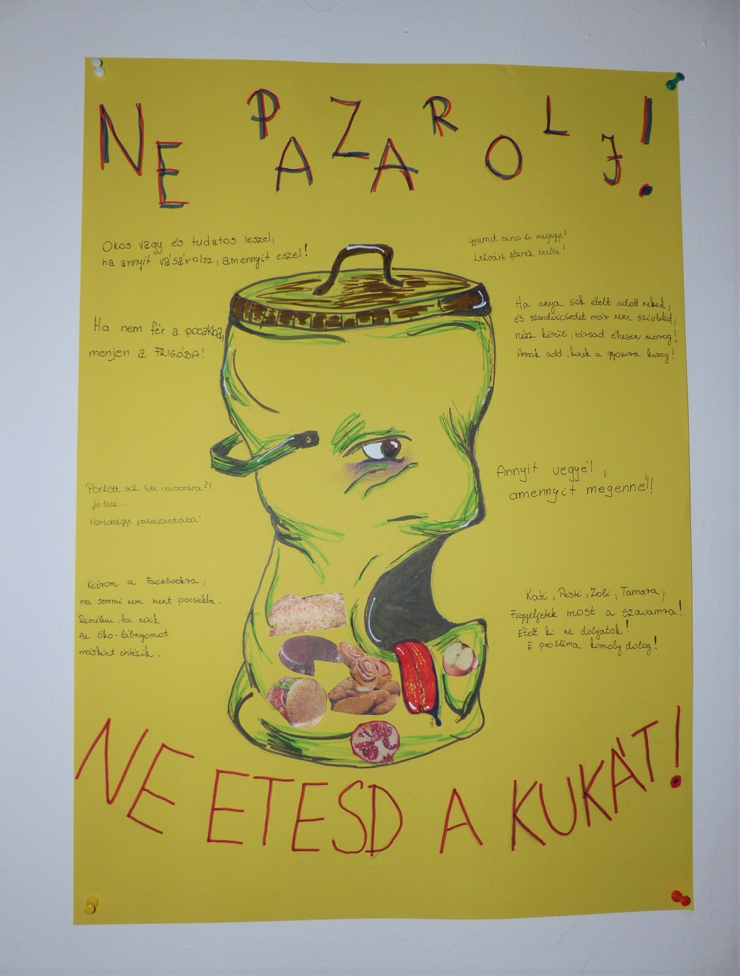 Október 15-én került megrendezésre iskolánkban hagyományos környezetvédelmi- és egészségnevelési témanapunk. A diákok különböző filmeket nézhettek meg a környezetvédelemmel kapcsolatban, illetve osztályok közötti vetélkedő keretén belül mérhették össze tudásukat. Számos érdekes feladatot kellett megoldaniuk, kiszámolhatták az ökológiai lábnyomukat, valamint készíteniük kellett egy plakátot, aminek a témája „Élj marad éktalanul!” volt.A legjobban teljesítő, legügyesebben dolgozó osztályok jutalomban részesültek.