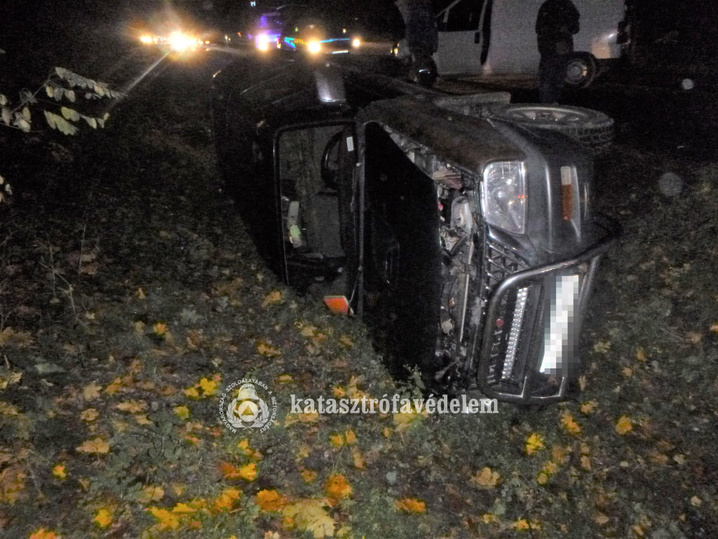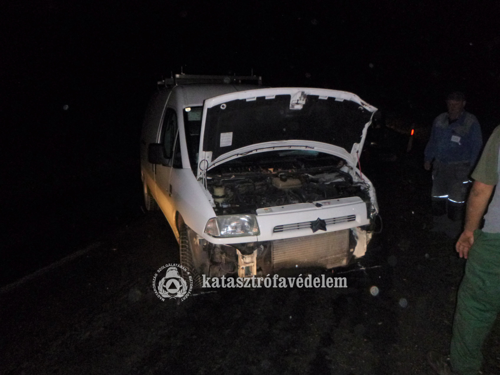Nem sokkal később összeütközött két gépkocsi a 68-as főút Lábod és Nagyatád közötti szakaszán. Az ütközés következtében az egyik gépjármű az árokba hajtott és az oldalára borult. A nagyatádi hivatásos tűzoltók áramtalanították a járműveket és kerekeire állították a felborult autót.