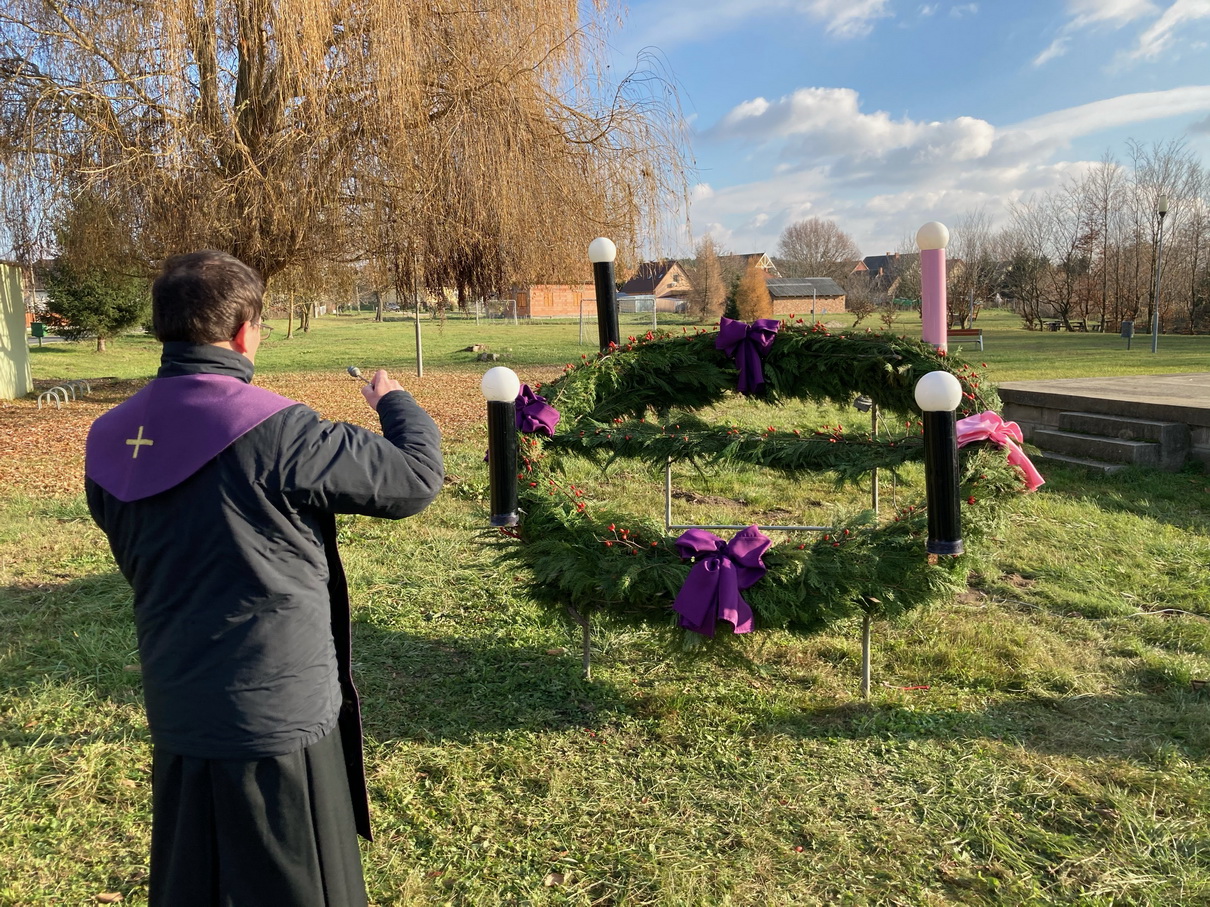 A szentmisét követően megáldotta a játszótéren felállított adventi koszorút is, melyen az első gyertya fénye már világít.