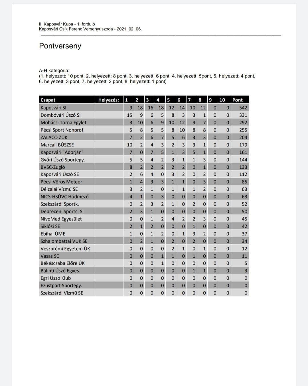 A négy fordulóból álló pontgyűjtés első fordulója után az összesített csapatversenyben a Marcali Úszó- és Szabadidő Sportegyesület az előkelő 6. helyen áll.