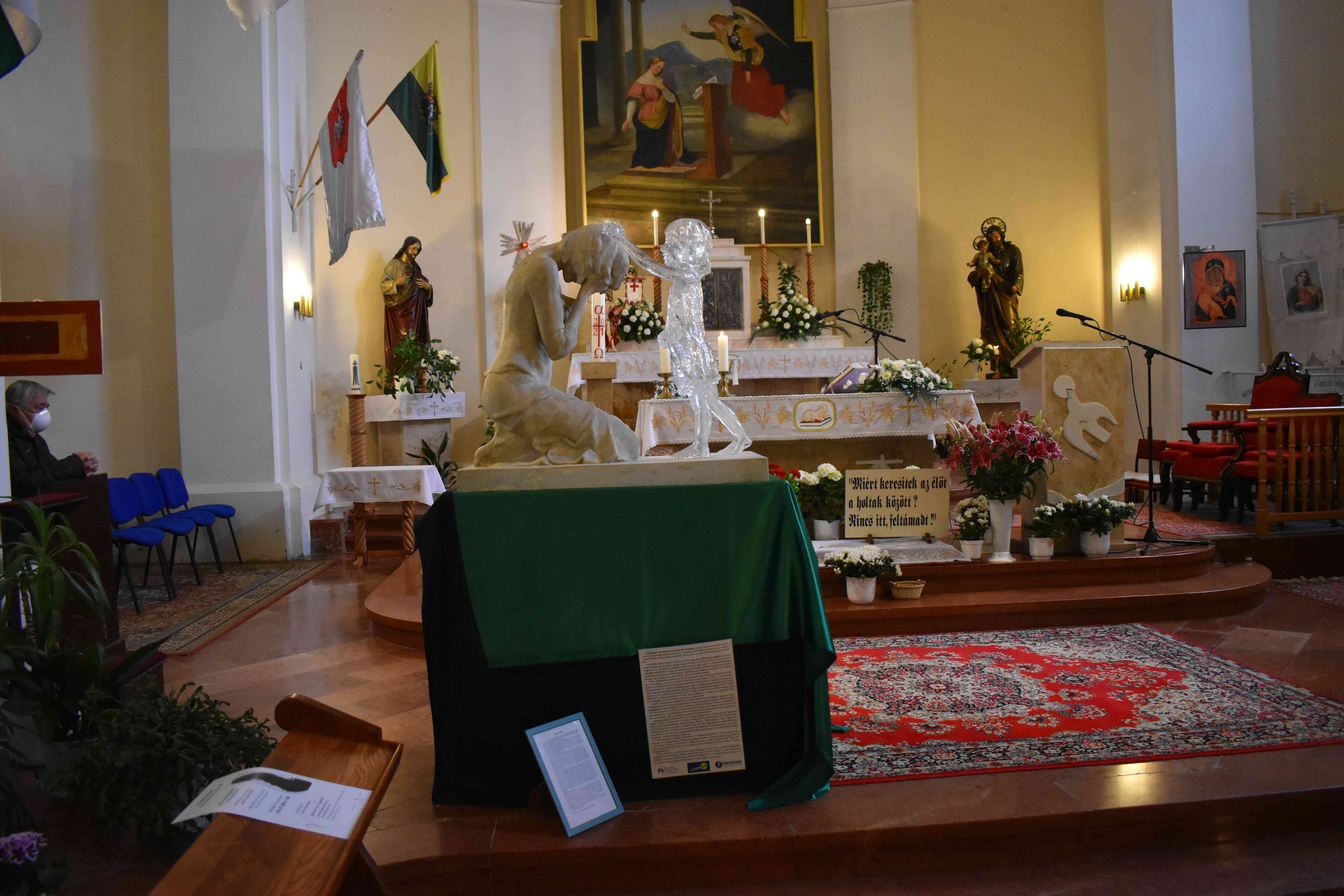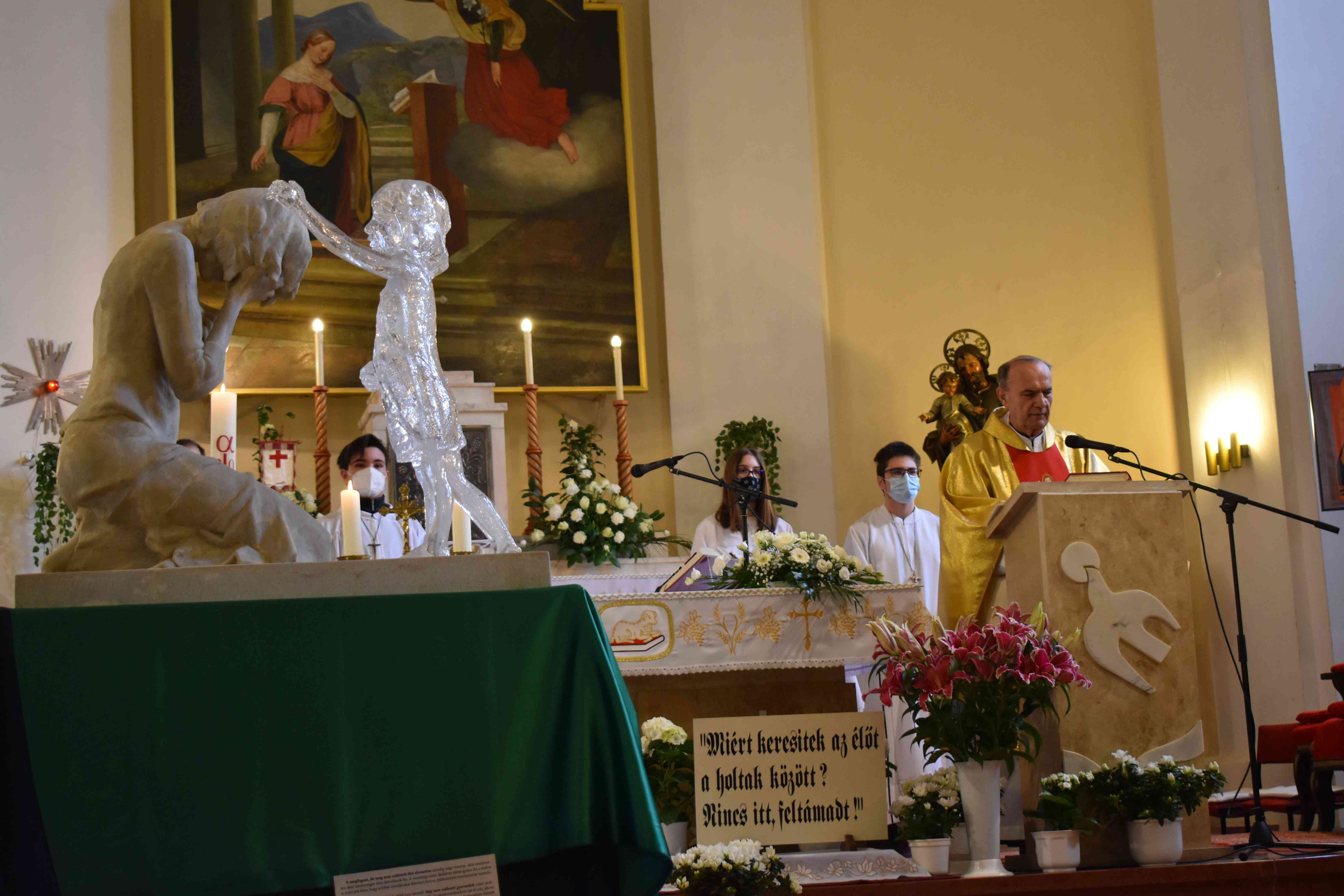 Az ünnepi nyitó szentmise április 11-én, vasárnap 10 órakor kezdődött, melyet Kiss Iván c. prépost, esperes-plébános celebrált. Bevezetőjében elmondta, hogy az alkotást Martin Hudáček, szlovák szobrászművész készítette abból a célból segítsen a világ minden táján a nőknek és családjuknak a múlt sebeinek feldolgozásában. A megbocsátást hirdető szobor nők ezreinek adta vissza a már-már elfeledett lelki békét. A meg nem született gyermek emléke sokaknak mindennap visszatérő fájdalom, amiről alig mernek beszélni. A szoborral való találkozás enyhülést nyújt ezekre a sebekre, és segít feldolgozni az abortuszok emlékét.