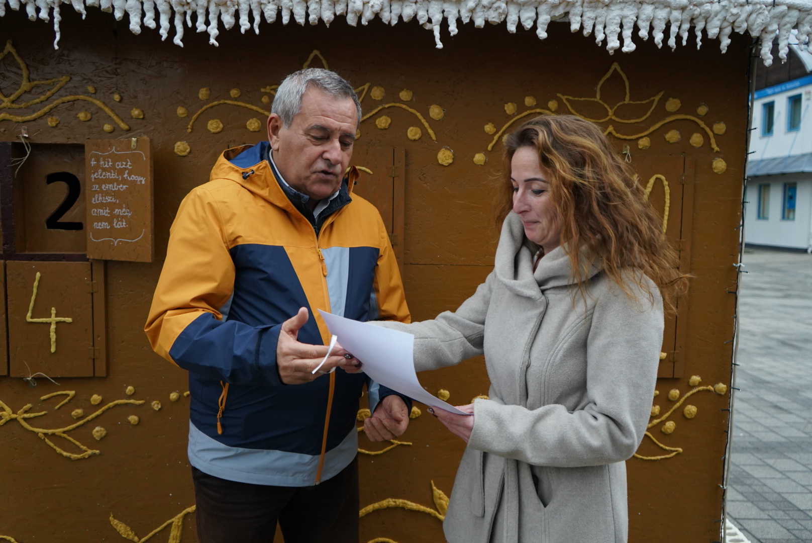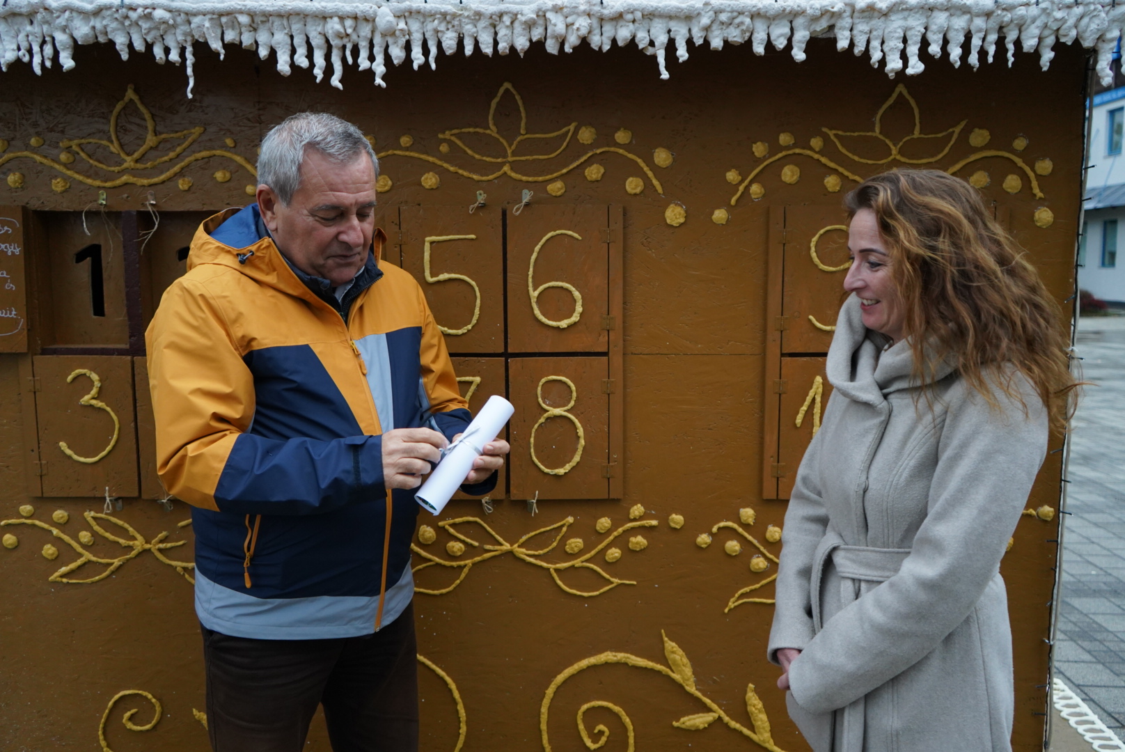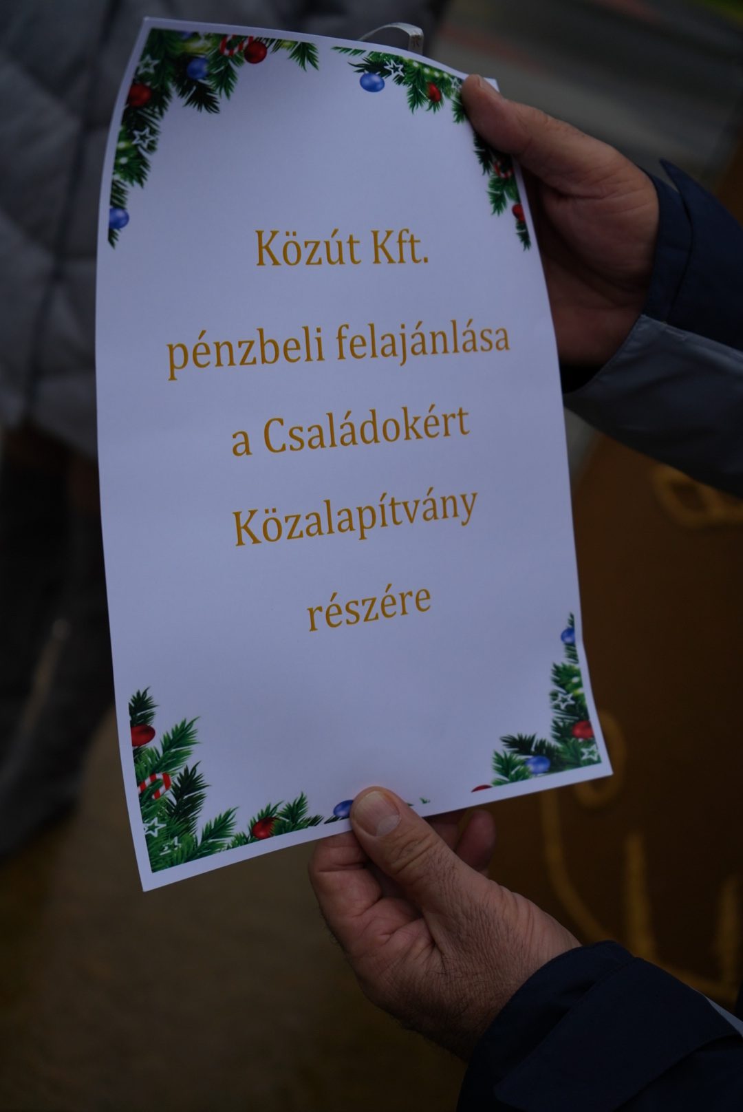 A Közút kft pénzbeli felajánlását a Családokért Közalapítvány képviselője vette át. December 24 -ig naponta nyílnak az ablakok, melyek ajándékokat rejtenek városi és szociális intézmények számára.