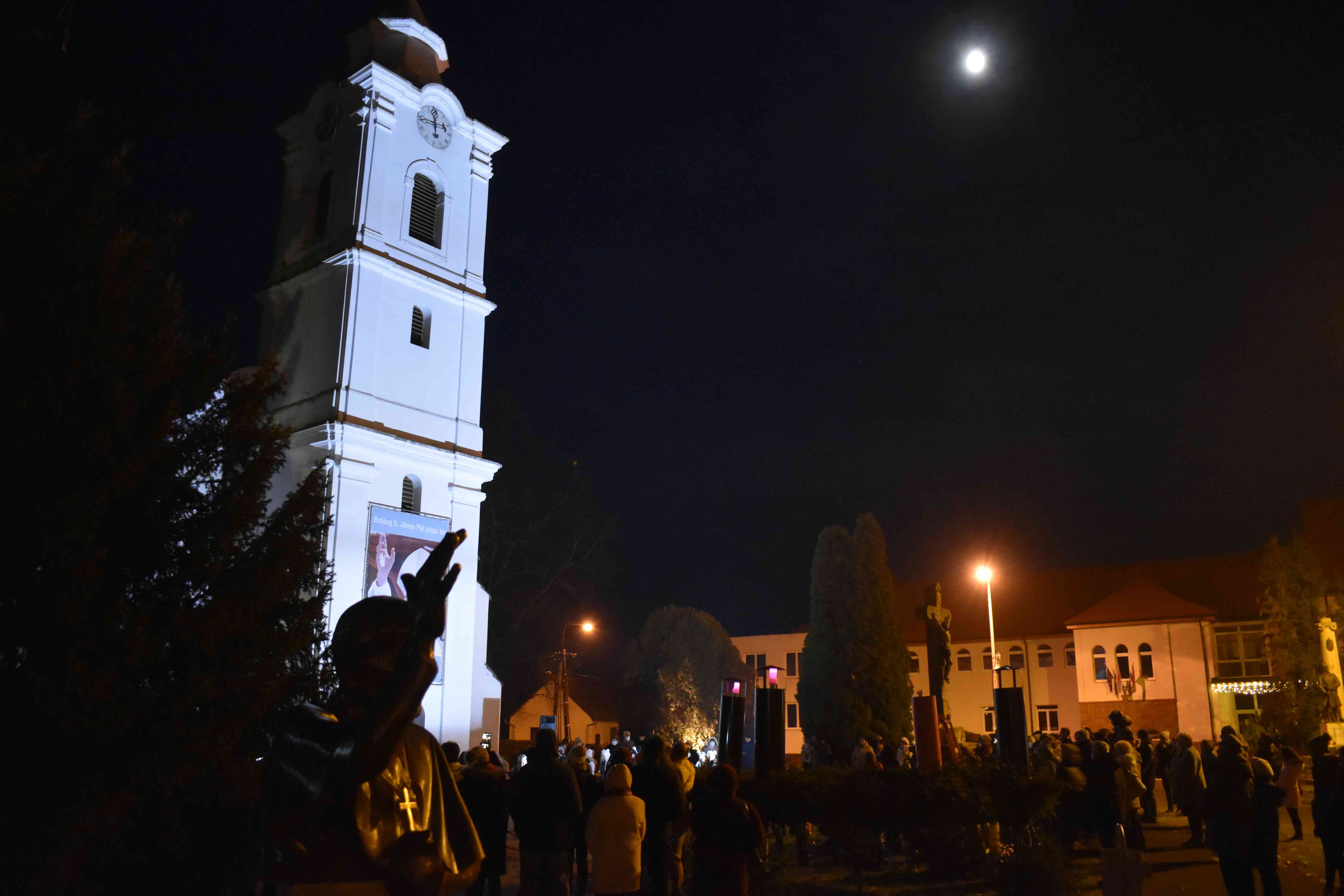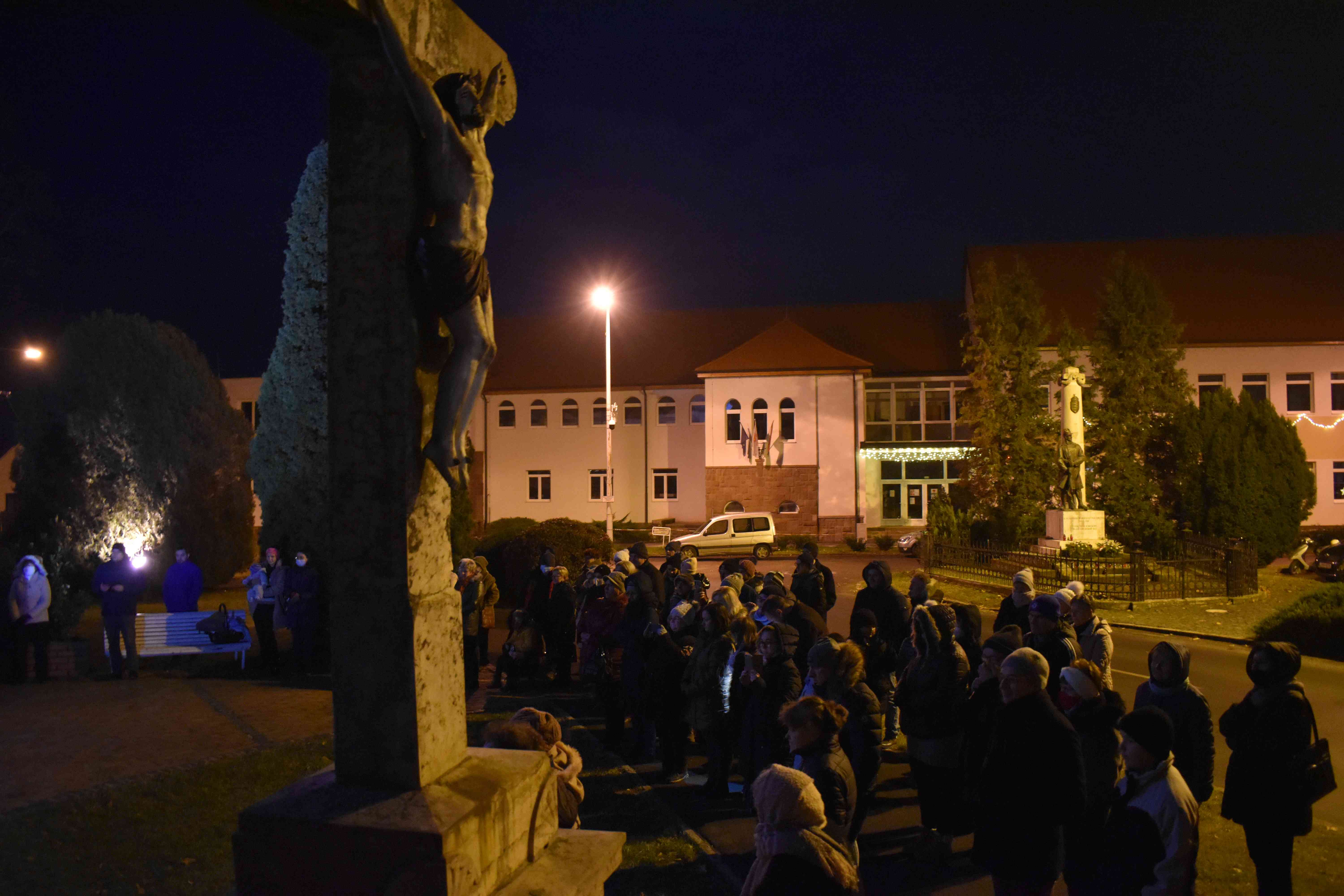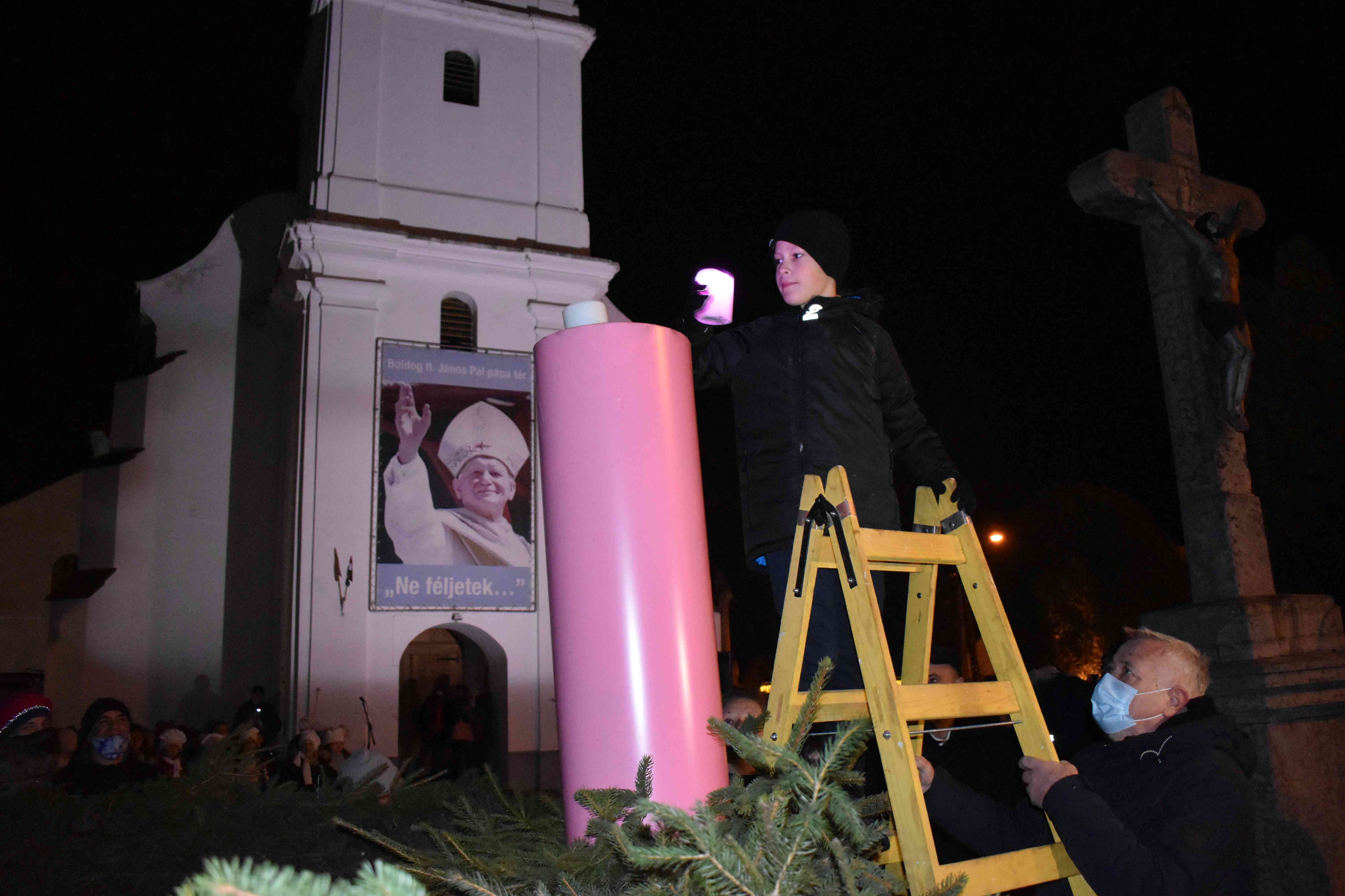 Végül Iván atya és Jobbágyné Szarka Tímea igazgatónő kíséretében Dávid Áron, az iskola egyik diákja gyújtotta meg és helyezte el a koszorún a rózsaszínű gyertyát.
