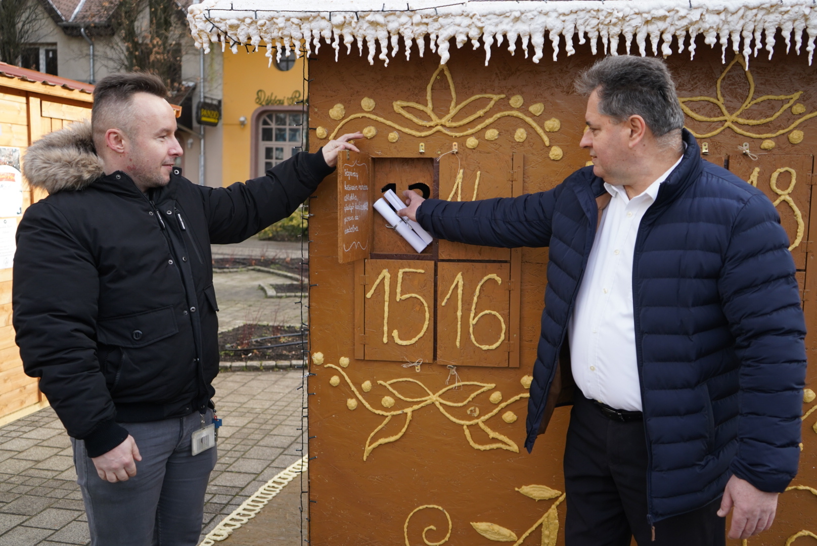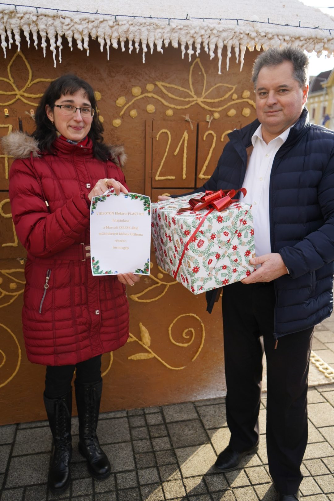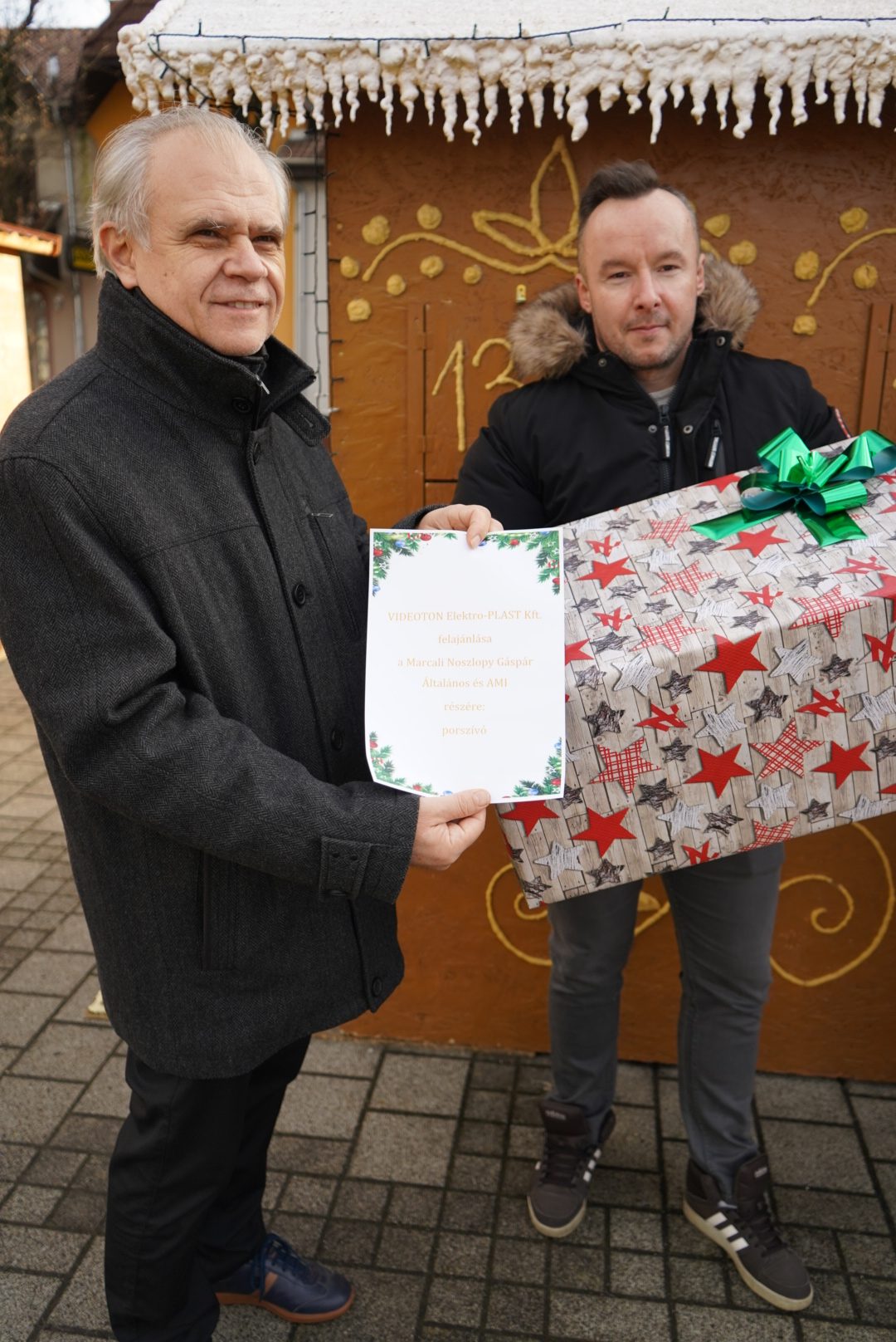 Samu Tibor, a VIDEOTON Elektro-PLAST Kft. marcali telephelyének vezetője, valamint Gyimesi Attila, a cég marcali üzemének vezetője nyitotta ki az ablakot és adta át a cég ajándékait a Marcali SZESZK által működtetett Idősek Otthona vezetőjének, Bereczk Bernadettnek, valamint a Marcali Noszlopy Gáspár Általános és Alapfokú Művészeti Iskola megbízott igazgatójának, Patkó Imrének.