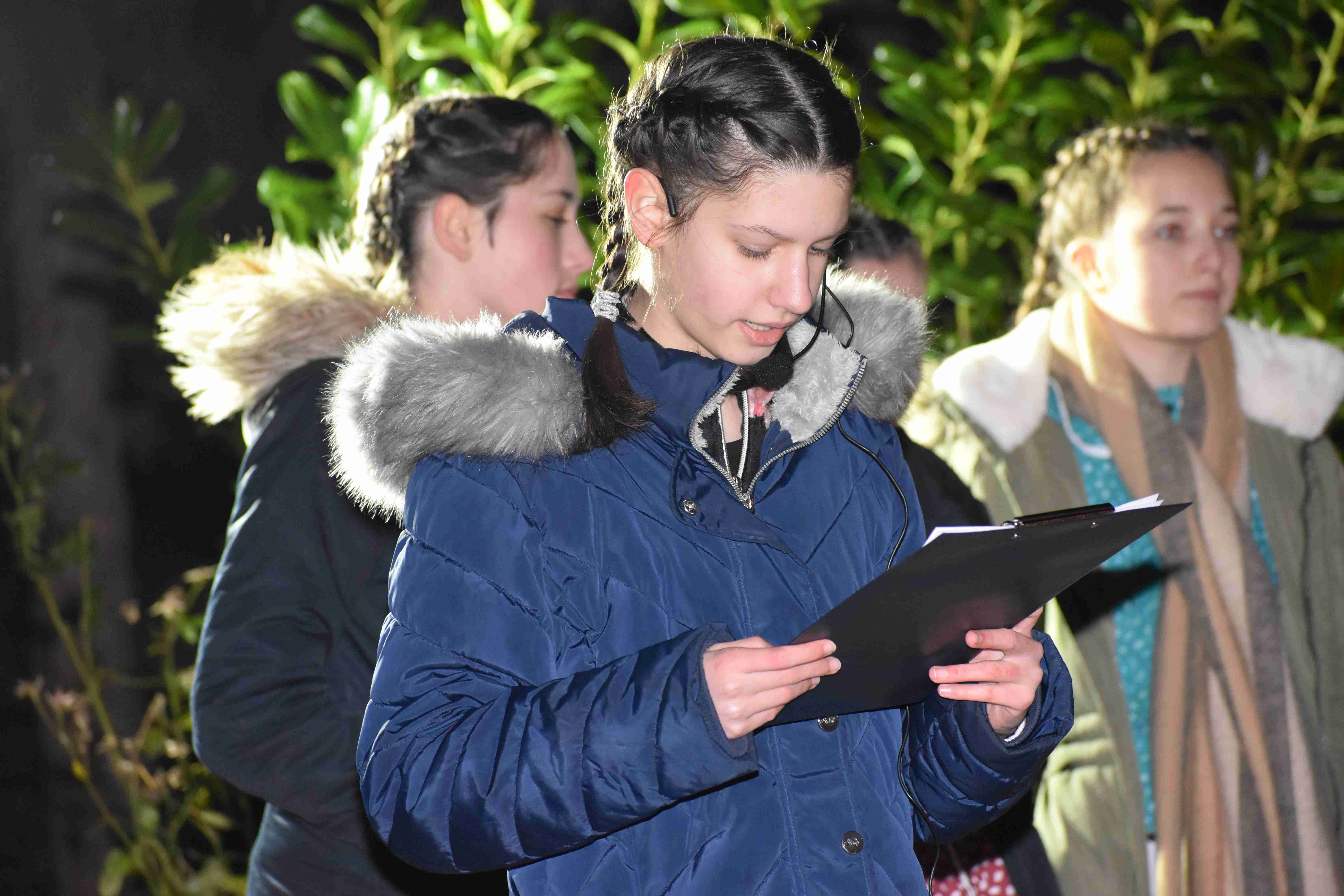 Végül az utolsó, a negyedik lila színű gyertyát Iván atya és Patkó Imre igazgató kíséretében Bohár Zsófia, az iskola egyik tanulója gyújtotta meg és helyezte el a koszorún.
